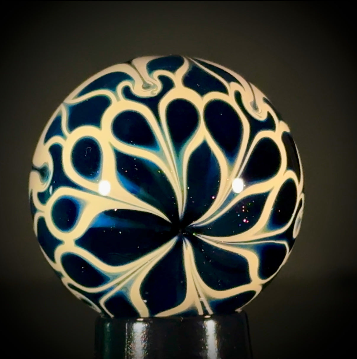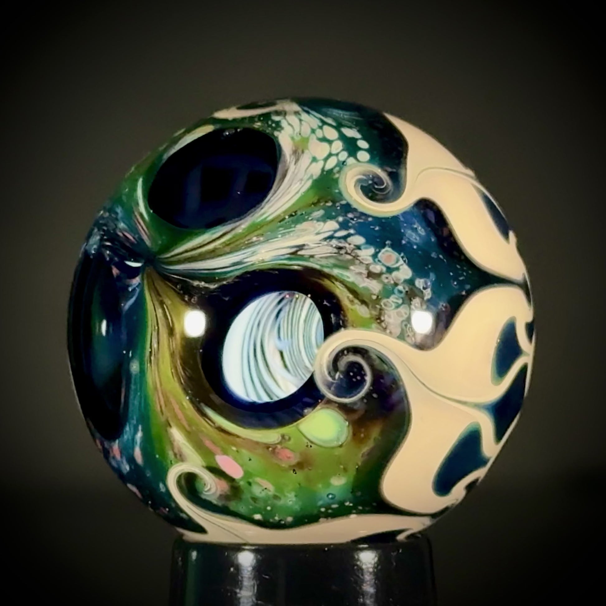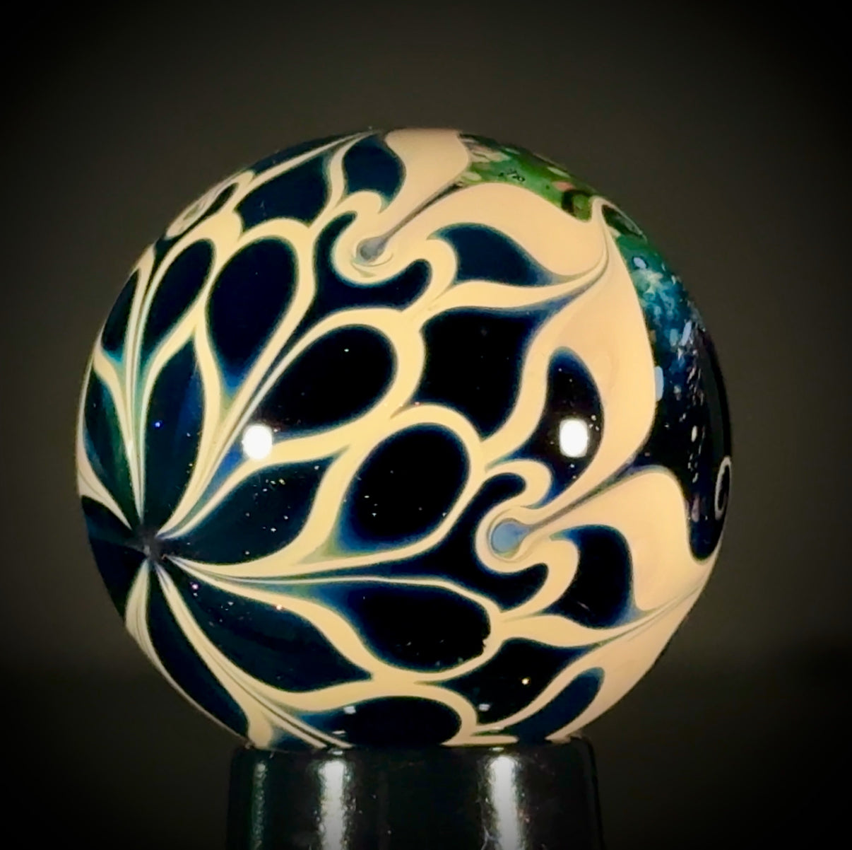 43mm Solo Tri-StarPortal reveals a Retti w/Dichro Galaxy deep inside. Caramel and Galaxy Black (sparkle) overlapping dots adorn the backing. Signed "N8-24, and includes a stand and cleaning cloth.
