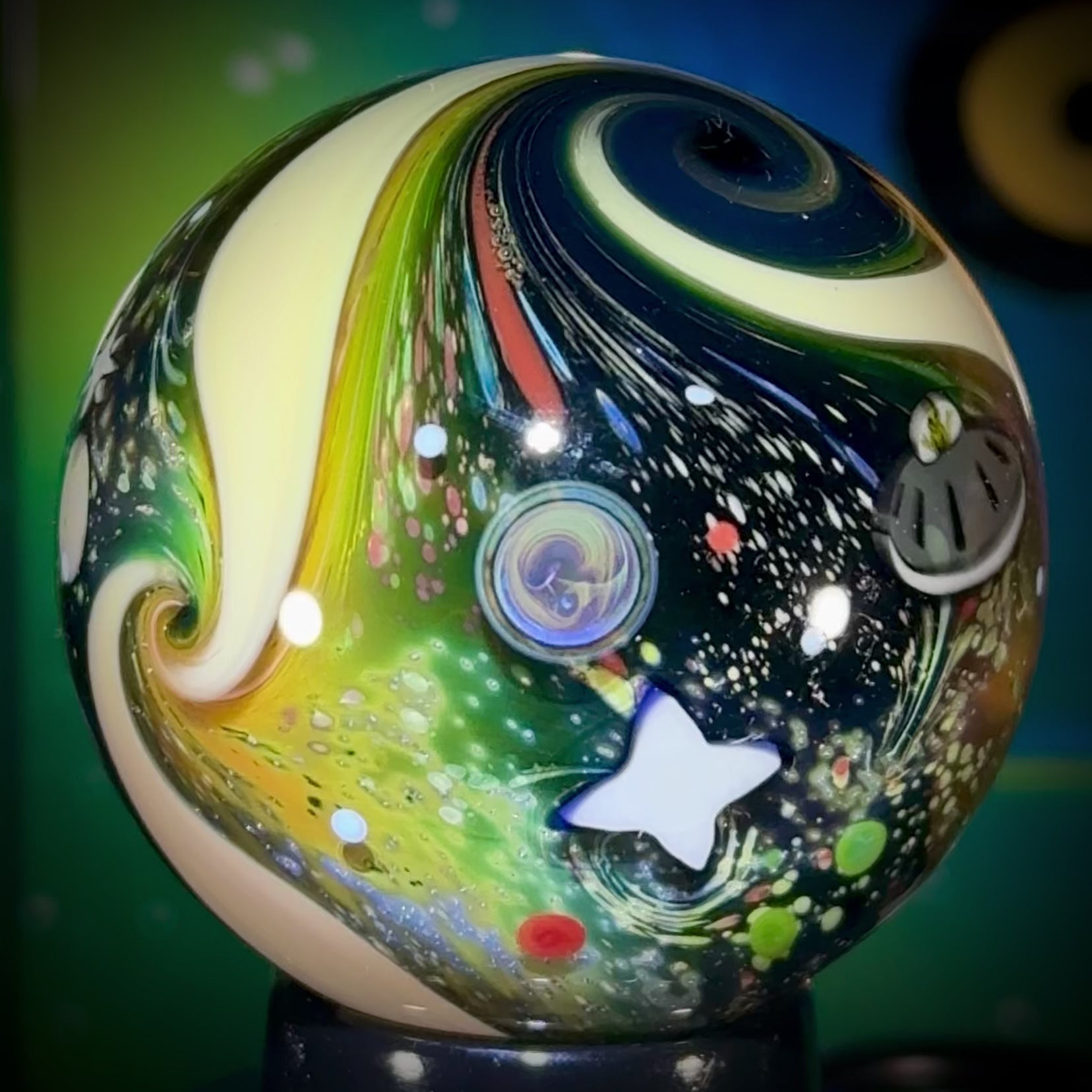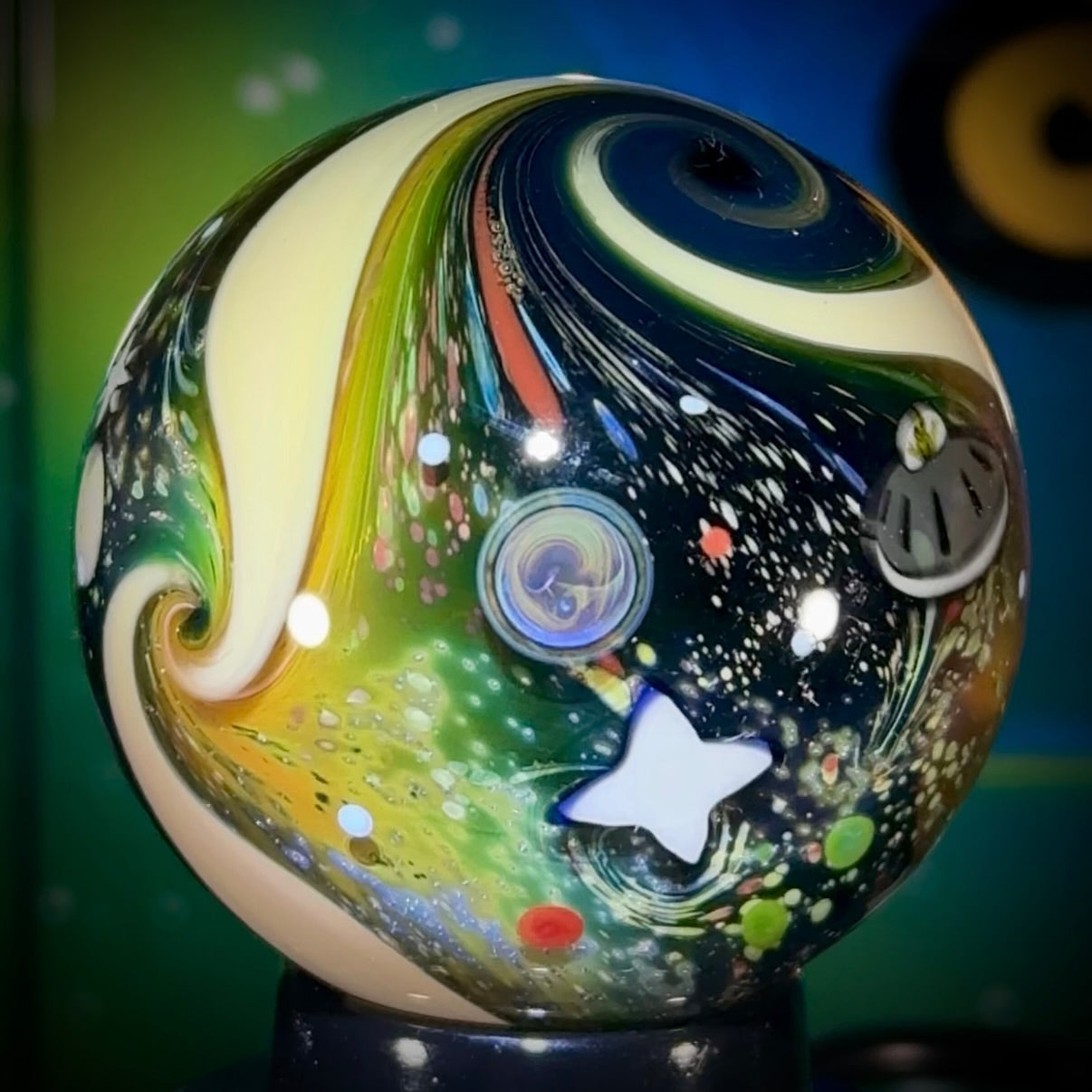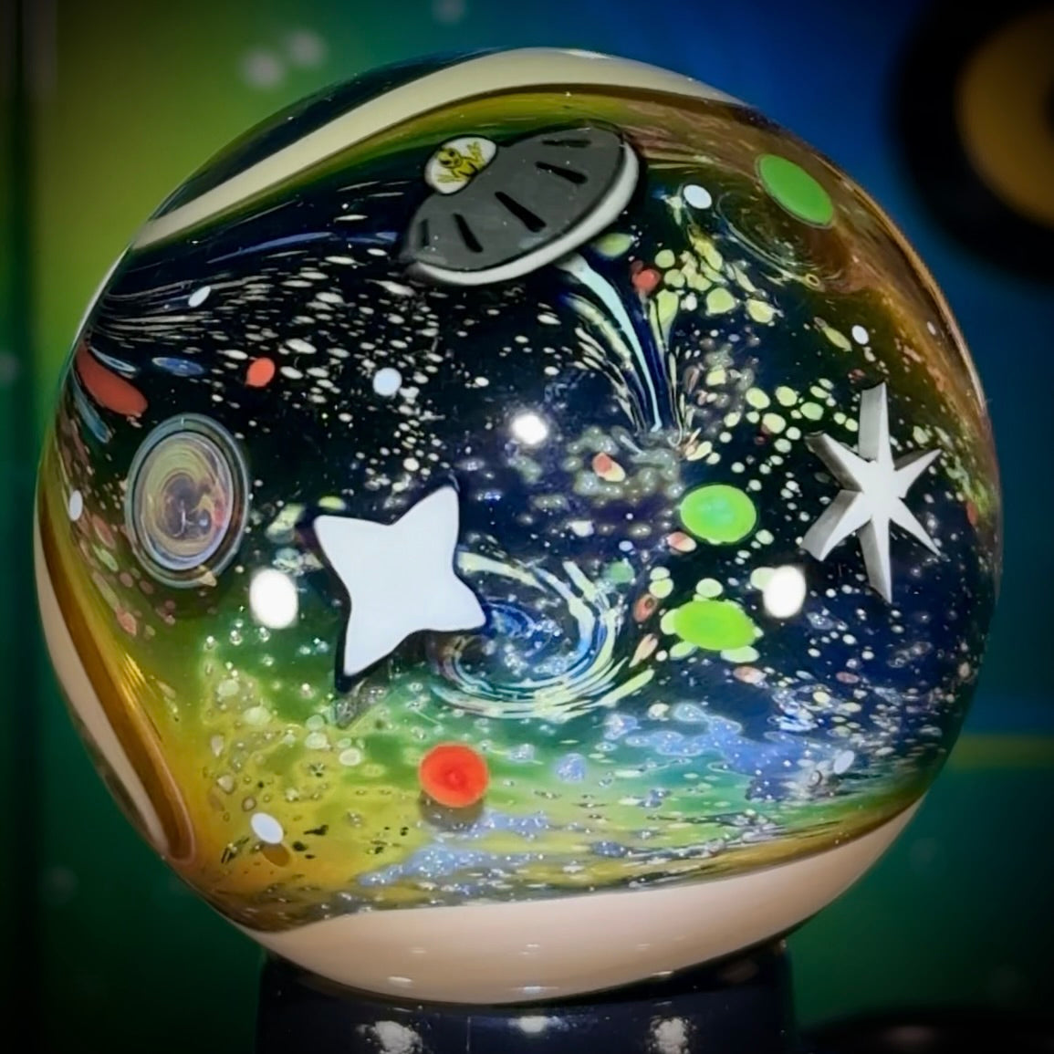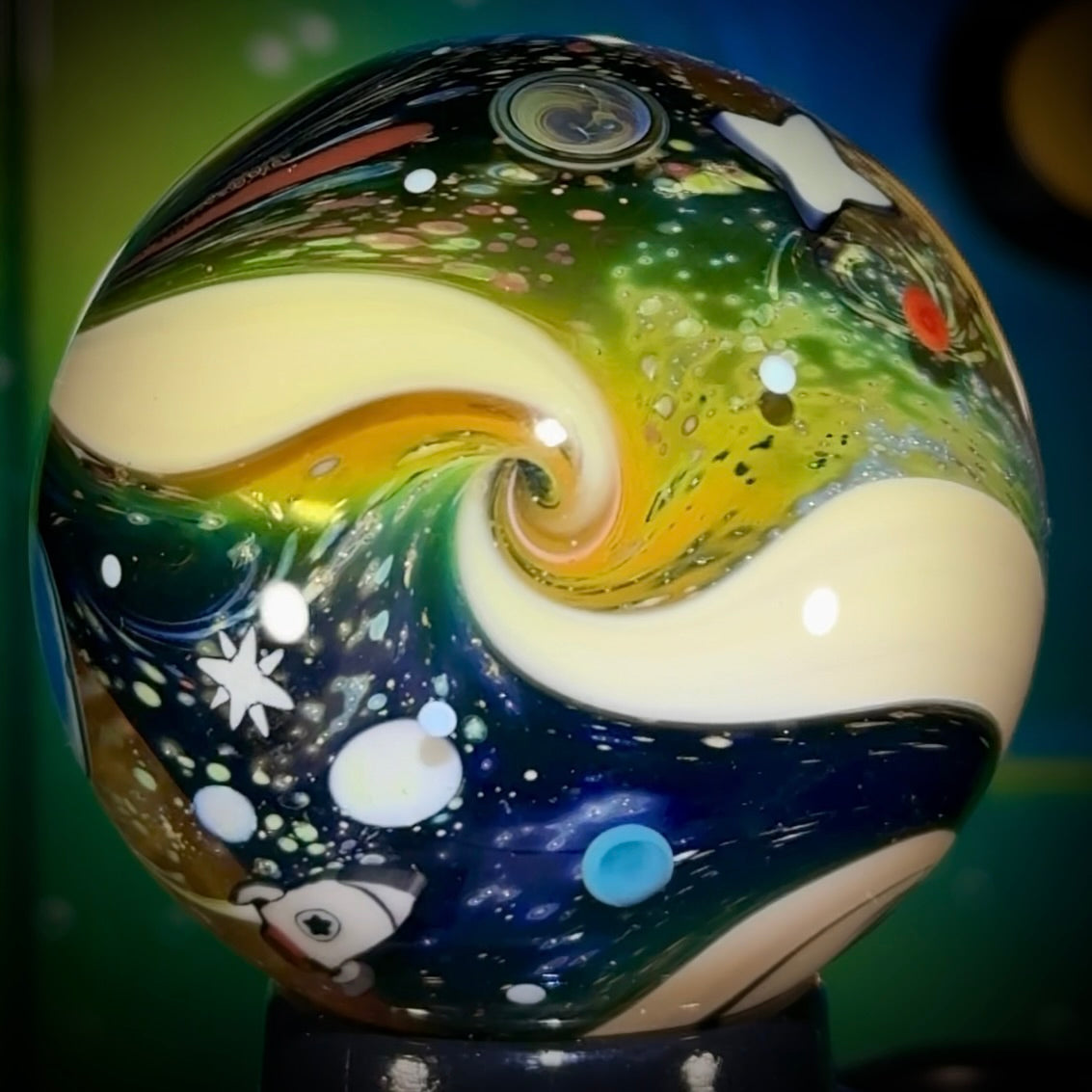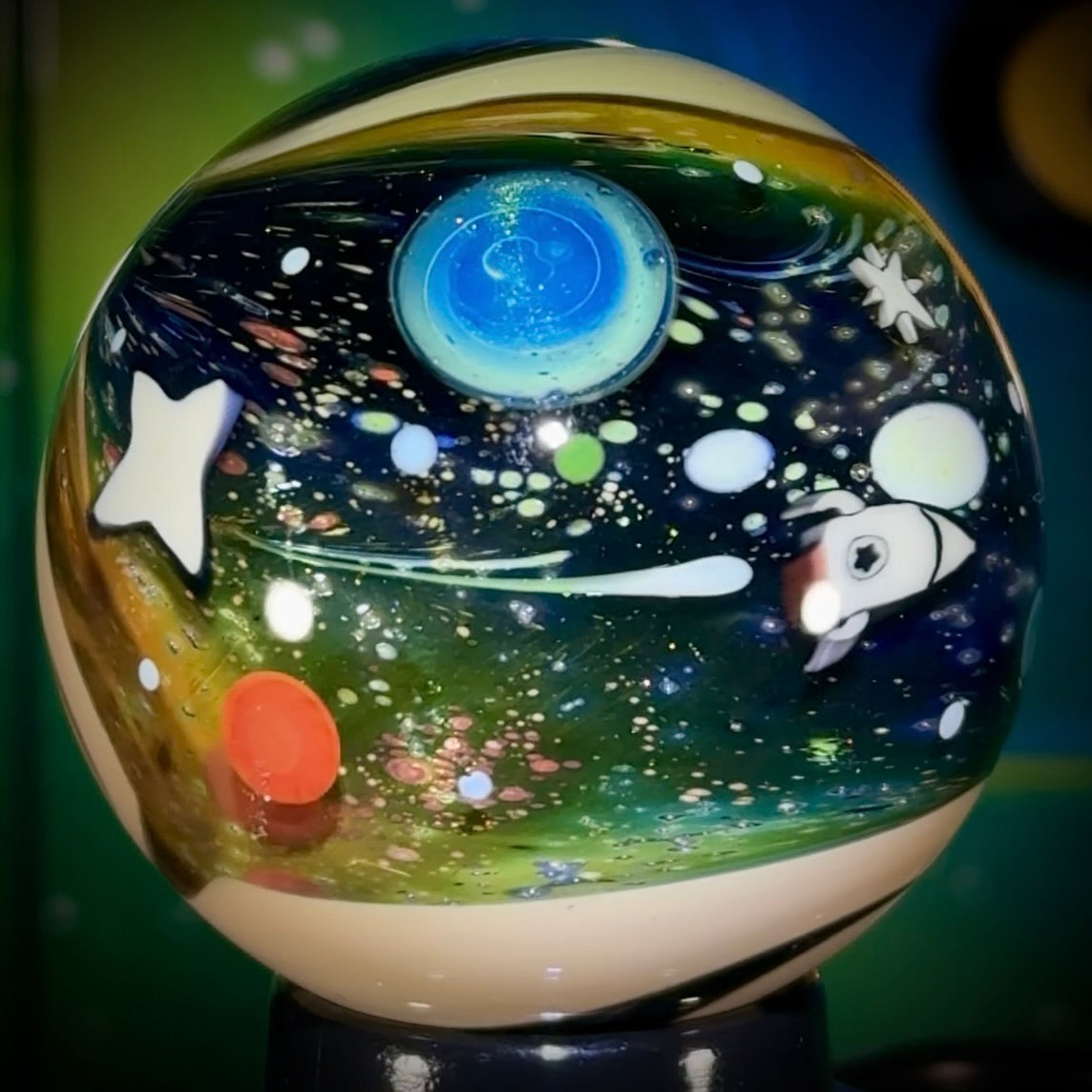 The NU marble series features over 40 NU millies, and some classics, including but not limited to: 4 new stars, a @SpaceX Starship & Booster, a Starling satellite, new UV ufo’s, and a Dragon Capsule & Spacewalker to name a few. ‘NU-Classic’ was built on the cornerstone of my classic mono-layered Intergalactic space but now with multi-layering and more tech-stacking.