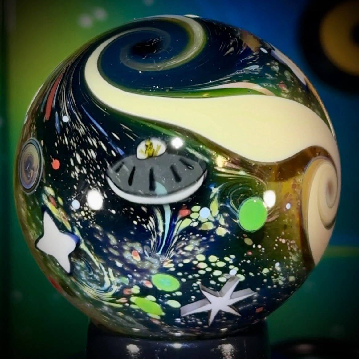 This 43mm NU-Classic marble features a UFO, with an alien in the cockpit flipping up a pair of peace signs. On the other side a rocket zooms past a hycean planet, in search of a late night sushi spot. A spiraling caramel belt separates the two scenes, while a Galaxy black sparkle background shimmers as you explore.
