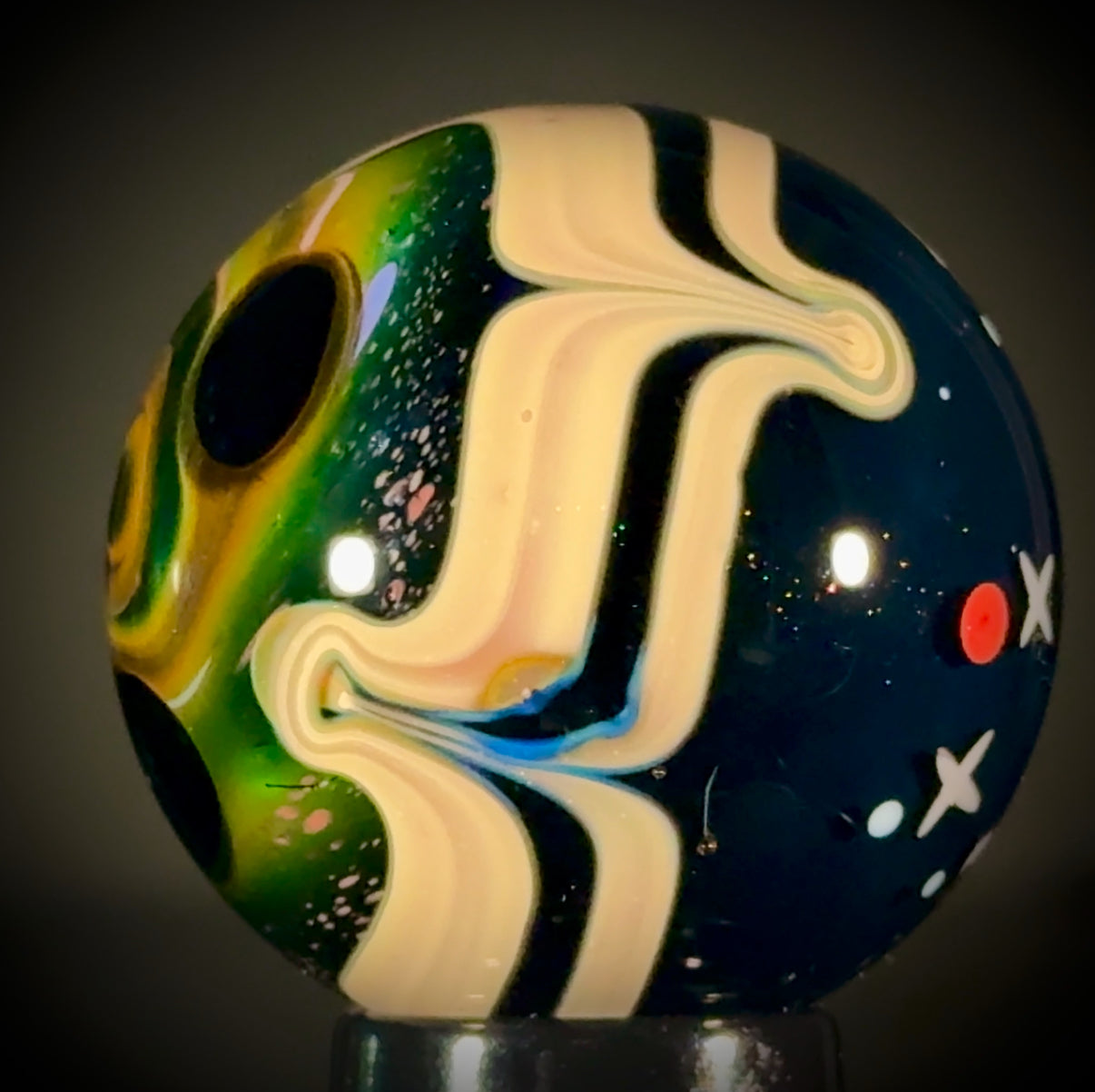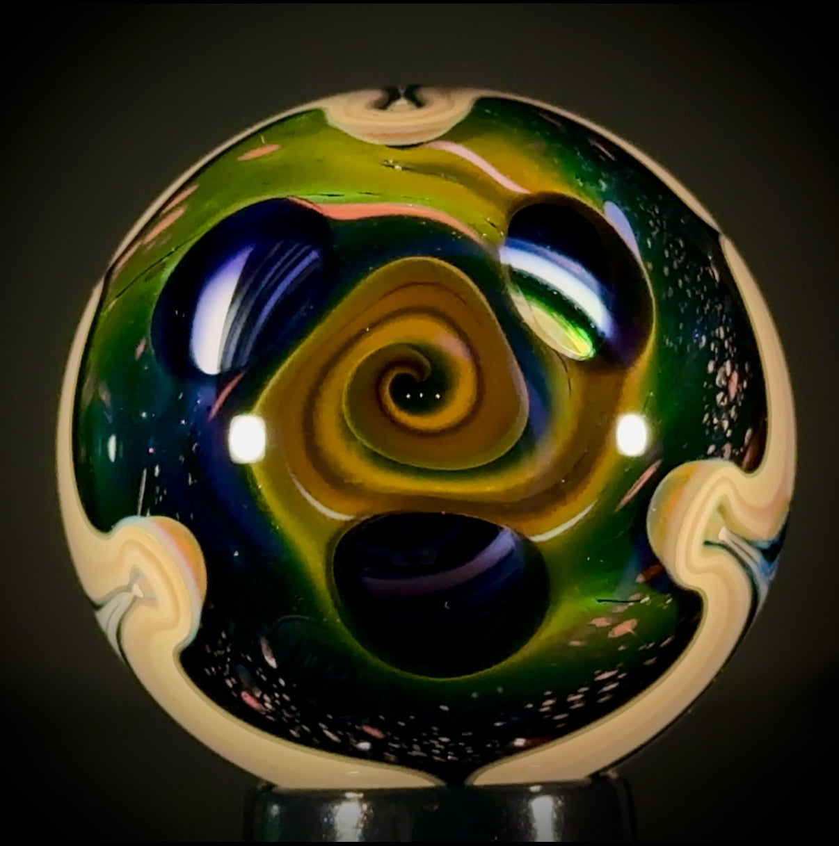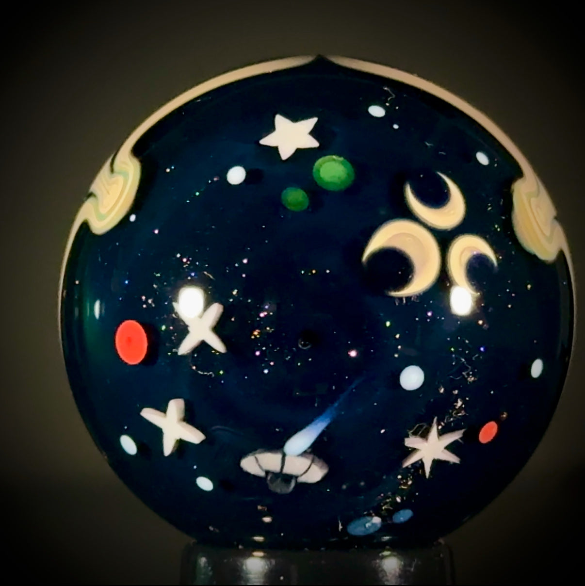45mm Solo Tri-StarPortal reveals a vortex deep inside. A raked Caramel band separates the backside, a NU-Classic style scene over a Galaxy Black (sparkle) backing. Signed "N8-24, and includes a stand and cleaning cloth.