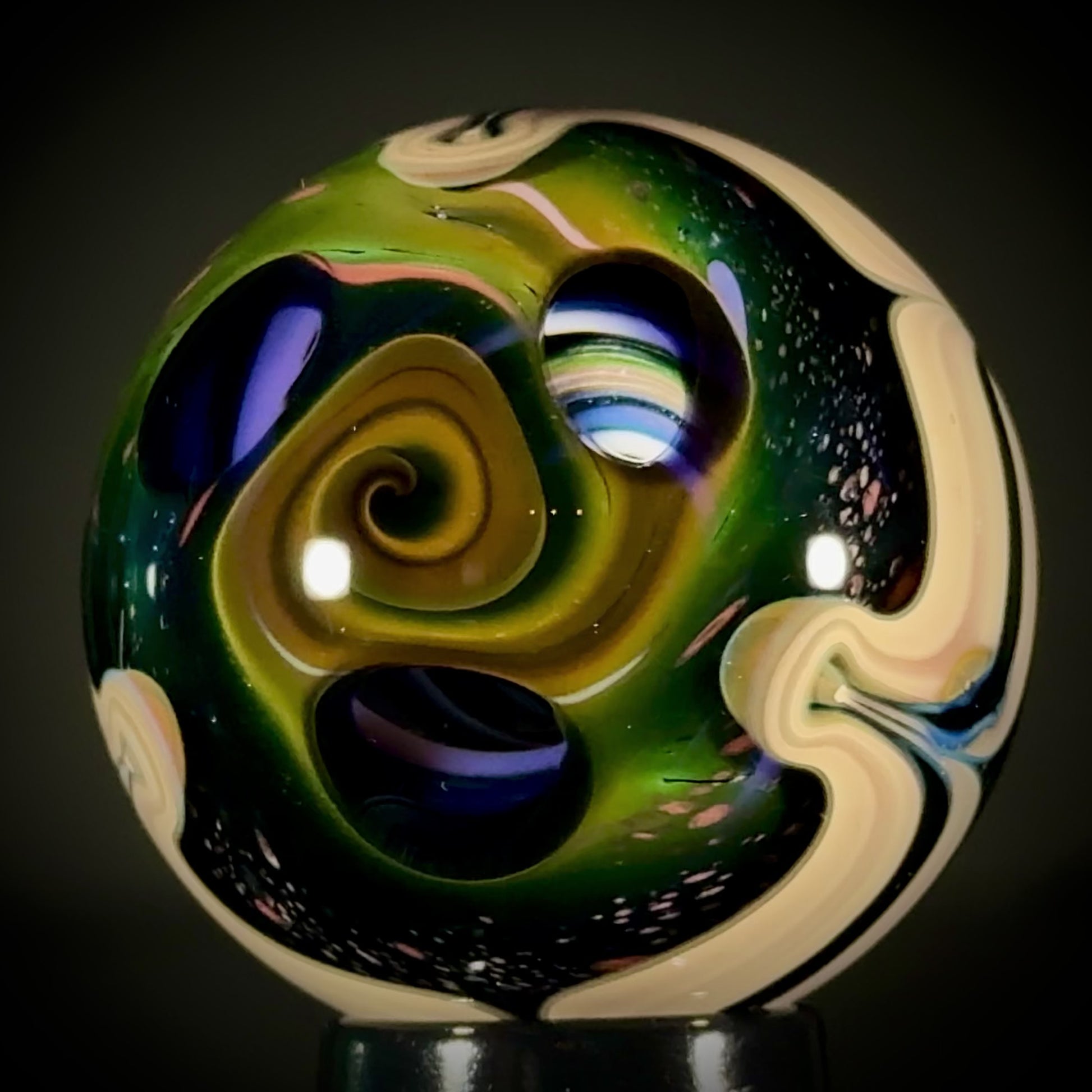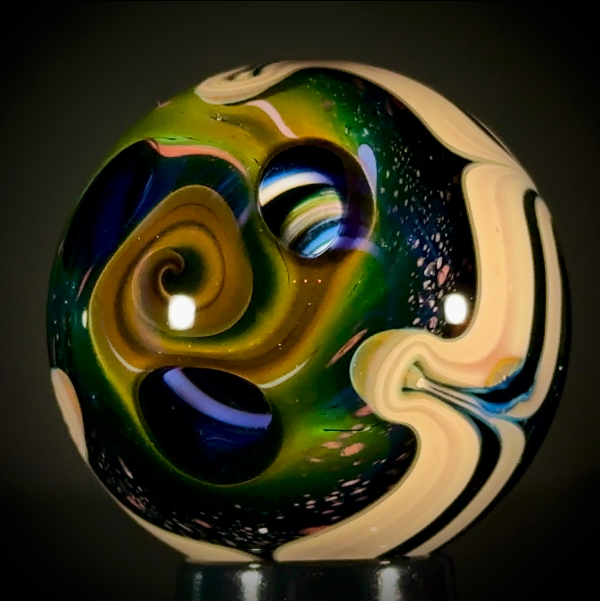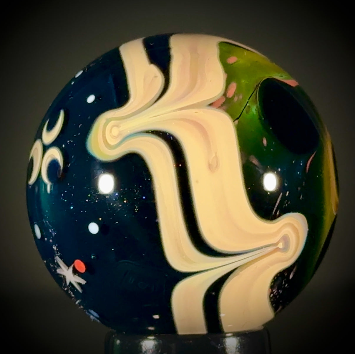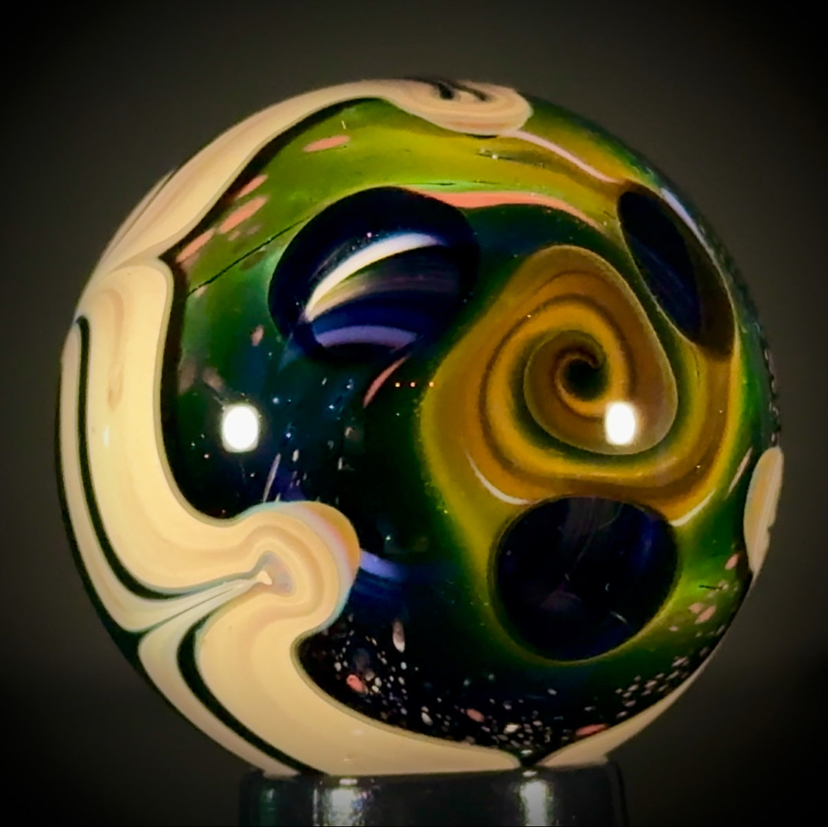 45mm Solo Tri-StarPortal reveals a vortex deep inside. A raked Caramel band separates the backside, a NU-Classic style scene over a Galaxy Black (sparkle) backing. Signed "N8-24, and includes a stand and cleaning cloth.