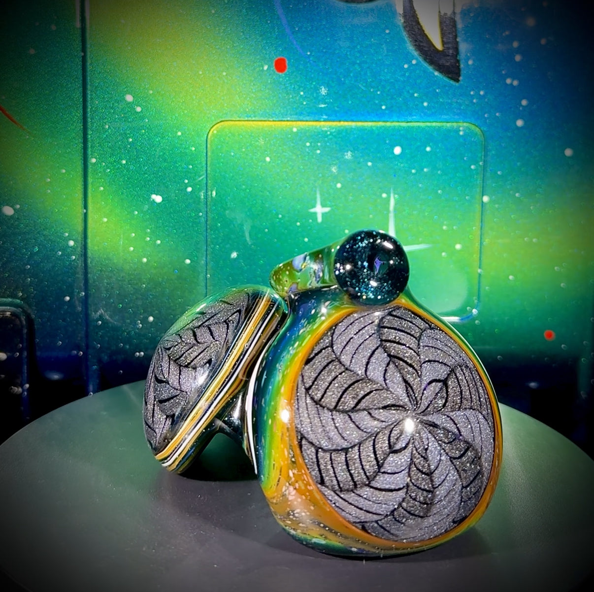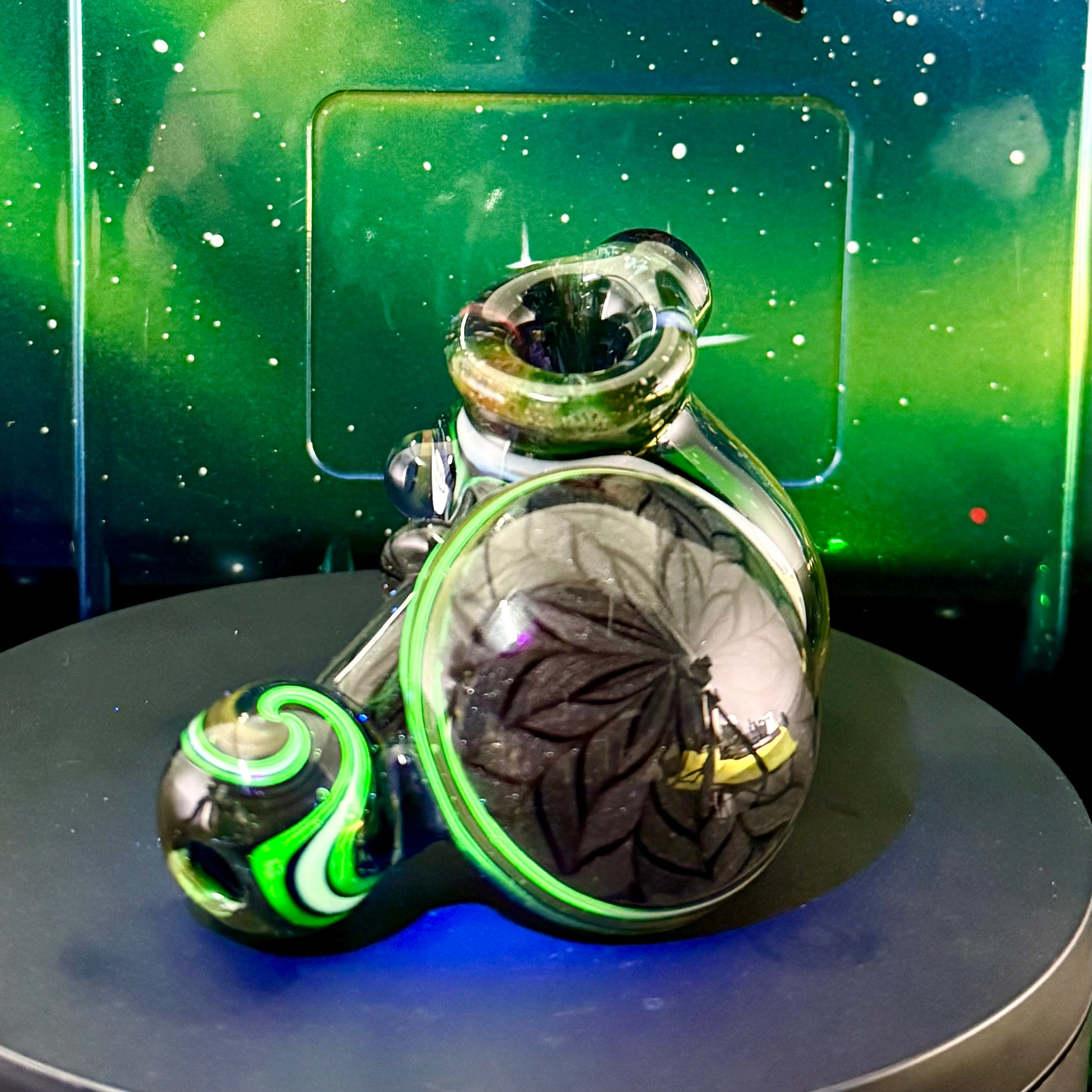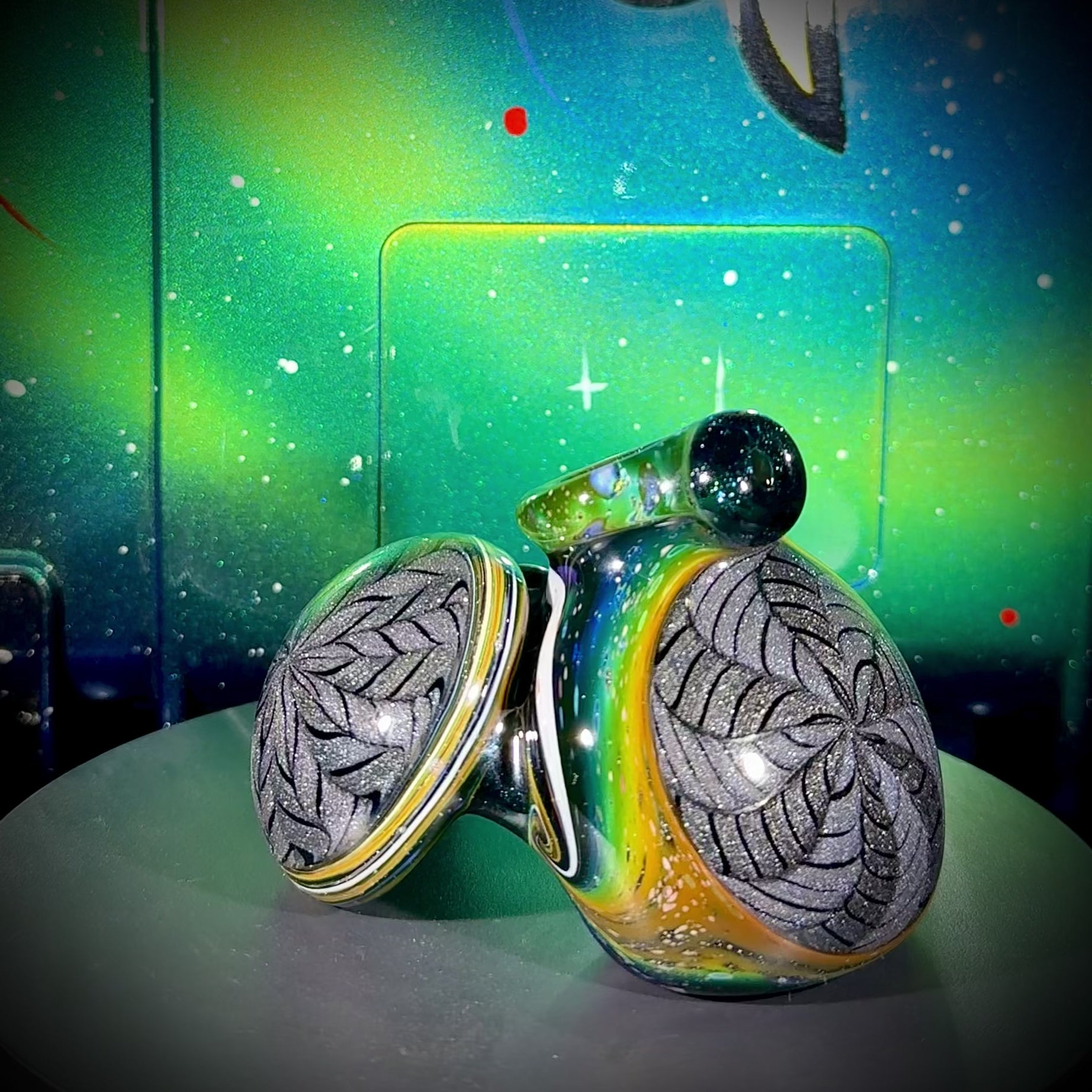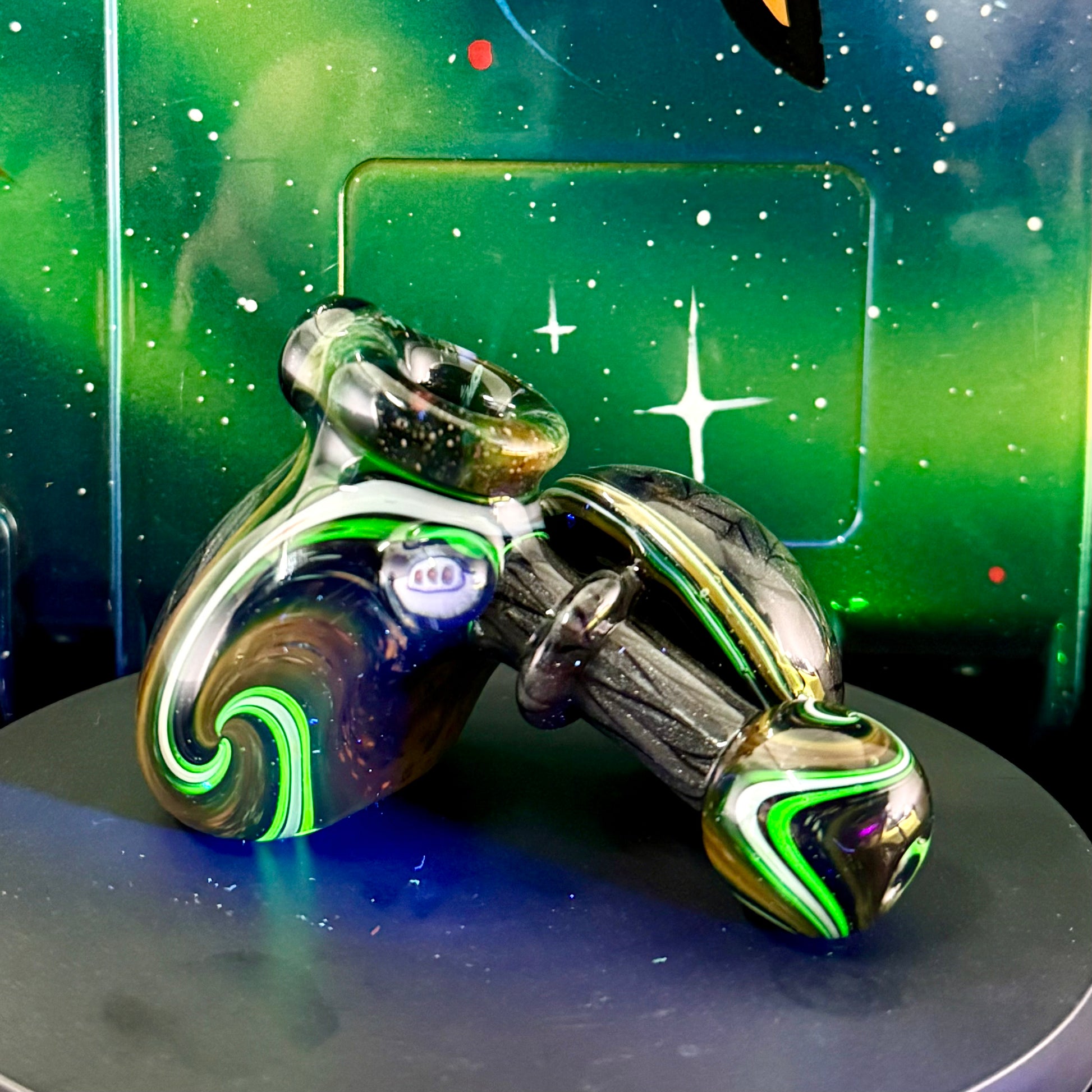 This is my all time favorite style of hammer, stylish as can be, and fits so nicely in the hand! Shaped by N8, this Birddogg x N8 collab mini-hammer features Birddogg's signature herringbone tech in steel wool, giving it a cool carbon fiber look, combined with N8's classic space with hidden UV line work. 4" long tip to tip, 1/4" mouthpiece hole, 1/2" bowl pack, 2.5mm bowl hole. 4.8oz. Includes small cloth carrying case, stickers, and pocket UV flashlight.