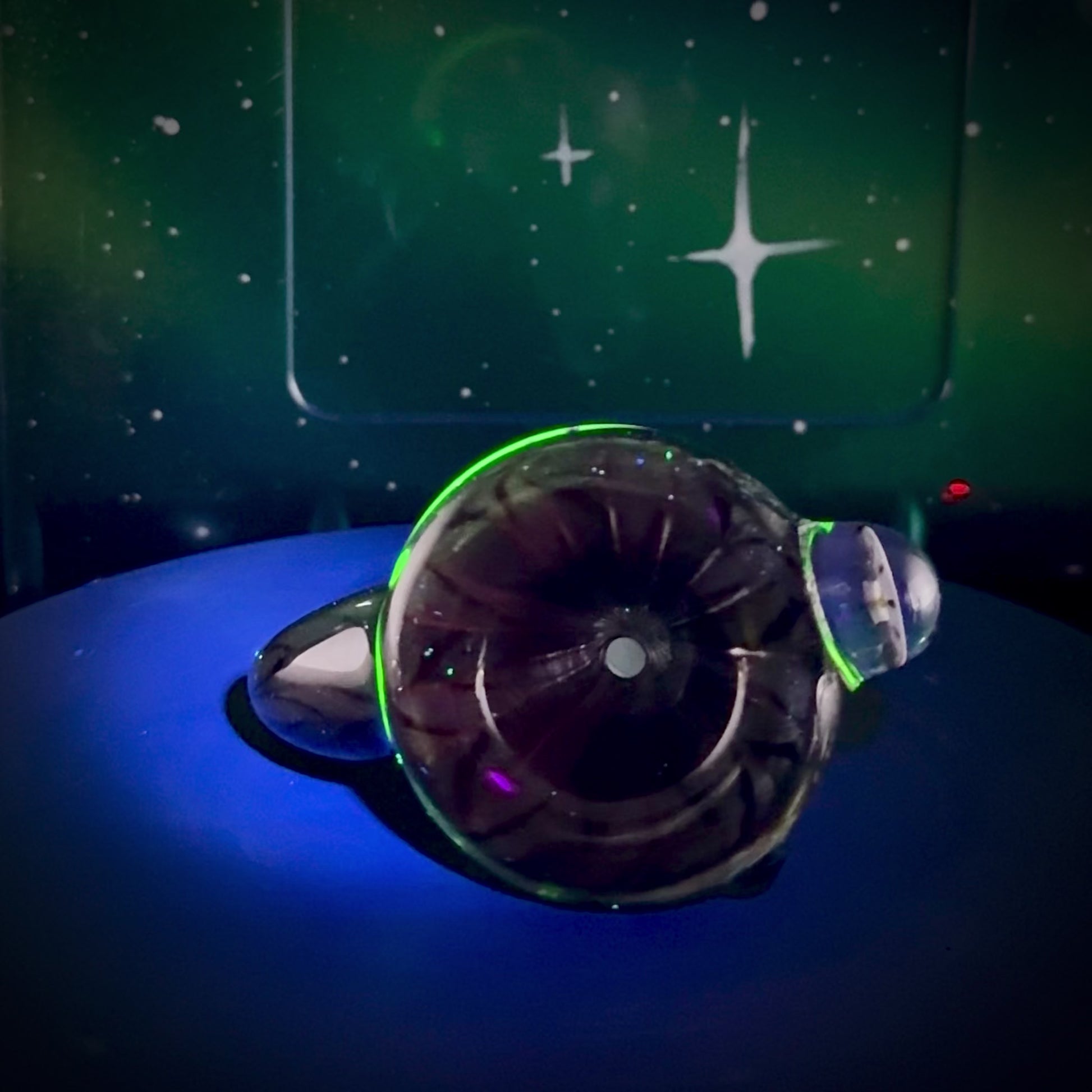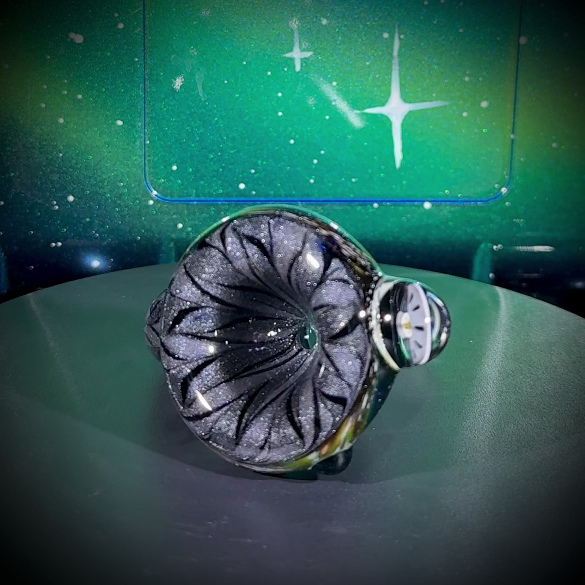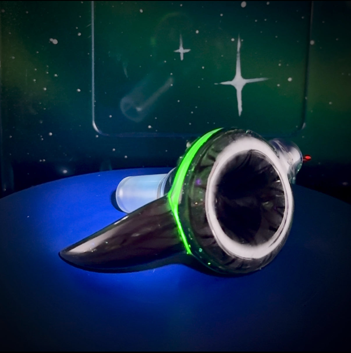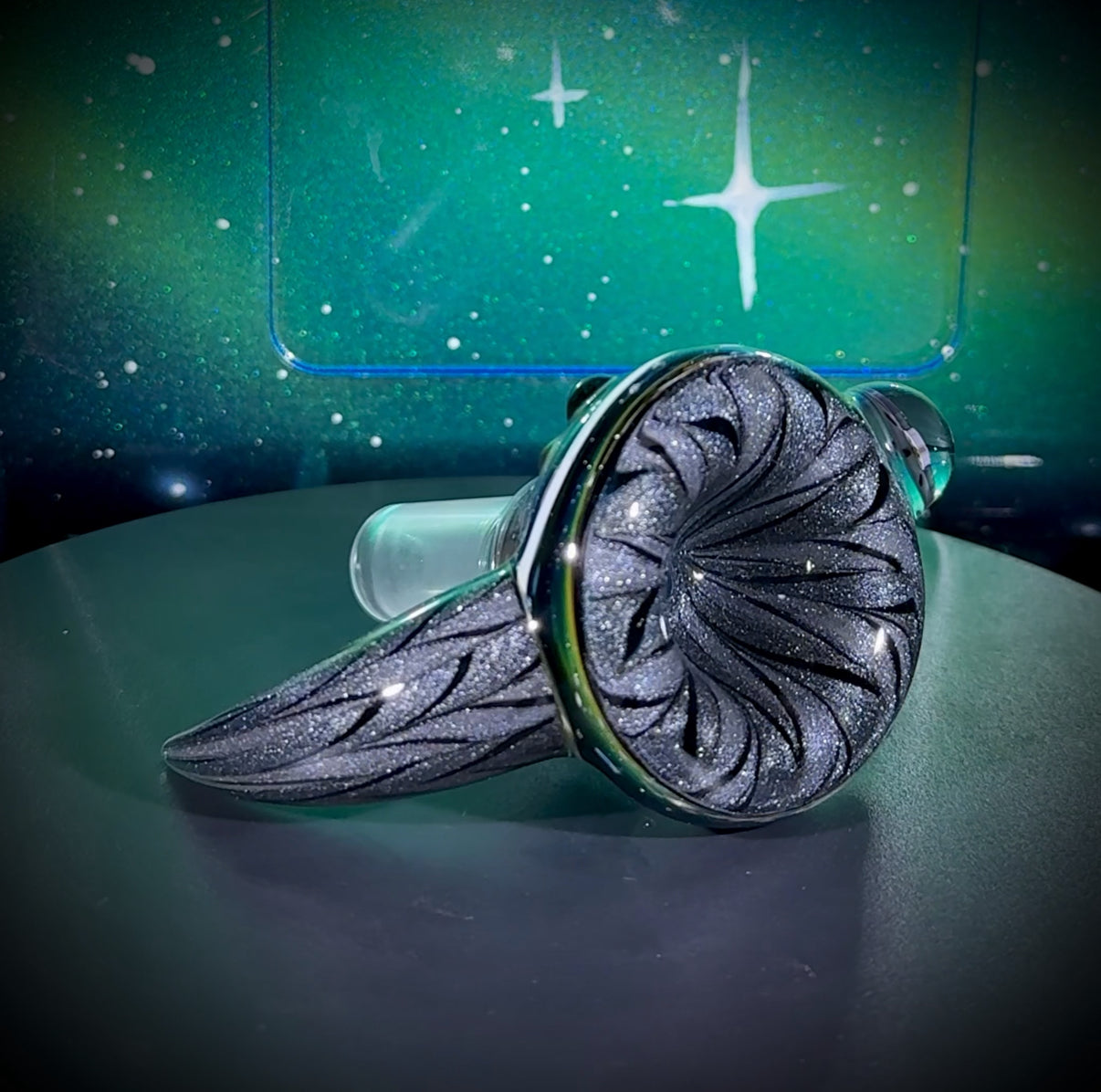 This Birddogg x N8 collab 14mm slide features Birddogg's signature herringbone tech with the steel wool, giving it a cool carbon fiber look, and N8's classic space with UV linework. 1" wide bowl (large) 3.5mm bowl hole. 2-1/4" tall with joint. Includes small cloth carrying case and cleaning cloth, stickers, and pocket UV flashlight.