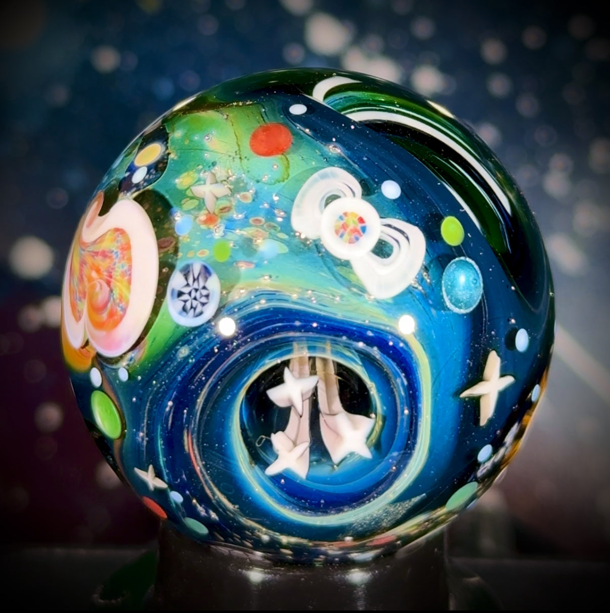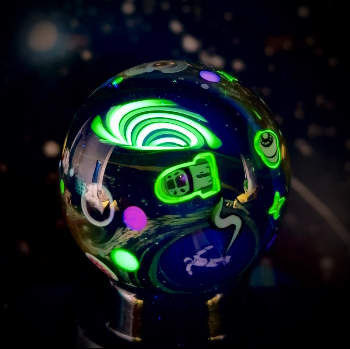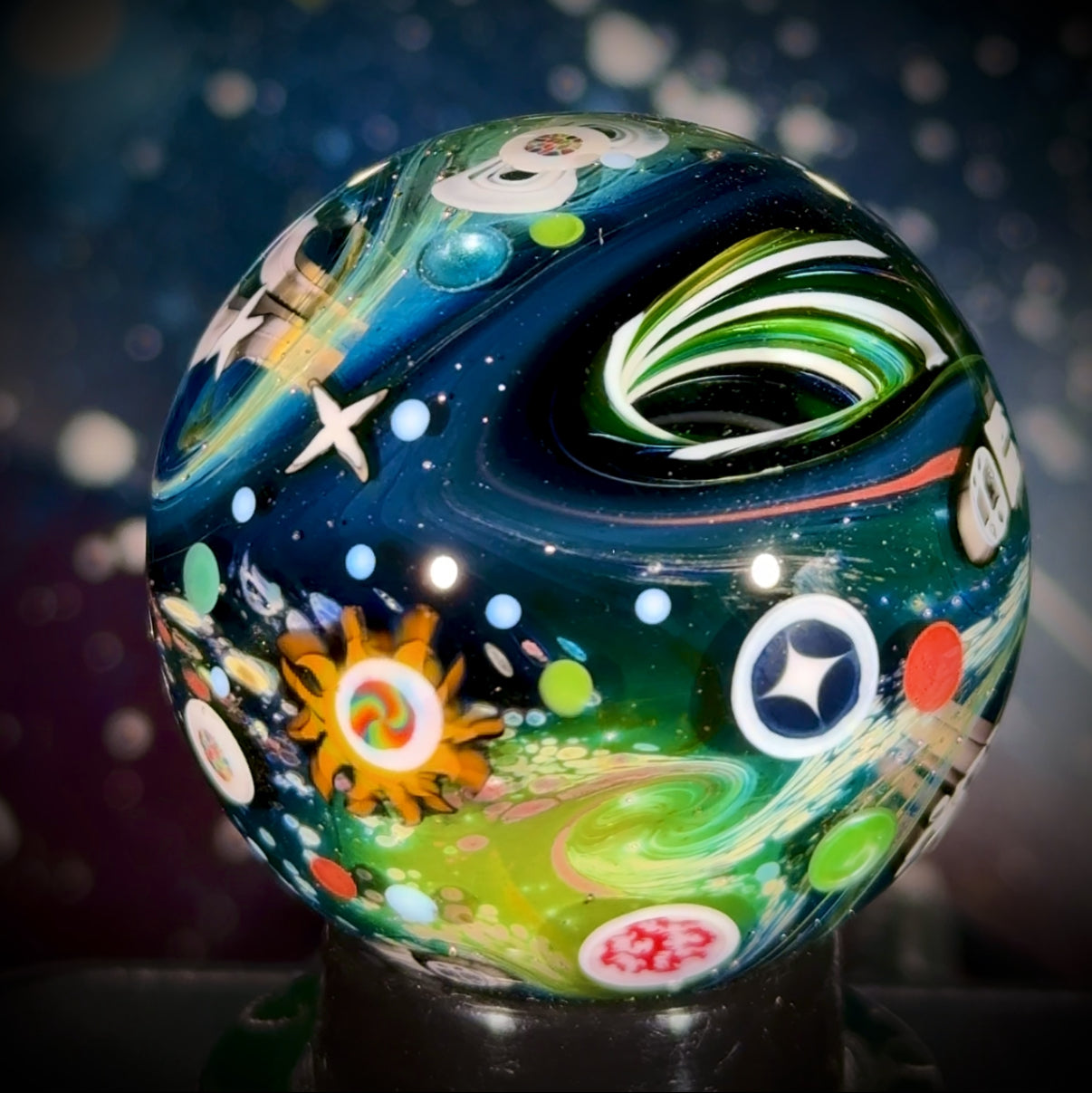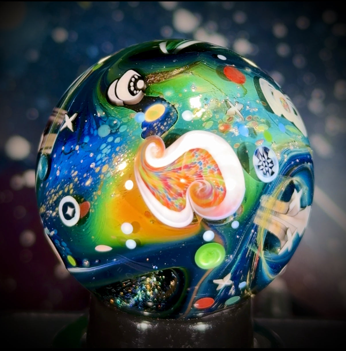 Made during Daiki Hori's recent trip to Everdream Studio, this collaboration Explorer Marble measures in at 40.6mm. Main features include a UV mini-Vortex, a UV mini-dichro galaxy, a spaghettification Spacewalker and star cluster. Smaller features include stars, ufo's planets, a Dragon Capsule, and even a couple of Daiki Hori's murrine double-layered over N8's murrine to create some fun variations on the sun and magnetic fields murrine. Lots to explore as you spin this one around! Signed & dated by both artists, includes floating marble display box, stand, and cleaning cloth.