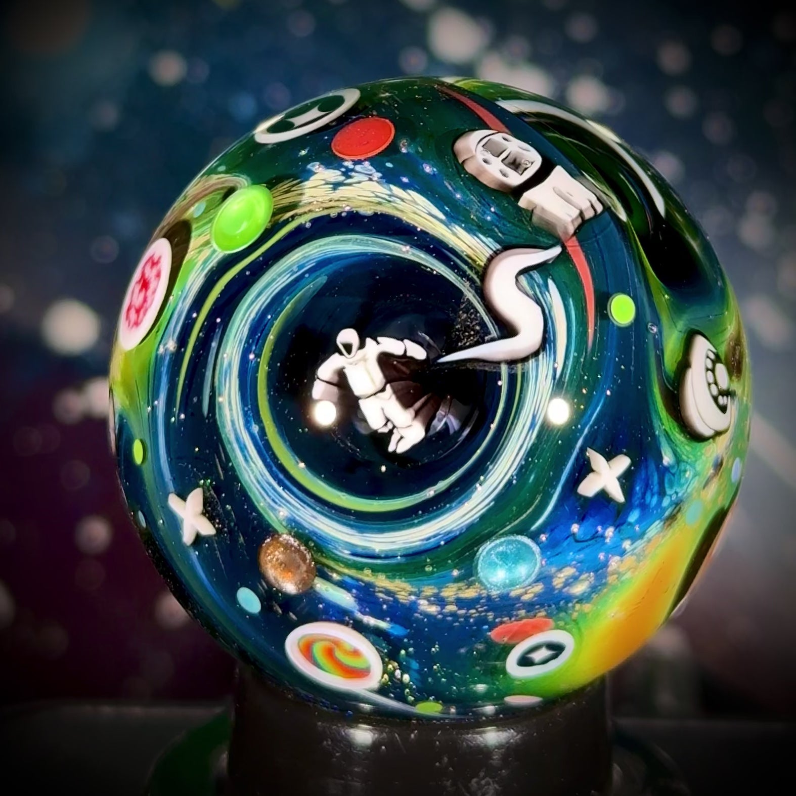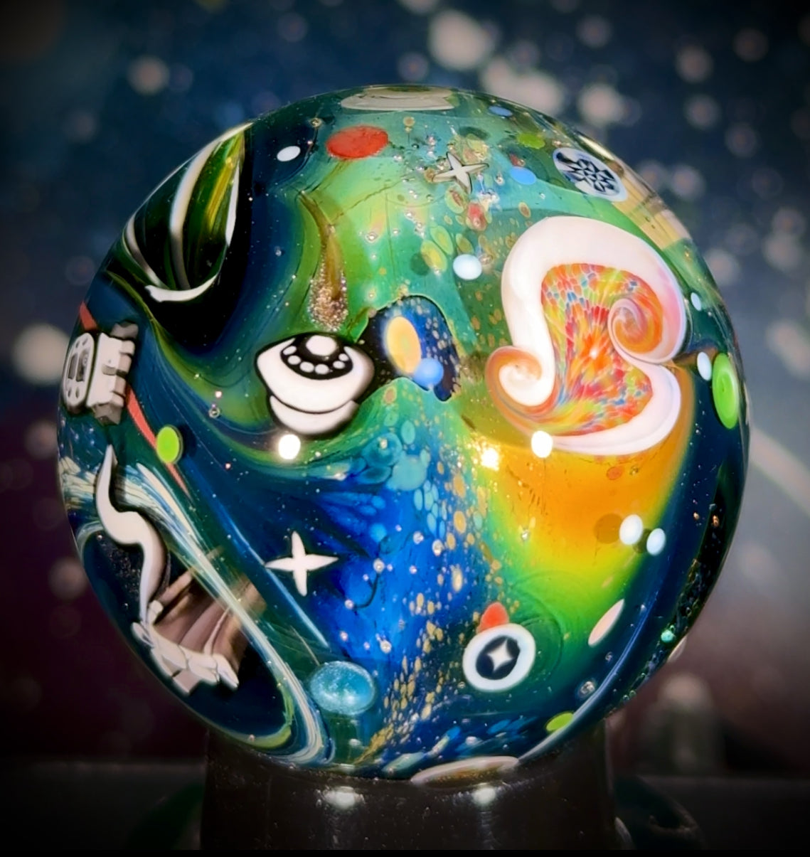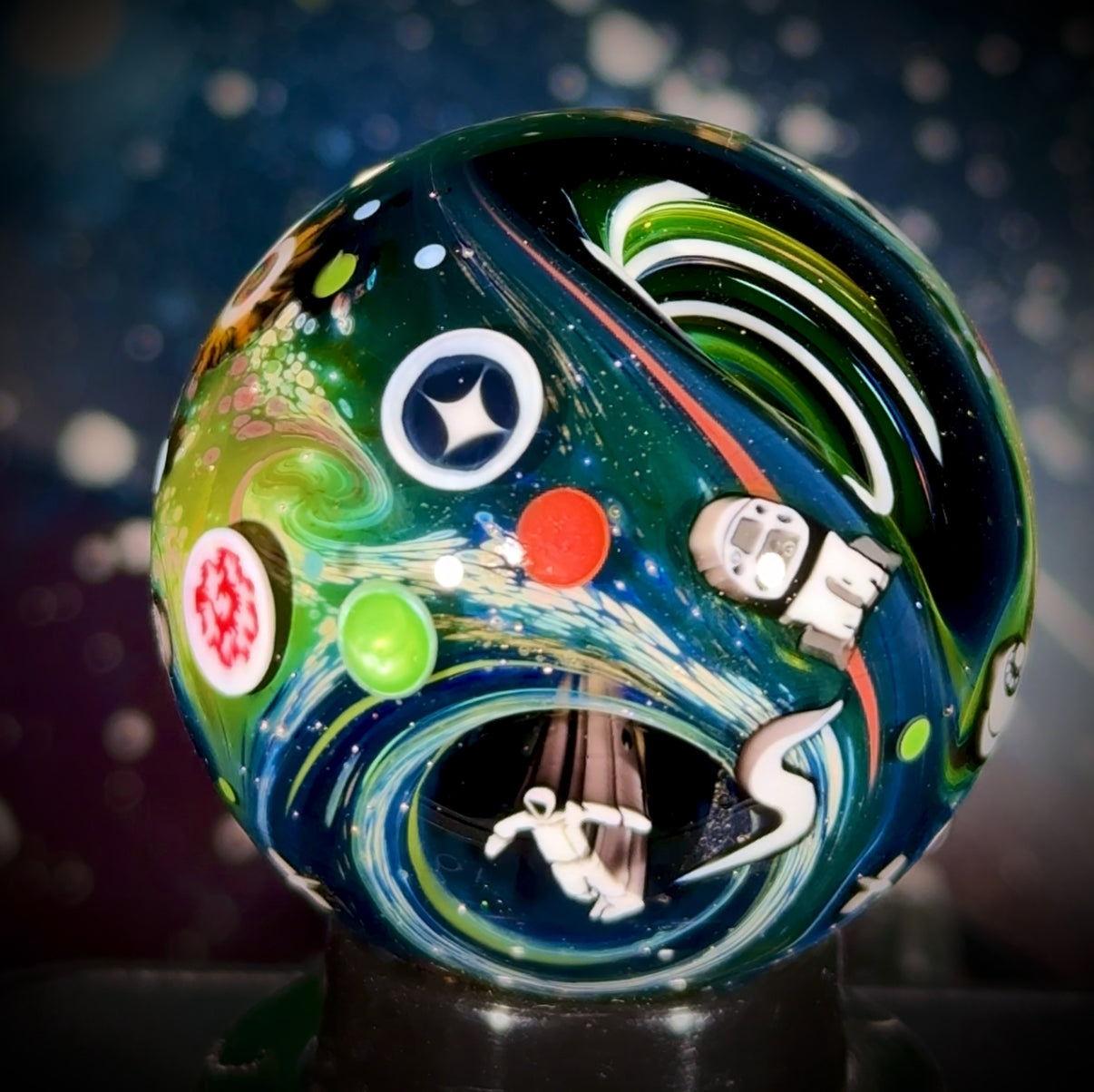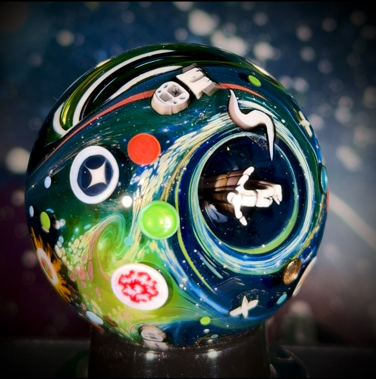 Made during Daiki Hori's recent trip to Everdream Studio, this collaboration Explorer Marble measures in at 40.6mm. Main features include a UV mini-Vortex, a UV mini-dichro galaxy, a spaghettification Spacewalker and star cluster. Smaller features include stars, ufo's planets, a Dragon Capsule, and even a couple of Daiki Hori's murrine double-layered over N8's murrine to create some fun variations on the sun and magnetic fields murrine. Lots to explore as you spin this one around! Signed & dated by both artists, includes floating marble display box, stand, and cleaning cloth.