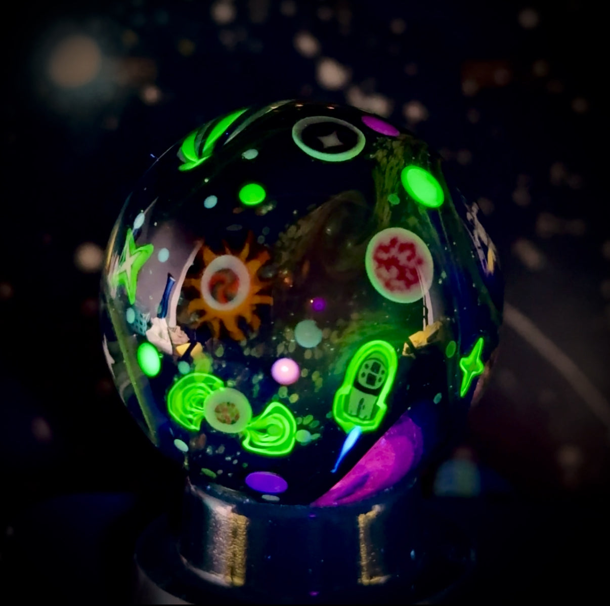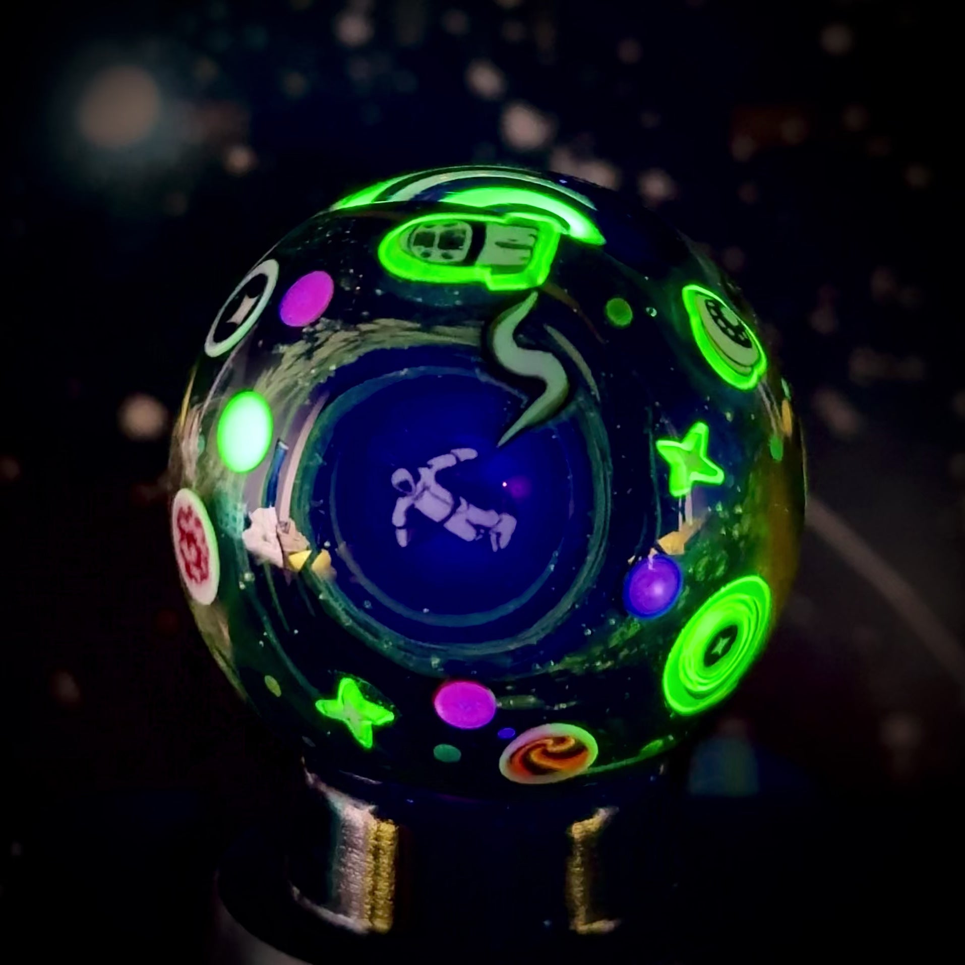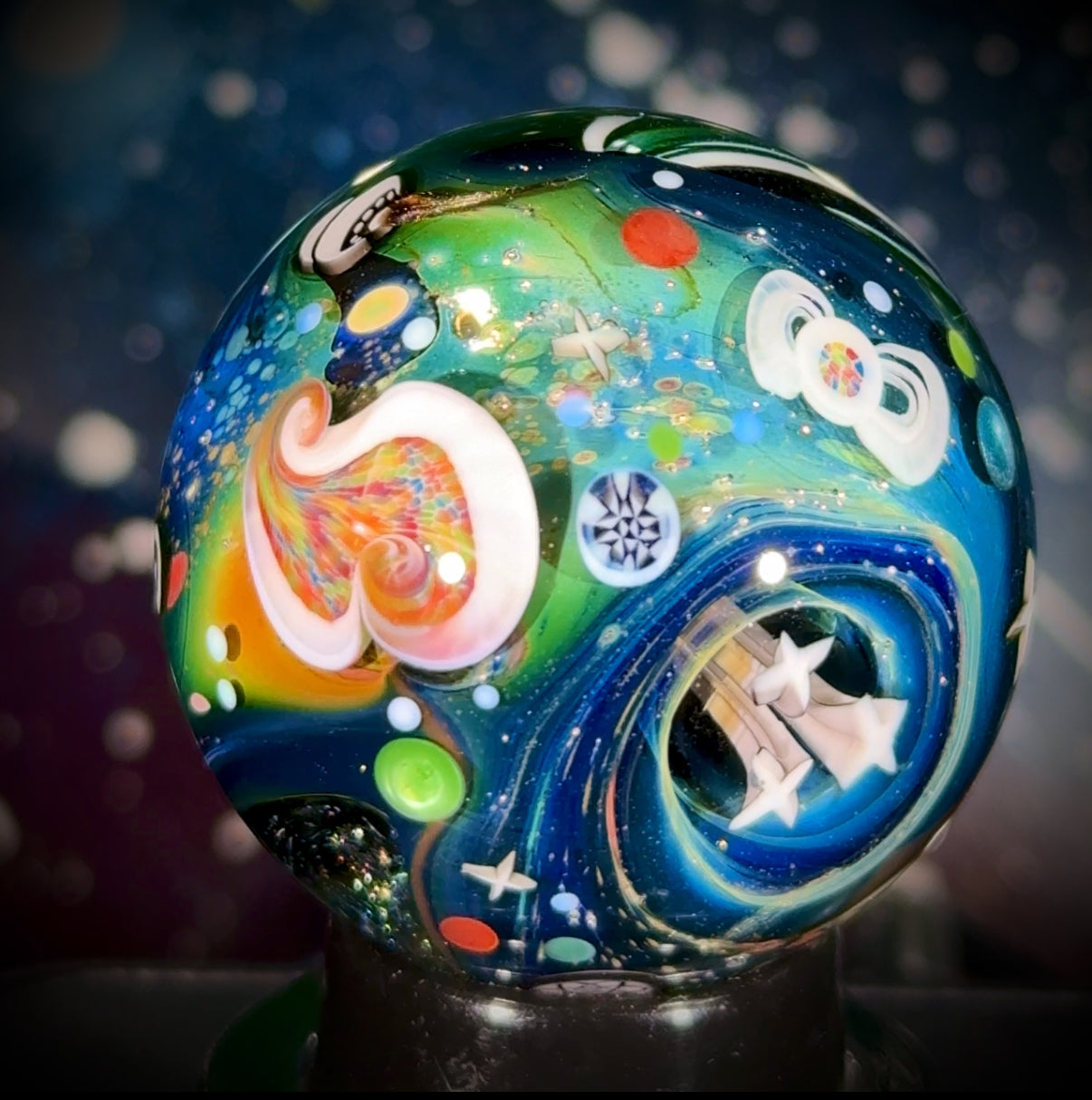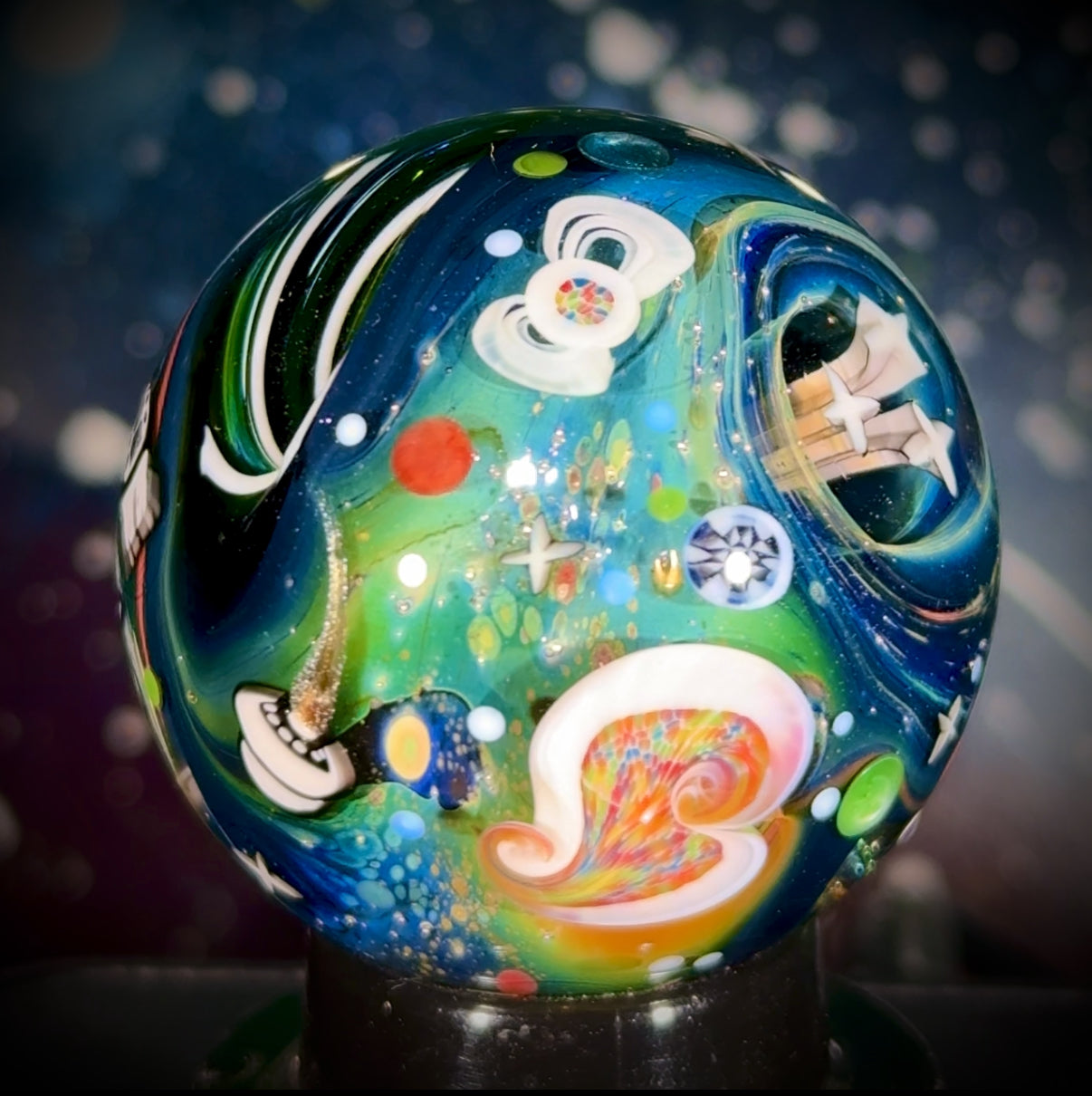 Made during Daiki Hori's recent trip to Everdream Studio, this collaboration Explorer Marble measures in at 40.6mm. Main features include a UV mini-Vortex, a UV mini-dichro galaxy, a spaghettification Spacewalker and star cluster. Smaller features include stars, ufo's planets, a Dragon Capsule, and even a couple of Daiki Hori's murrine double-layered over N8's murrine to create some fun variations on the sun and magnetic fields murrine. Lots to explore as you spin this one around! Signed & dated by both artists, includes floating marble display box, stand, and cleaning cloth.