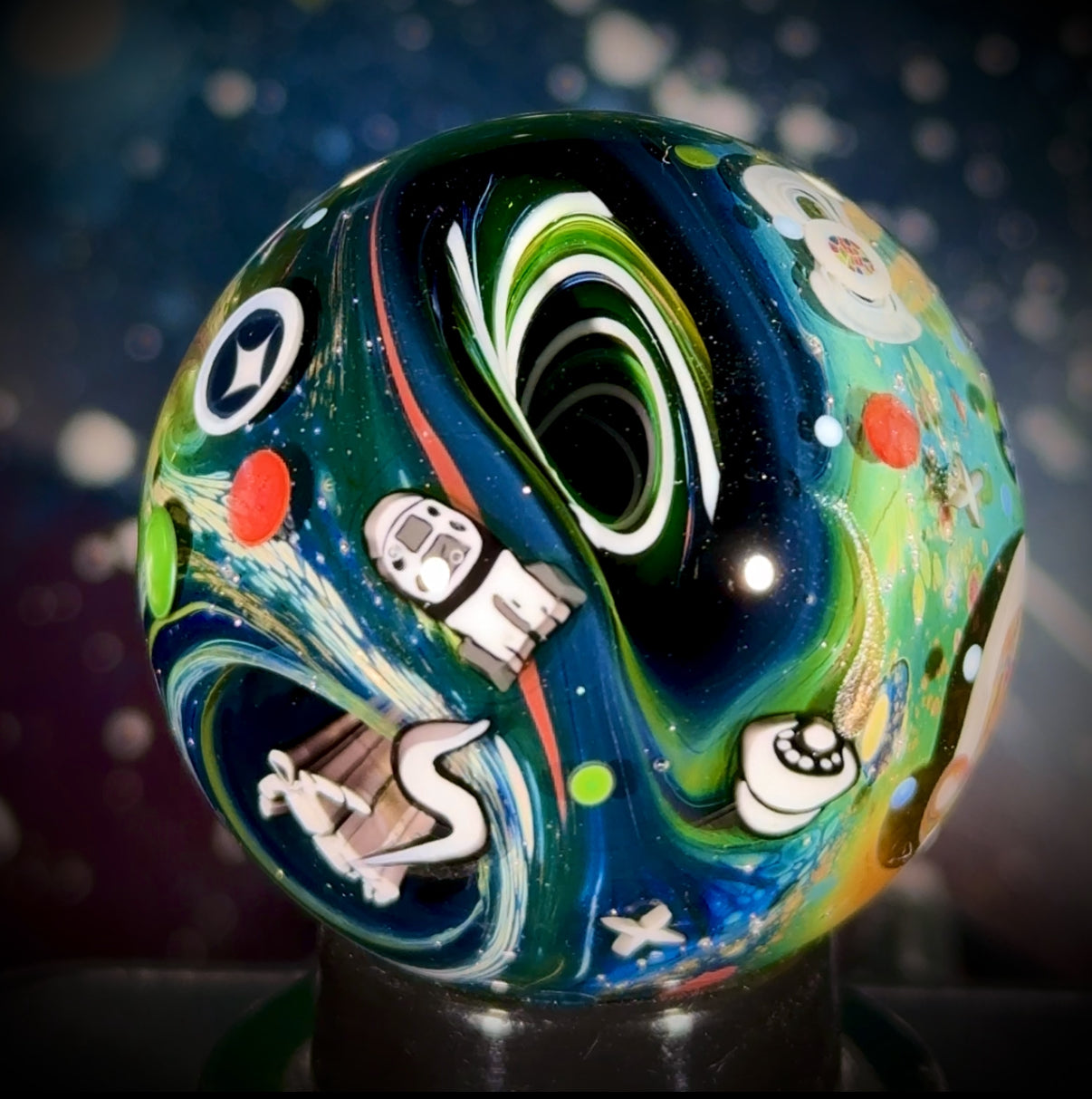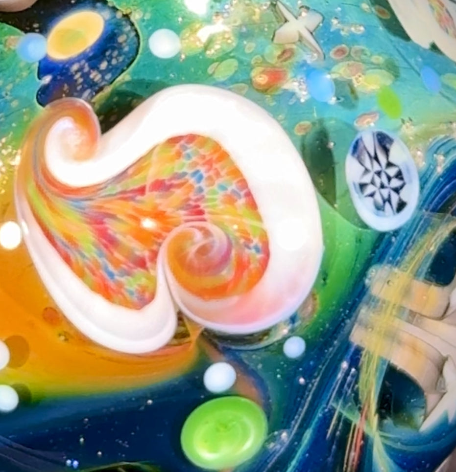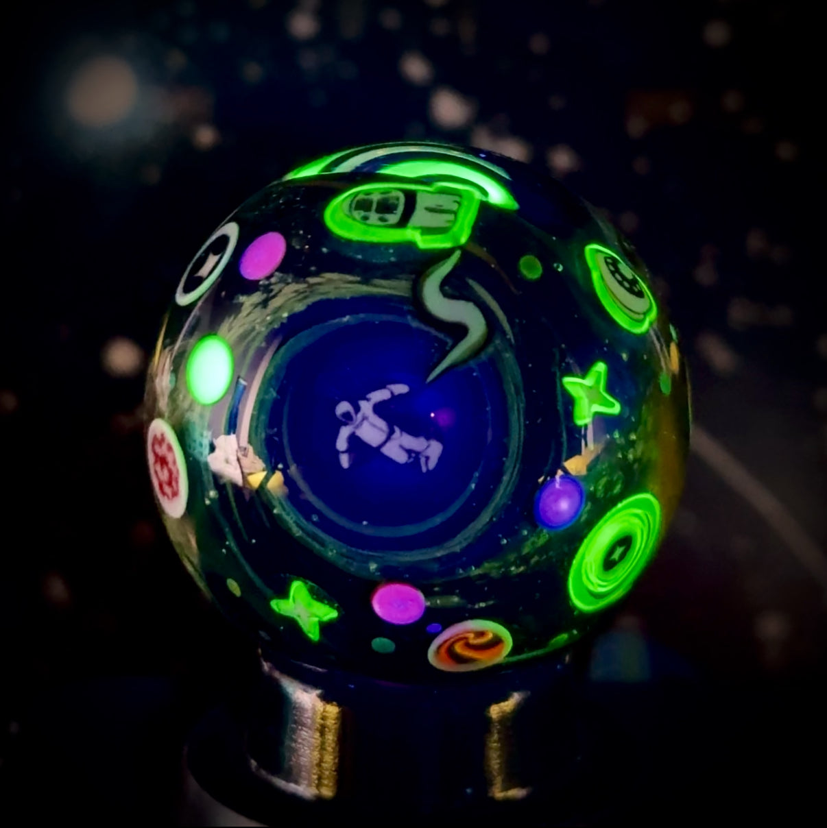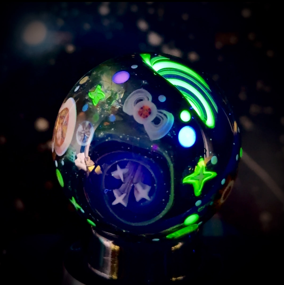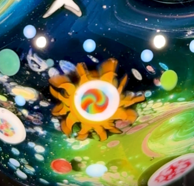 Made during Daiki Hori's recent trip to Everdream Studio, this collaboration Explorer Marble measures in at 40.6mm. Main features include a UV mini-Vortex, a UV mini-dichro galaxy, a spaghettification Spacewalker and star cluster. Smaller features include stars, ufo's planets, a Dragon Capsule, and even a couple of Daiki Hori's murrine double-layered over N8's murrine to create some fun variations on the sun and magnetic fields murrine. Lots to explore as you spin this one around! Signed & dated by both artists, includes floating marble display box, stand, and cleaning cloth.