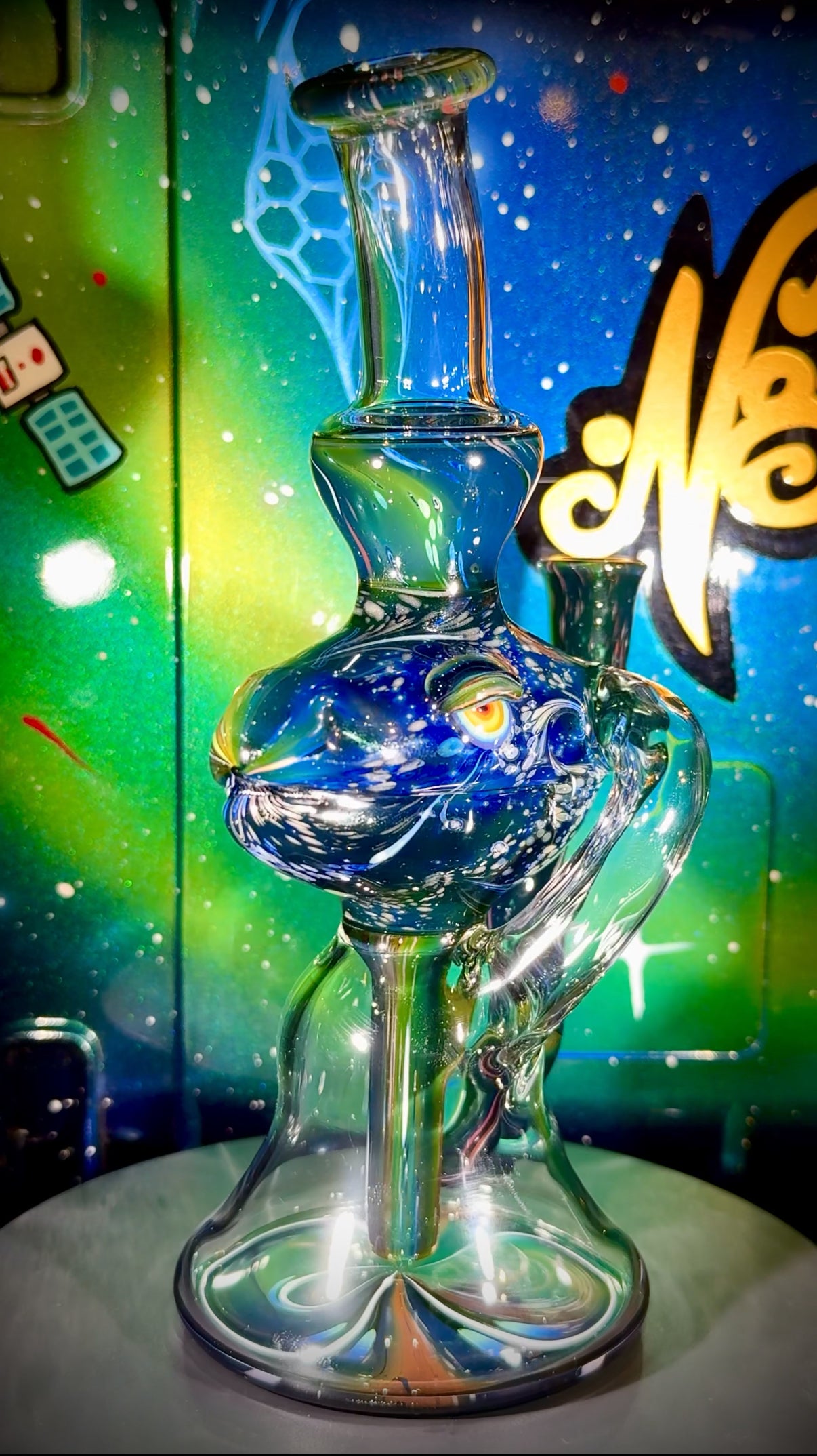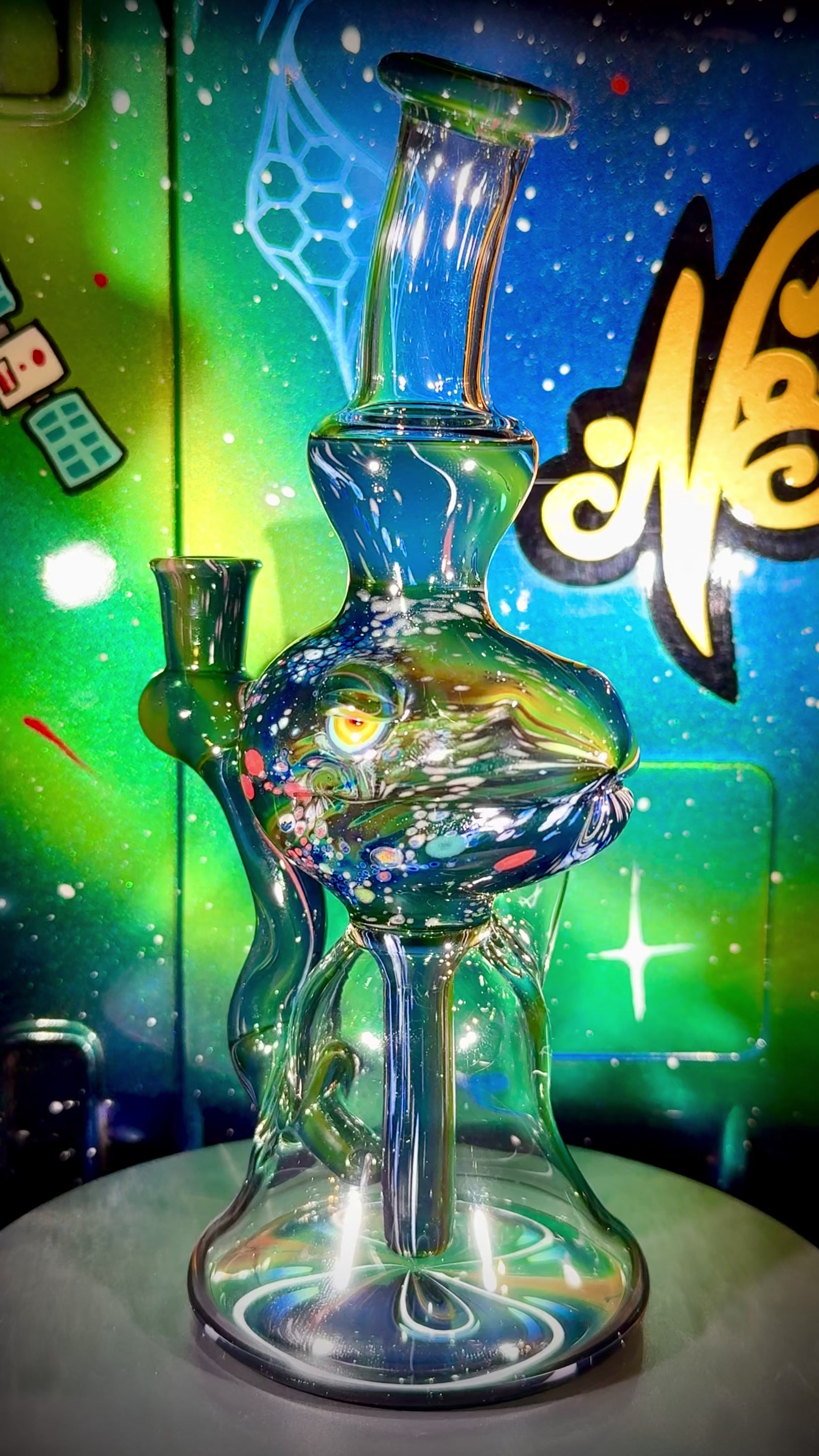 Here's a new recycler collaboration with Elbo Glass, one of my longtime friends and shopmates here in Everdream Studio. Shaped and constructed by Elbo, this piece includes Elbo's signature Dino head made out of N8's classic space design on the Galaxy Black tubing for extra sparkle and shine! N8's double-sided (multi-verse) space on the bottom of the can. Single hole drain, 2-hole pig-snout style diffuser. Single uptake. Great travel piece, 1200 pelican case included!