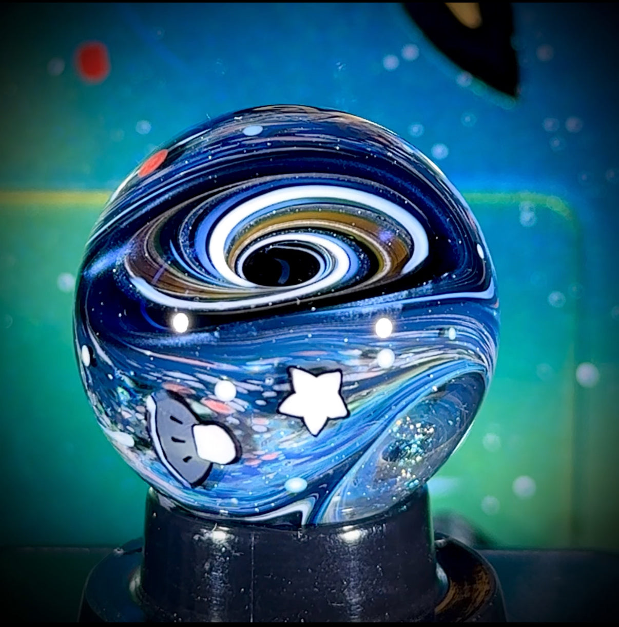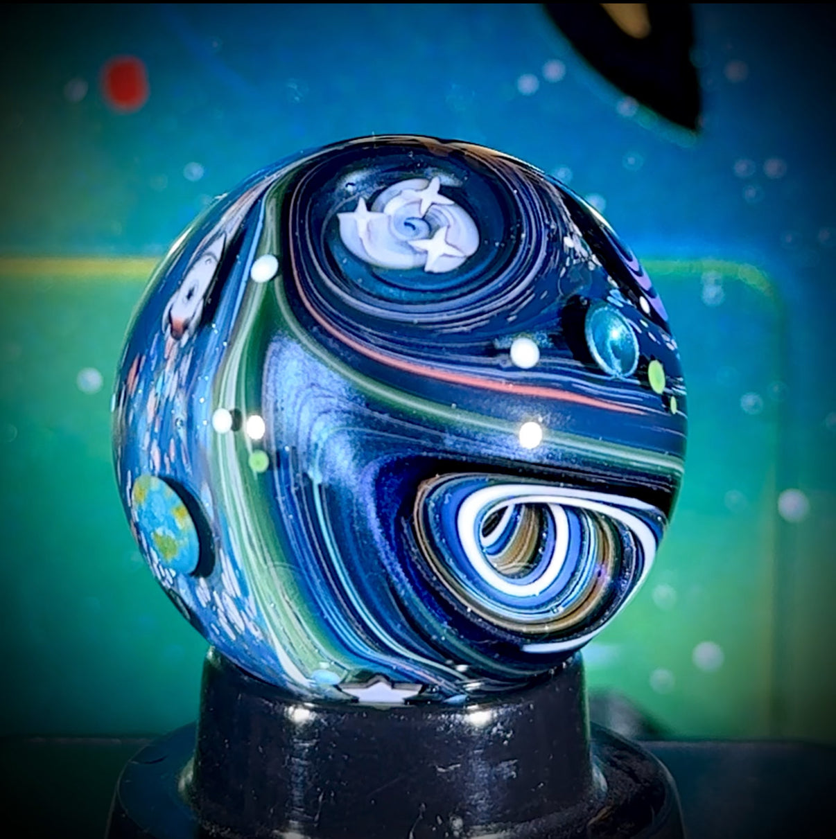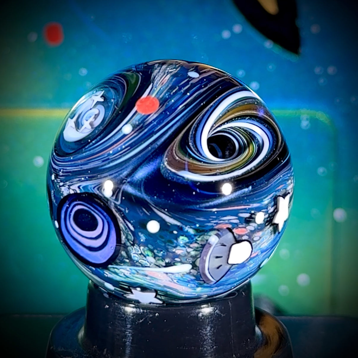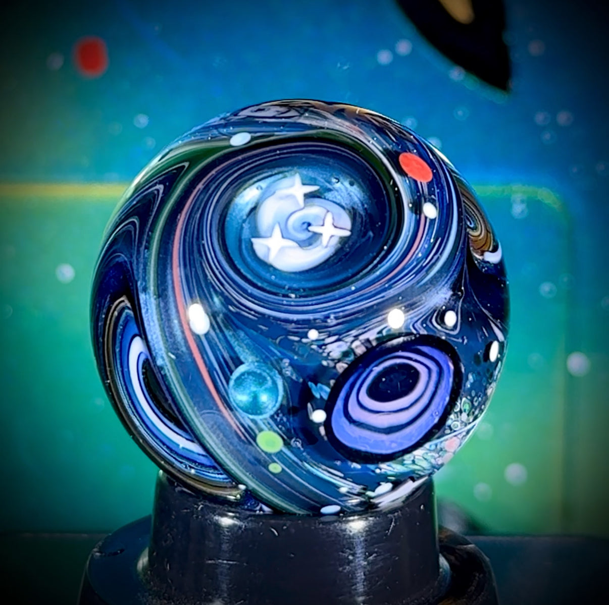 No3 measures in at 35mm and features two mini vortices on opposite poles, and three spiraling stars and a mini dichro galaxy on the opposite poles. UFO's, a sun, stars and more adorn the outside. Signed N8-XPL3 and includes a floating display box, acrylic stand, branded cleaning cloth, and stickers.