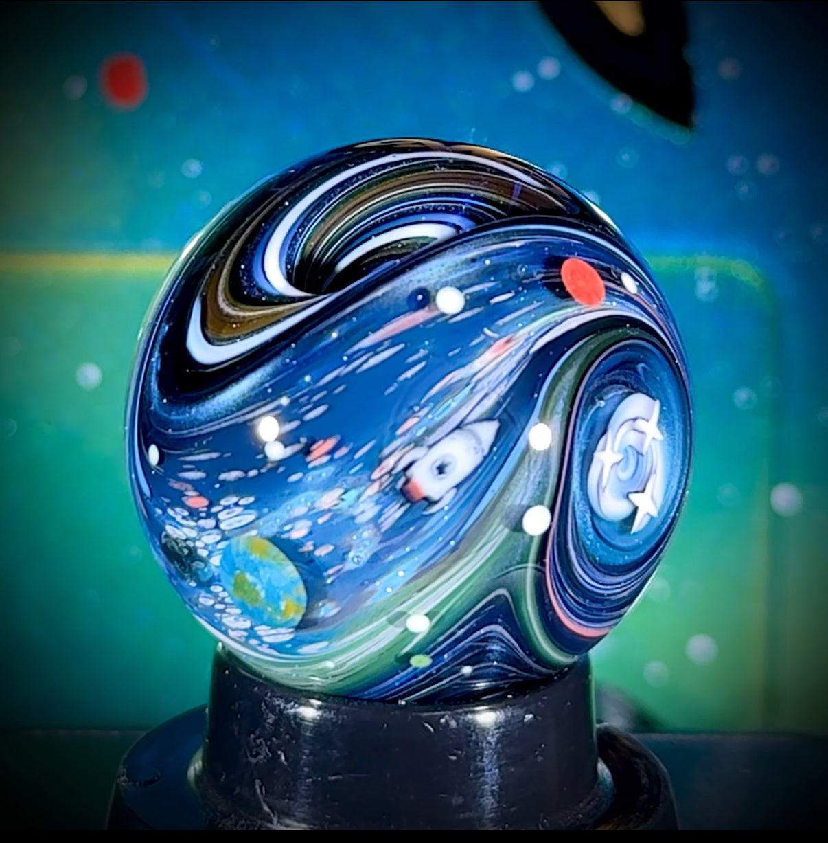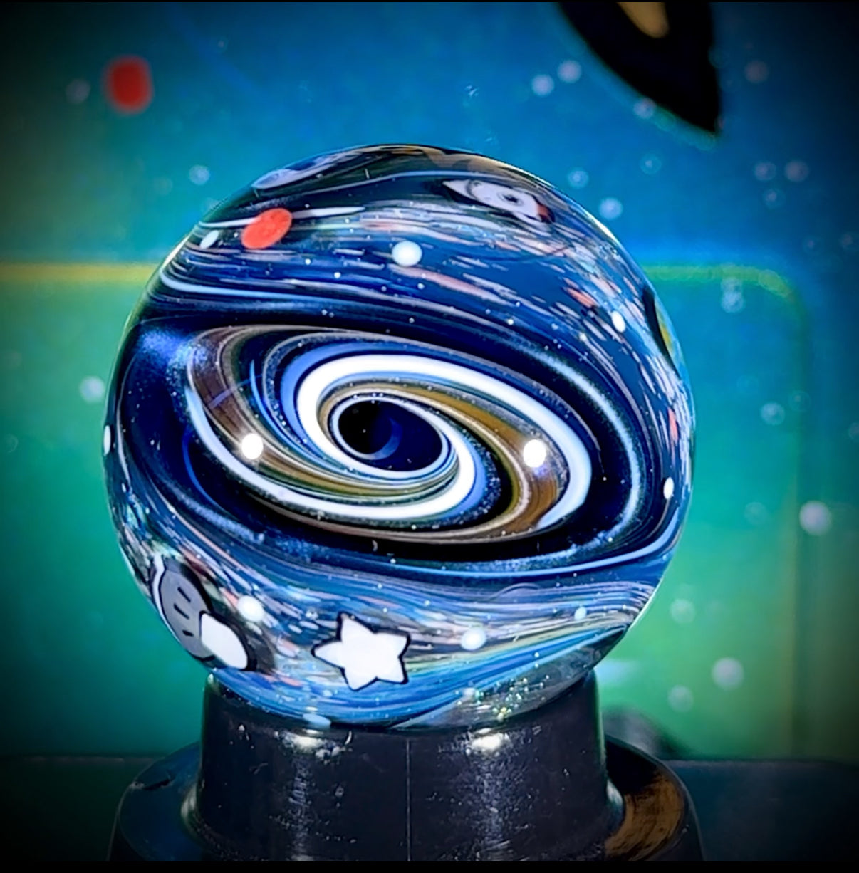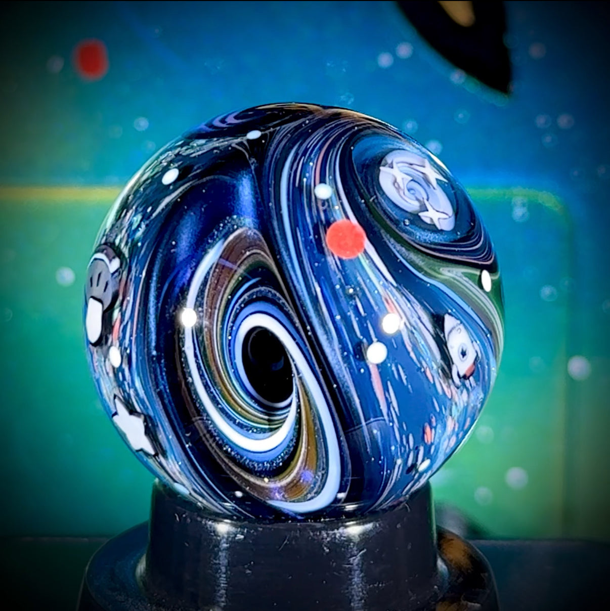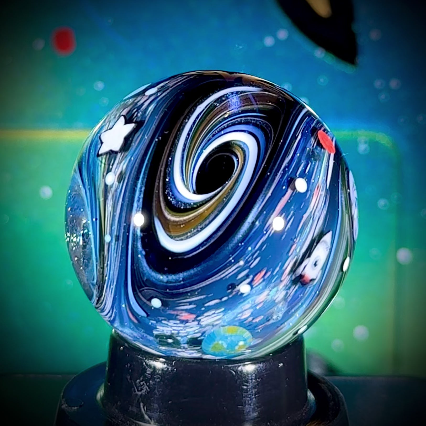 No3 measures in at 35mm and features two mini vortices on opposite poles, and three spiraling stars and a mini dichro galaxy on the opposite poles. UFO's, a sun, stars and more adorn the outside. Signed N8-XPL3 and includes a floating display box, acrylic stand, branded cleaning cloth, and stickers.