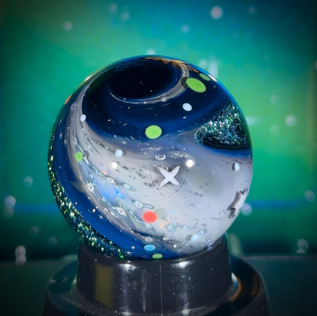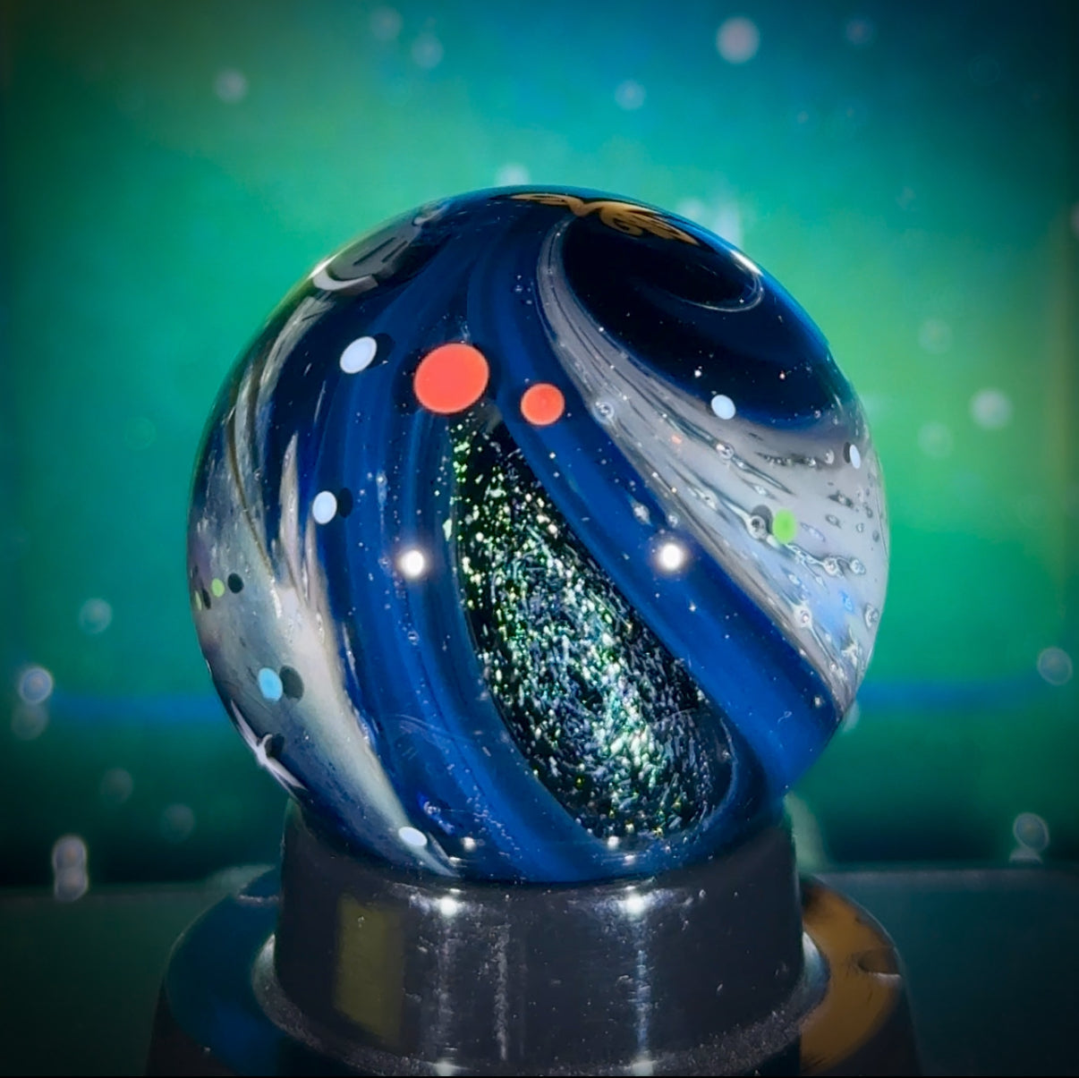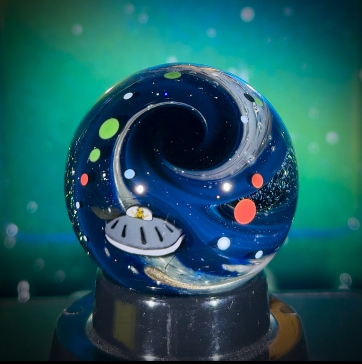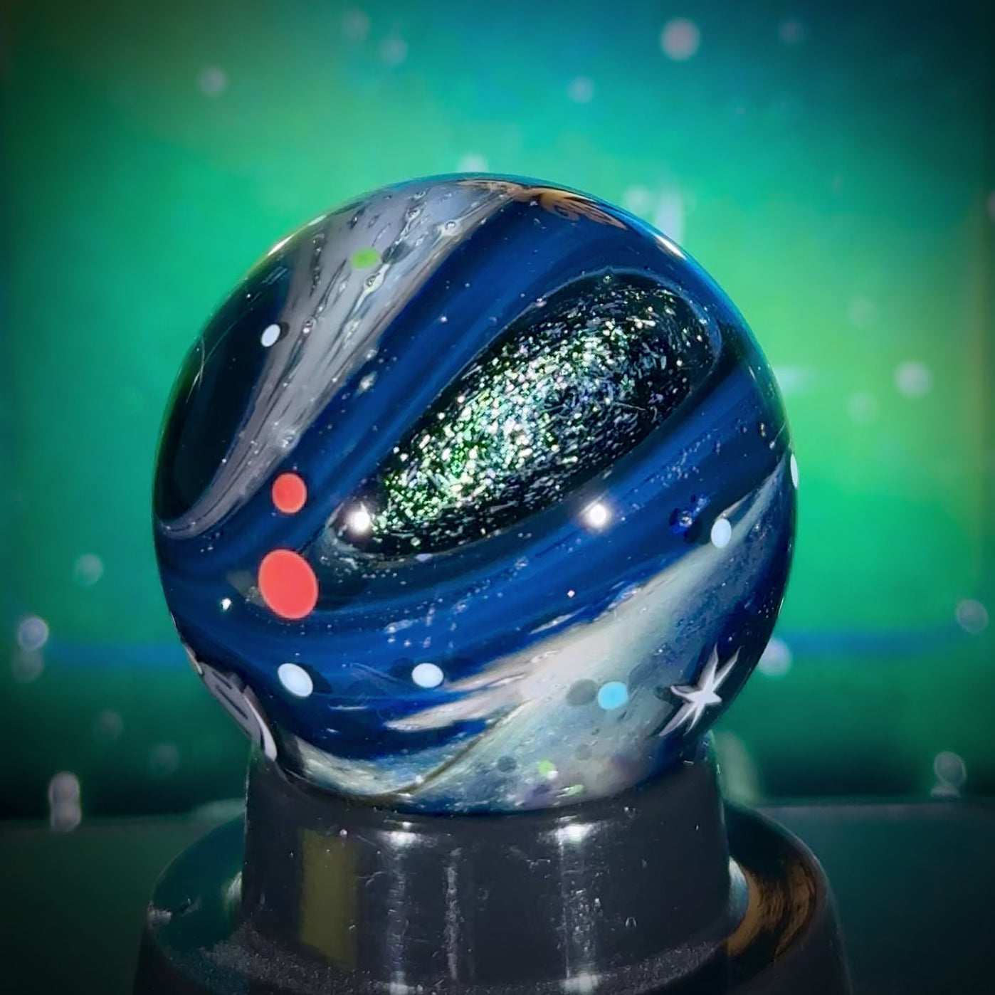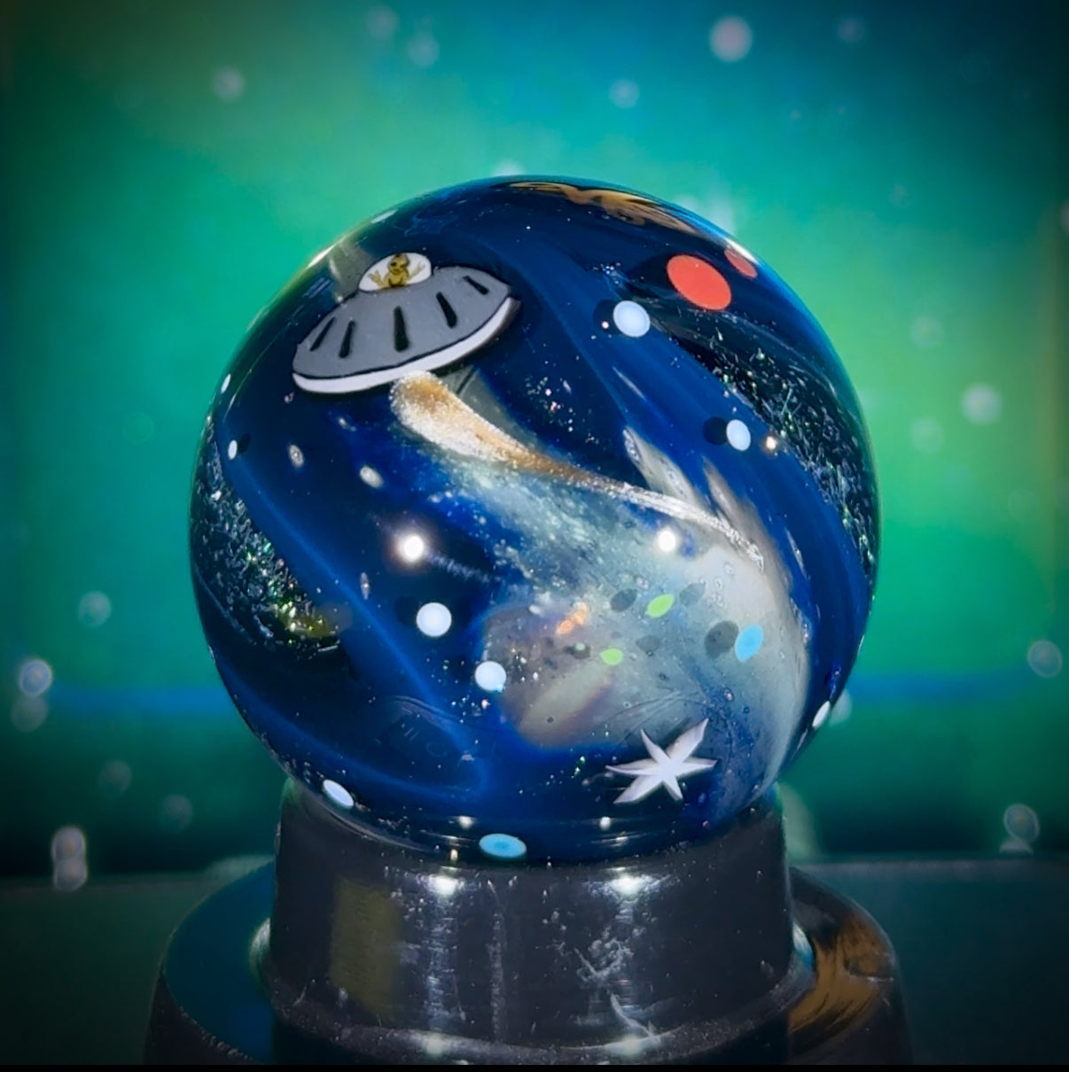 This is the Explorer Series marble featuring my new all-silver Project: Deep Space background detail (full blog writeup here). This one measures in at 32mm, and it includes two deep dichro galaxies, 3 star murrine, and the peaceful UFO with an Electrum Sparkle exhaust trail over a sparkling galaxy black background. Signed N8-XPL6 and includes a floating display box, acrylic stand, cleaning cloth, and stickers.