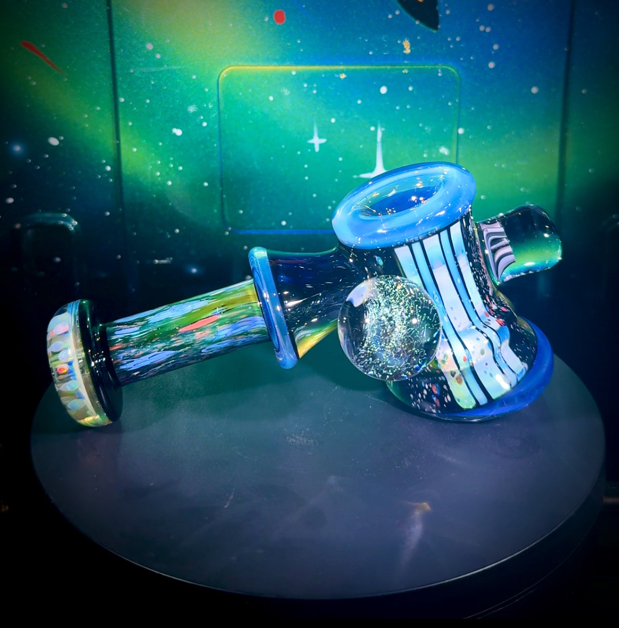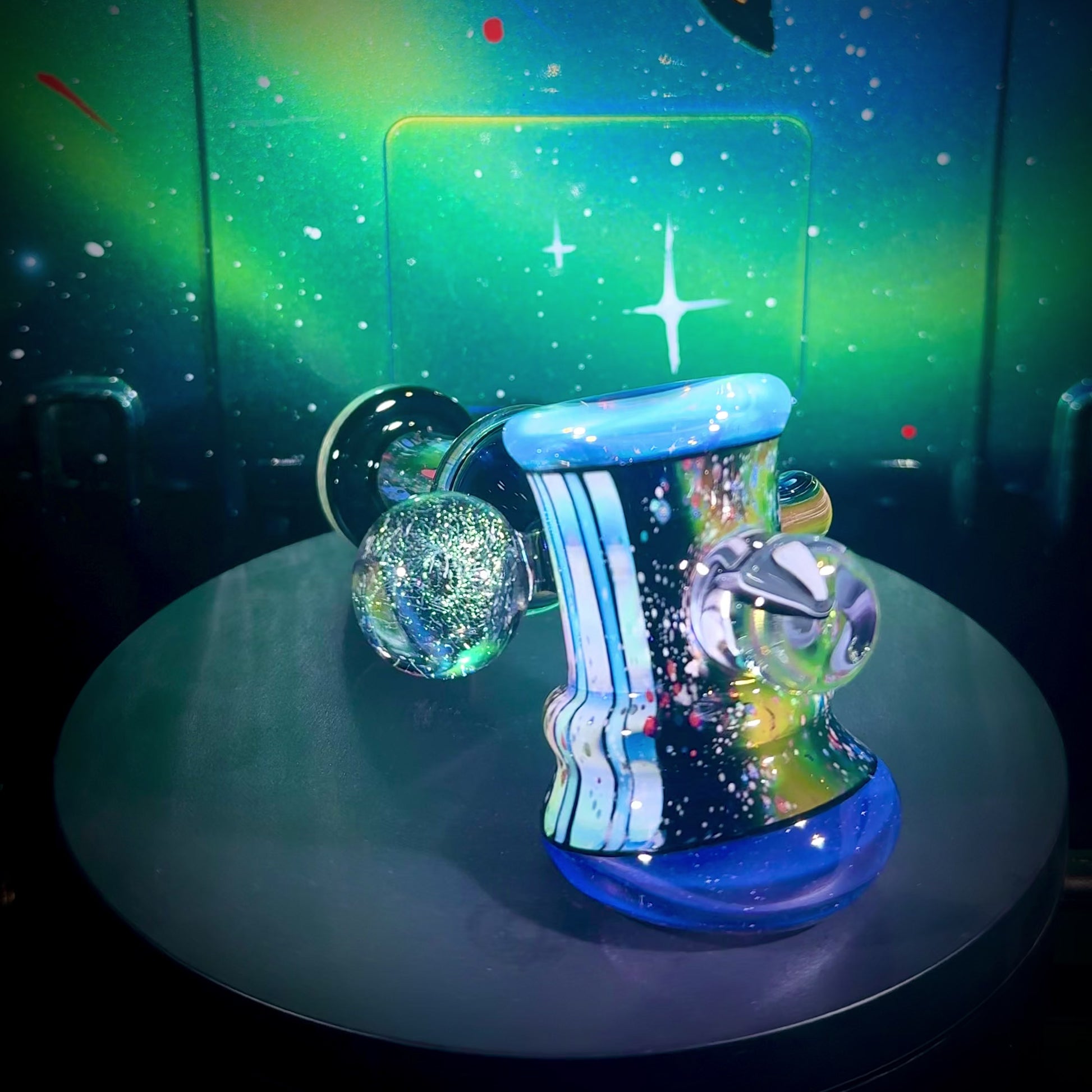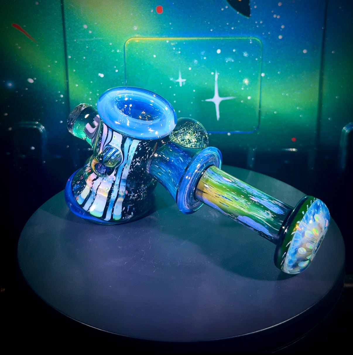 This Justin Carter x N8 Hammer features one of Justin's INSANE Staircase Opal implosions as the mouthpiece, and classic space throughout the body, with Xenomorph racing stripes running down the can. A 3 spiraling UFO's marble adorns the front with some trippy time-warp optics. Has a large dichro galaxy marble attachment with hidden 5-pointed star, and super-poppin' Meta-terrania accents with Eclipse incalmos.