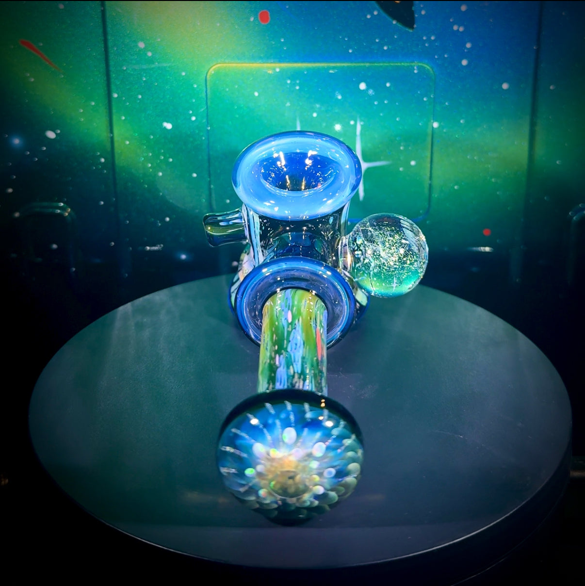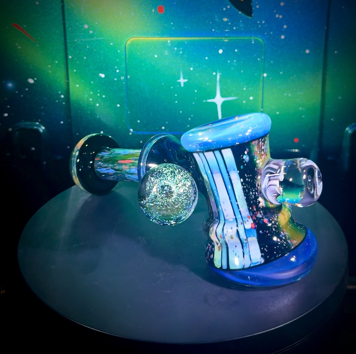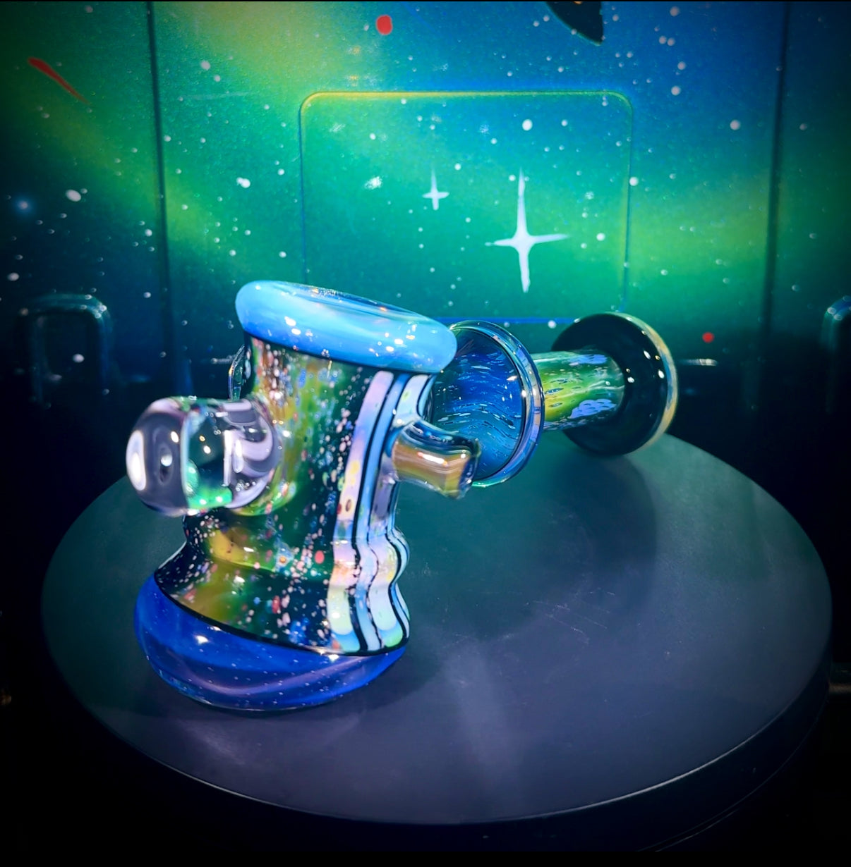 This Justin Carter x N8 Hammer features one of Justin's INSANE Staircase Opal implosions as the mouthpiece, and classic space throughout the body, with Xenomorph racing stripes running down the can. A 3 spiraling UFO's marble adorns the front with some trippy time-warp optics. Has a large dichro galaxy marble attachment with hidden 5-pointed star, and super-poppin' Meta-terrania accents with Eclipse incalmos.