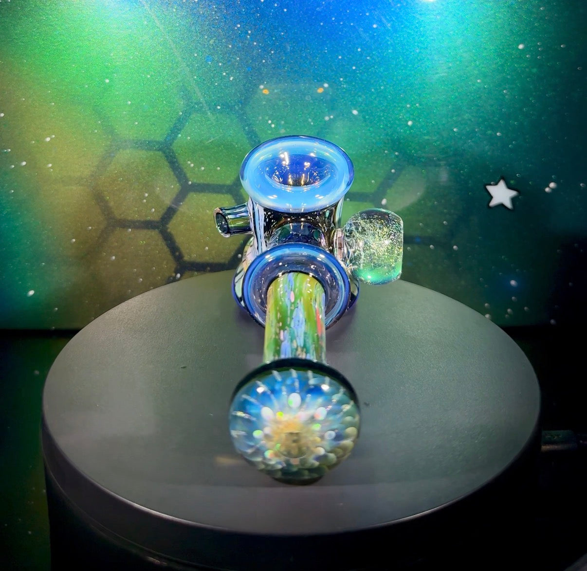 The centerpiece of this one-off dry piece is Justin's staircase opal implosion at the mouthpiece - the depth and dimension is unreal.The handle/can is classic space design with Xenomorph racing stripes (a rich ethereal multi-color from Molten Aura) running down both sides of the can. The front features a marble with three spiraling UFOs and some trippy time-warp optics with a cold-worked window.