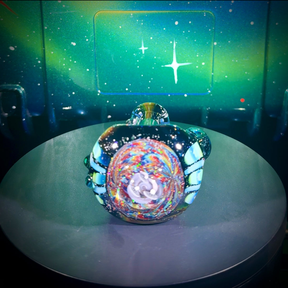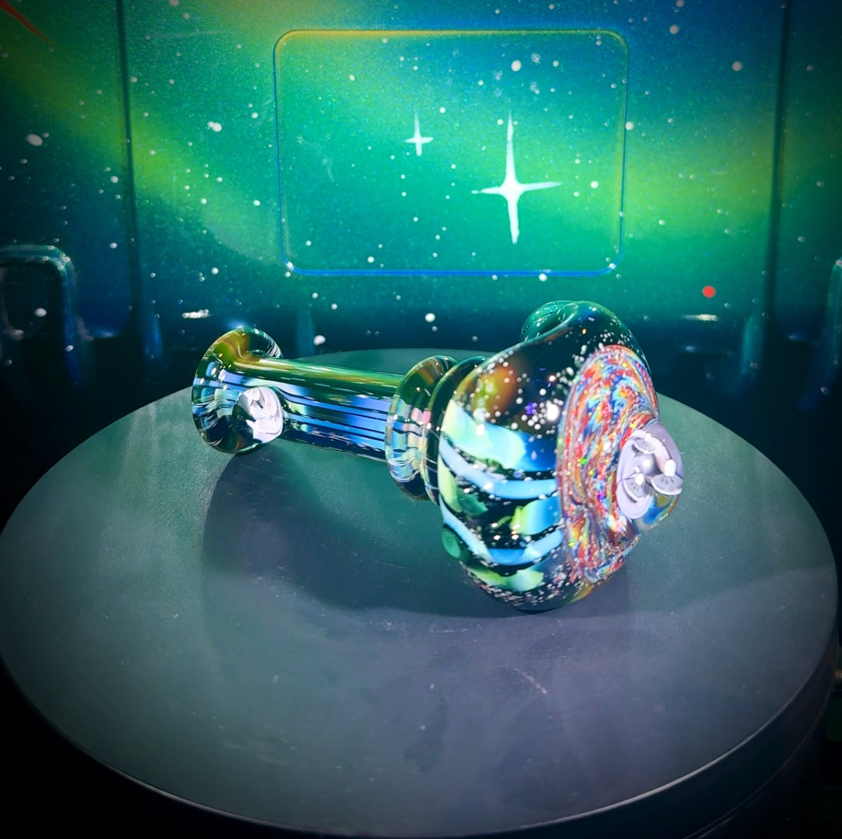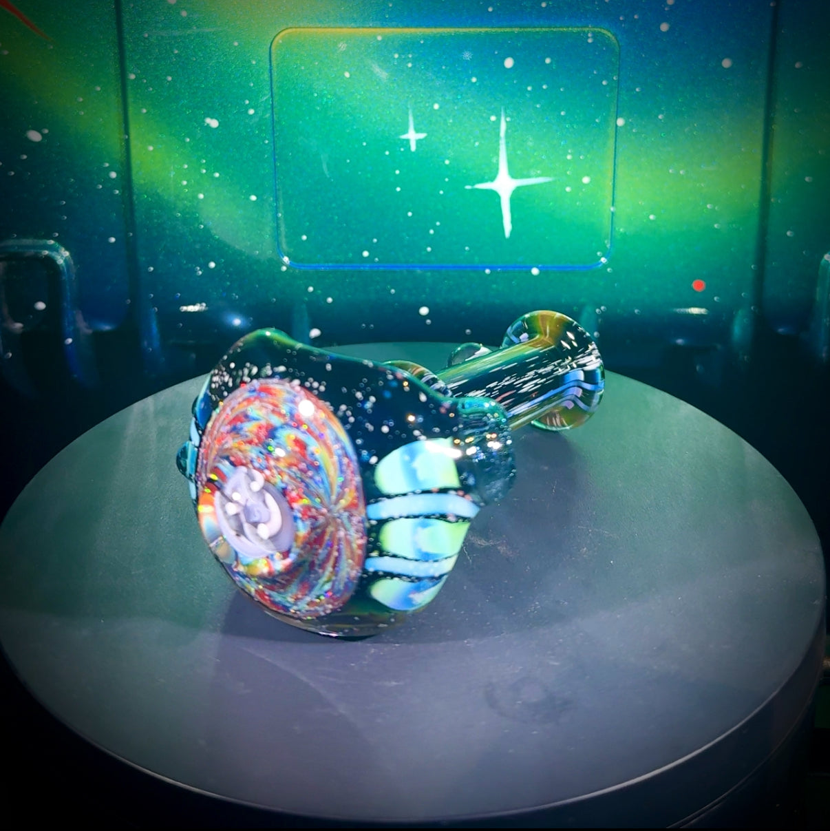 This Justin Carter x N8 Handpipe features one of Justin's groovy UV Ten-Strip Tech sections framed in with N8's Classic Space with Xenomorph racing stripes. Marbles include a 3 spiraling UFO's marble adorns the front, and a 3 spiraling stars marble near the mouthpiece. A UV Atomic Stardust carb w/7mm hole. Mouthpiece is 5.5mm. 3/4" bowl push w/3mm bowl hole. Weighs in at 2.6oz. Measures in at 4" from tip to tip.