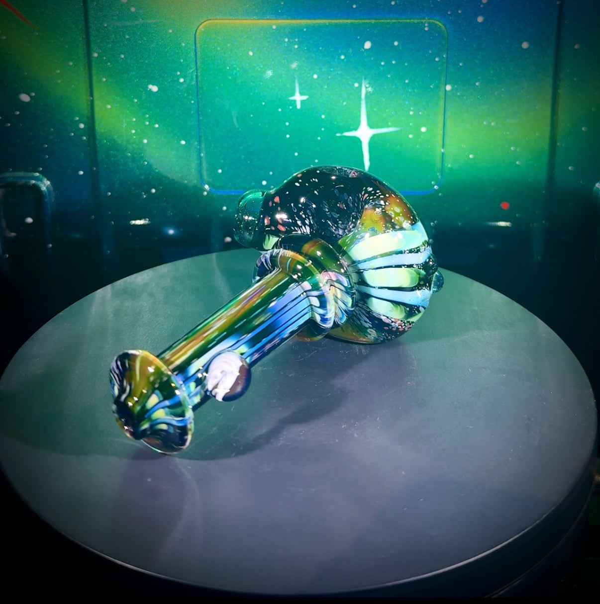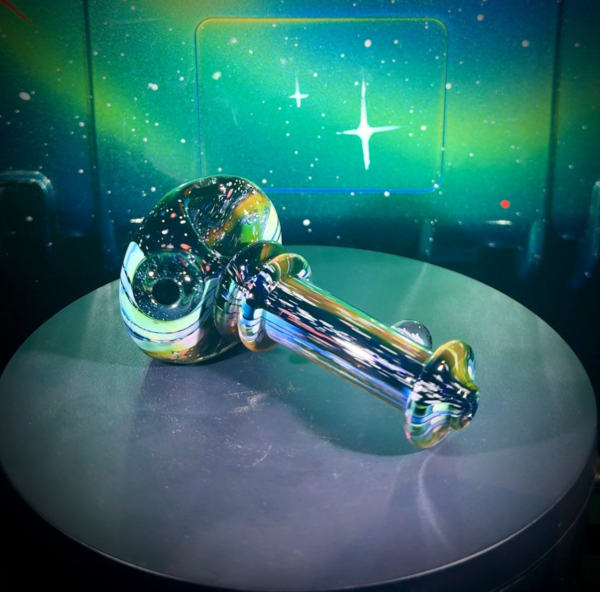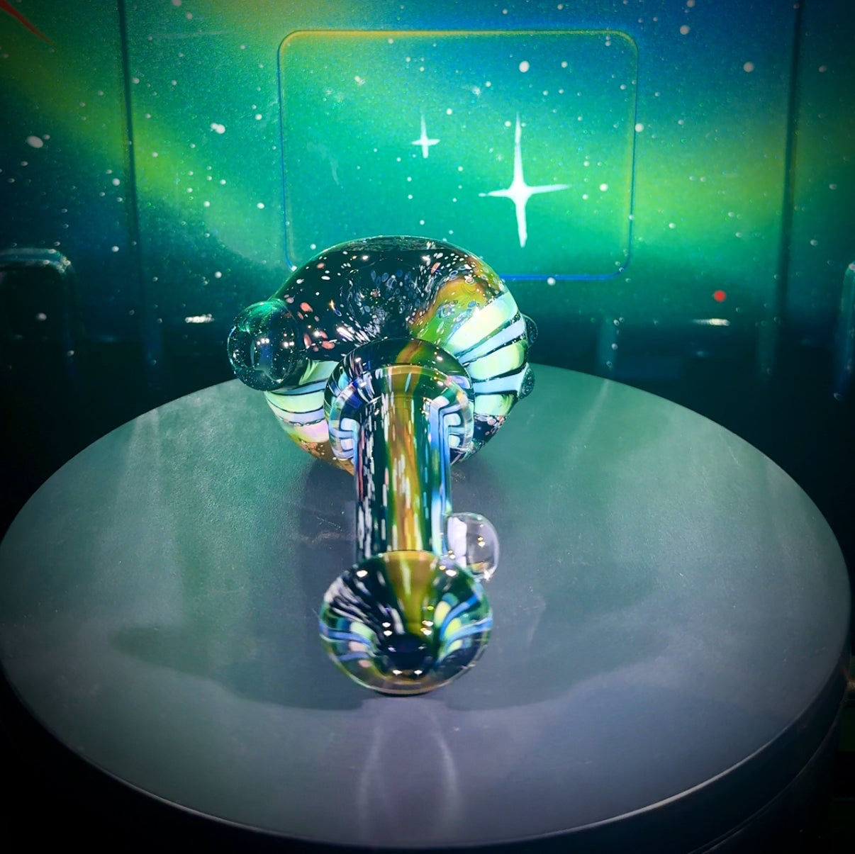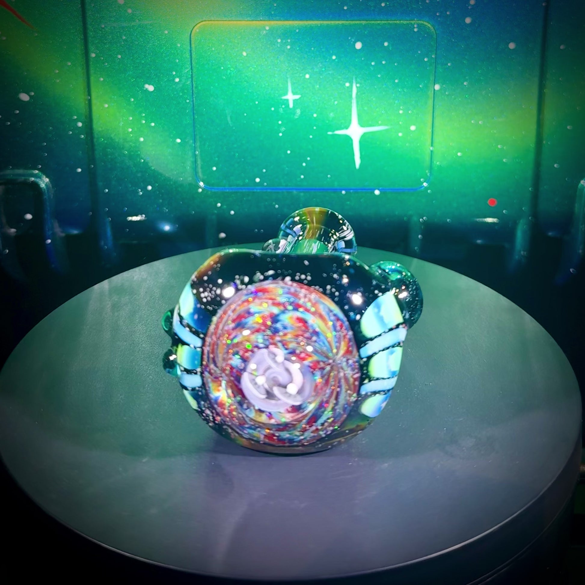 This Justin Carter x N8 Handpipe features one of Justin's groovy UV Ten-Strip Tech sections framed in with N8's Classic Space with Xenomorph racing stripes. Marbles include a 3 spiraling UFO's marble adorns the front, and a 3 spiraling stars marble near the mouthpiece. A UV Atomic Stardust carb w/7mm hole. Mouthpiece is 5.5mm. 3/4" bowl push w/3mm bowl hole. Weighs in at 2.6oz. Measures in at 4" from tip to tip.