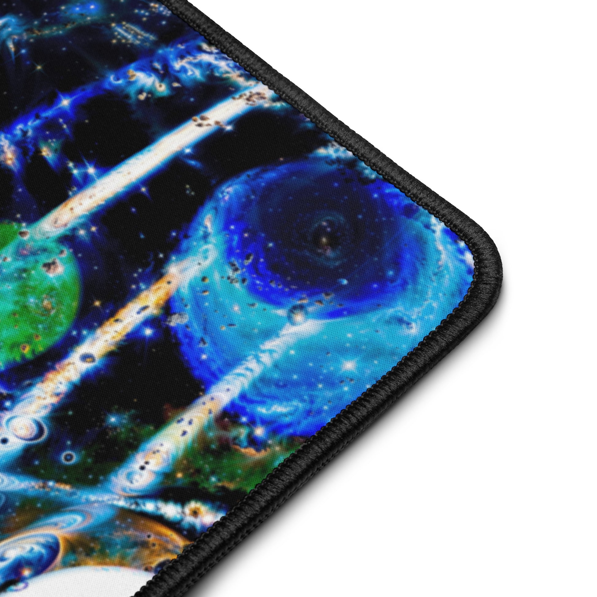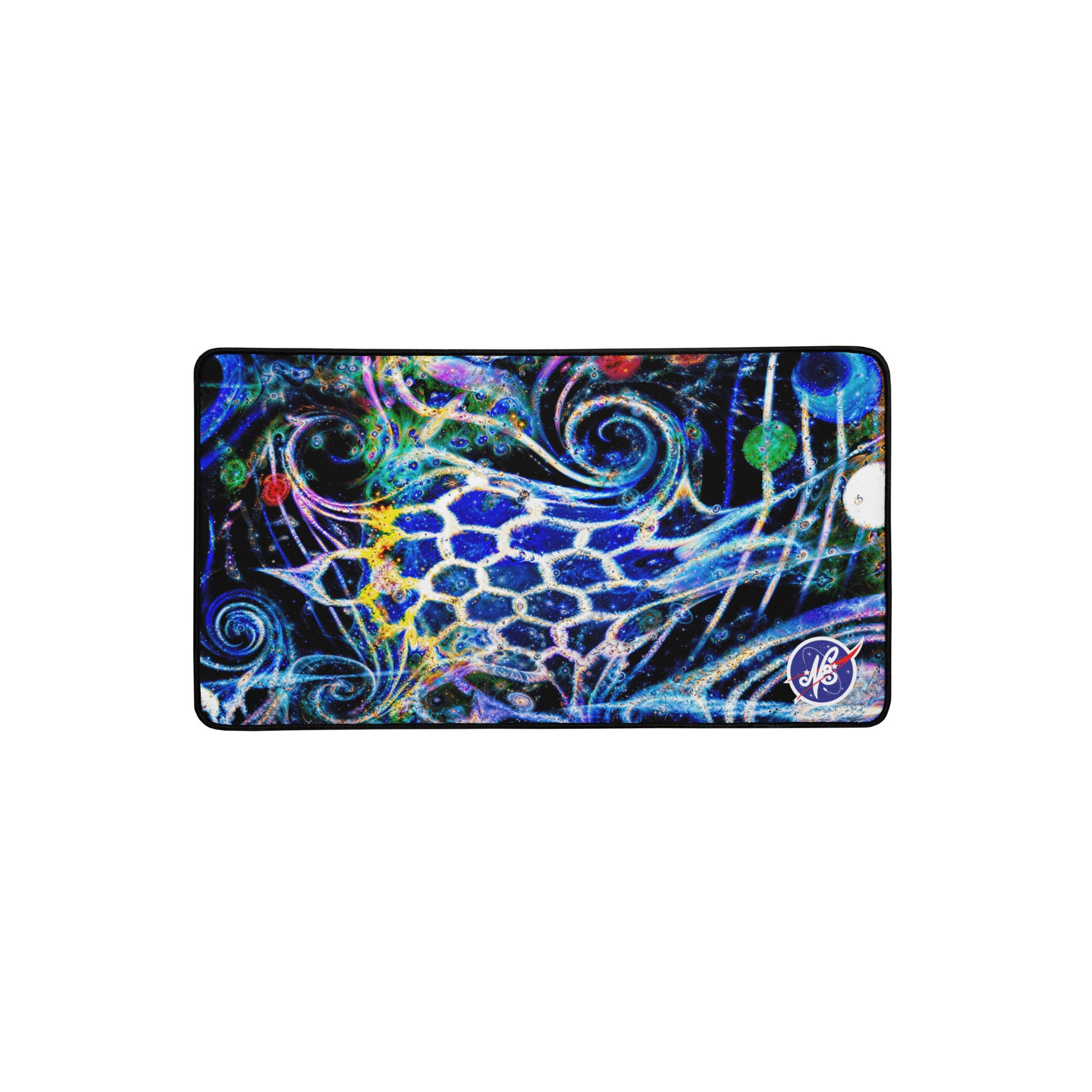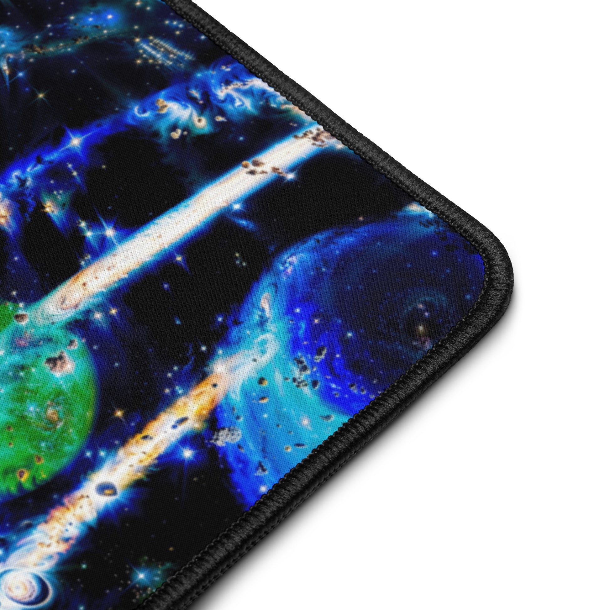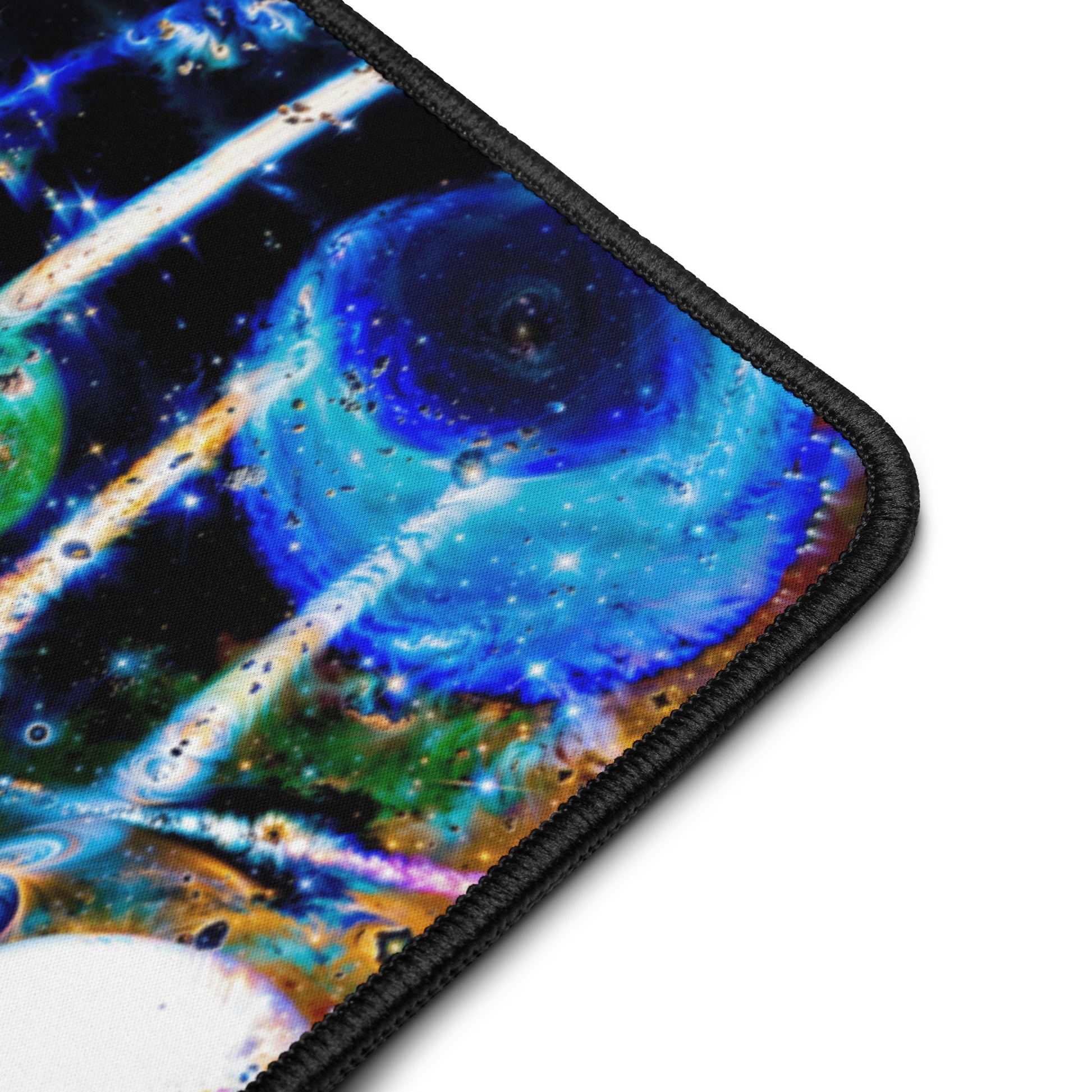 Perfect for galactic gaming sessions, or conquering cosmic computational projects at your desktop, this smooth, anti-slip surface locks your setup in orbit. These fully expansive images of N8's Intergalactic glass work offer light-years of space with vibrant edge-to-edge designs, while the hemmed edges ensure your mat stays intact through your all-nighter side quests.