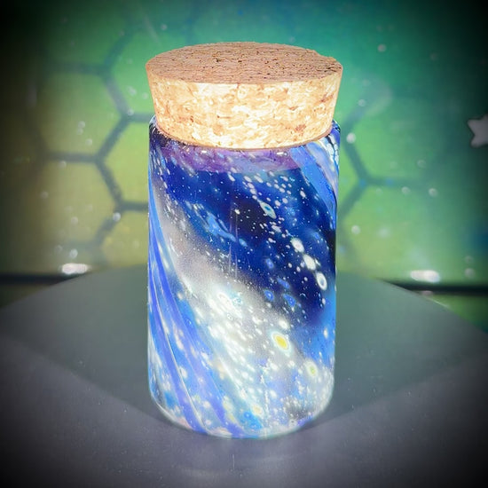 Double-sided silver fume-only Deep Space design over Turbo Amethyst - enjoy the cosmic vibes from the outside and inside. Cylinder-shaped vessel with cork lid included. Ti-signed N8-26. Measures 1-5/8" Wide x 2-1/2" Tall.
