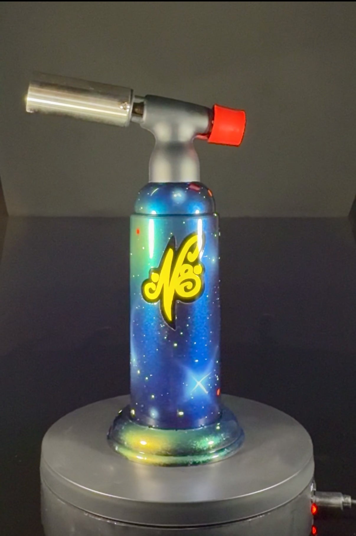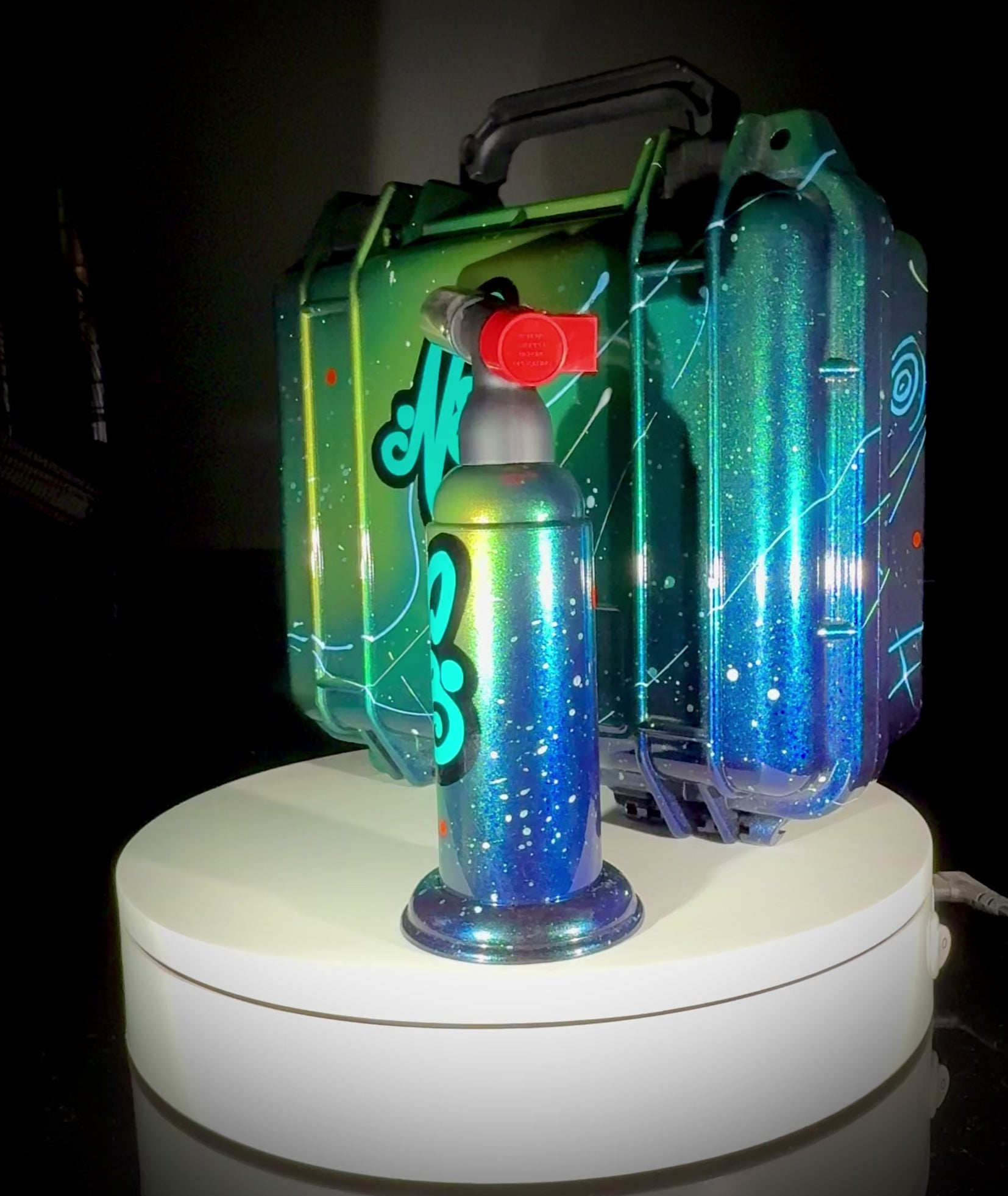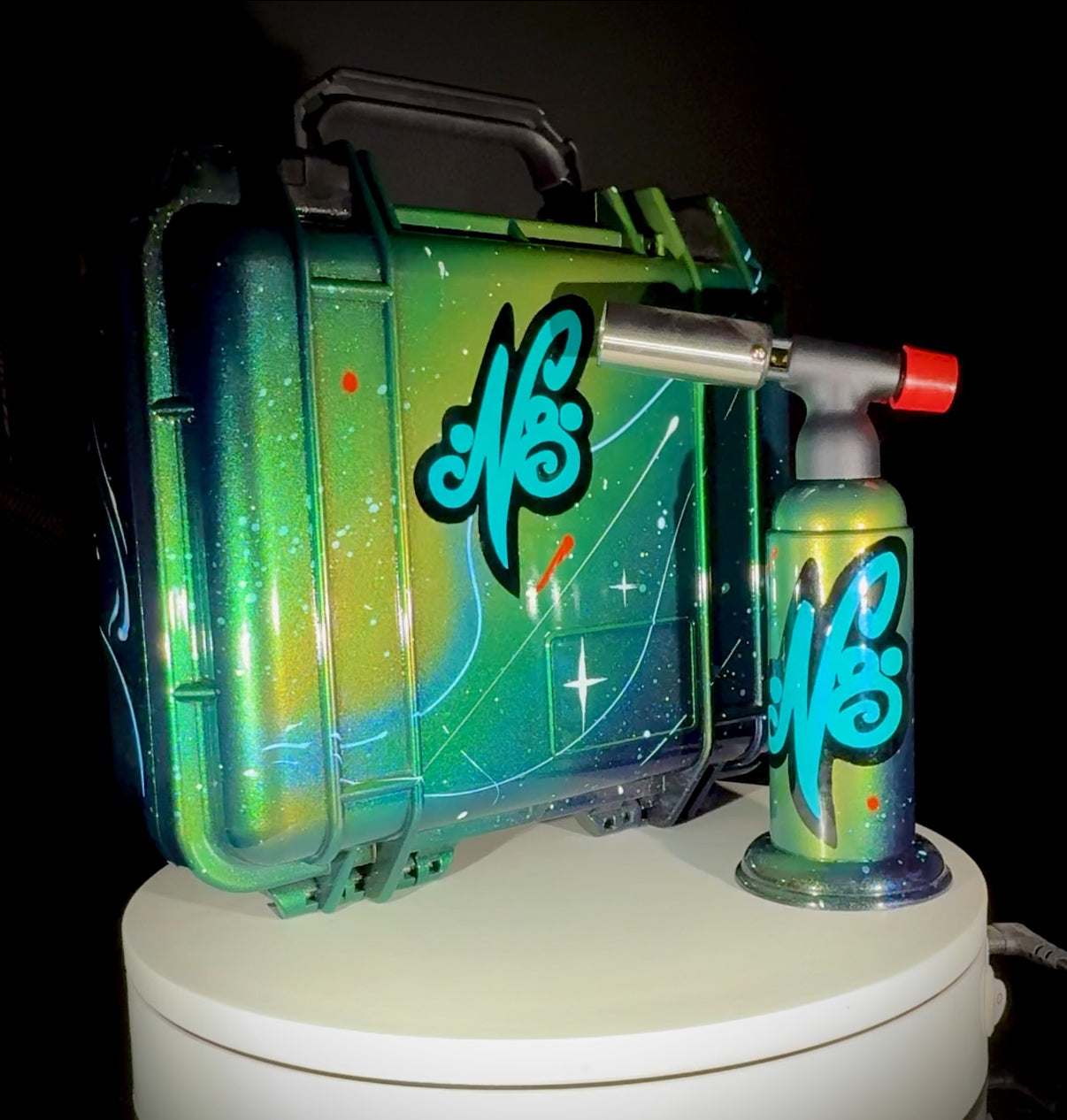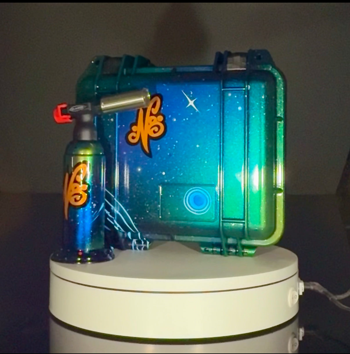 These N8-branded Pelican Brand 1200 cases and Blazer Big Shot torches were custom painted by Beyond Grasp to match N8's Intergalactic style. This isn't just spray paint either! This is a very high-quality and durable automotive paint and clear coat, ensuring your set will look good for a very very very very long time...no matter what conditions your space travels take you thru!