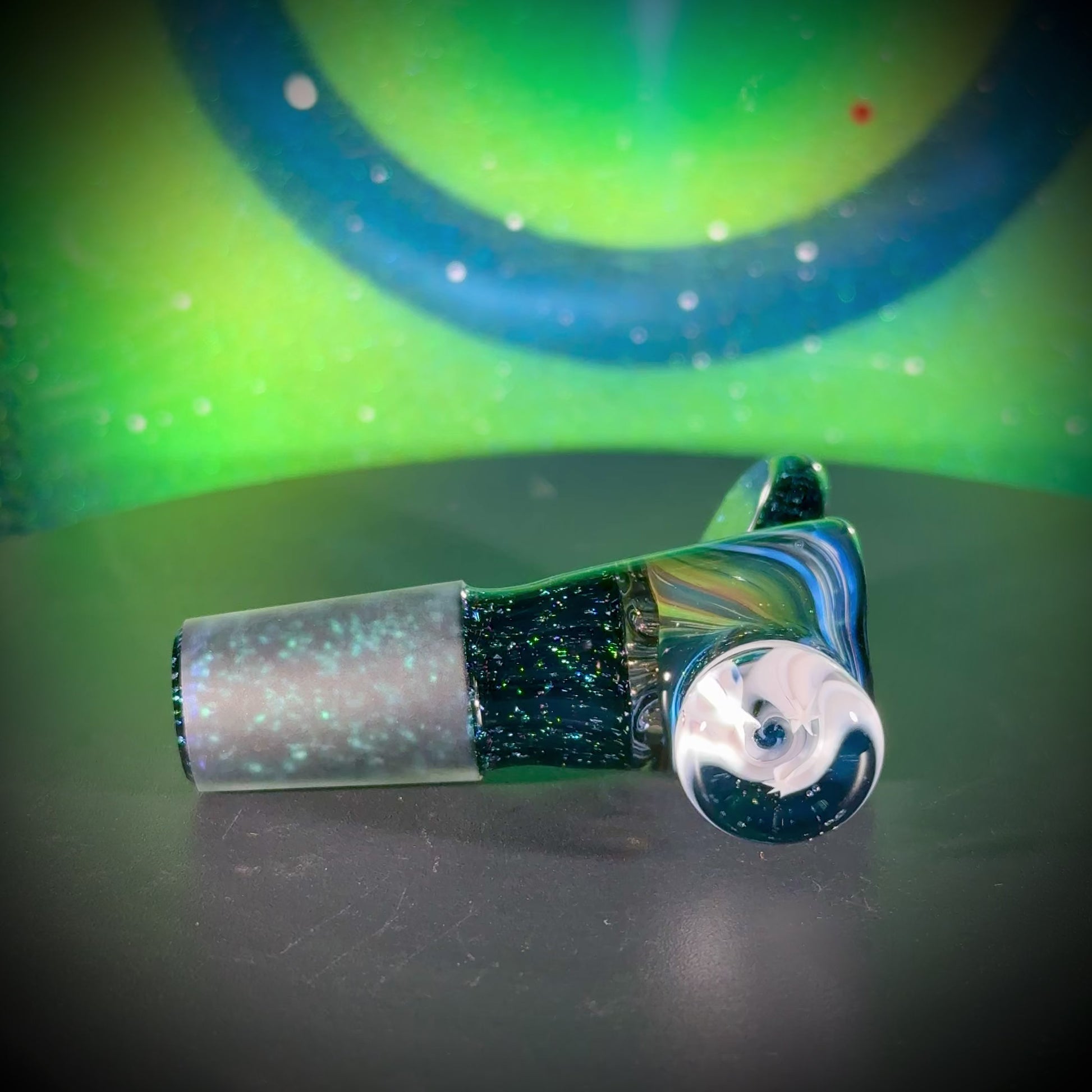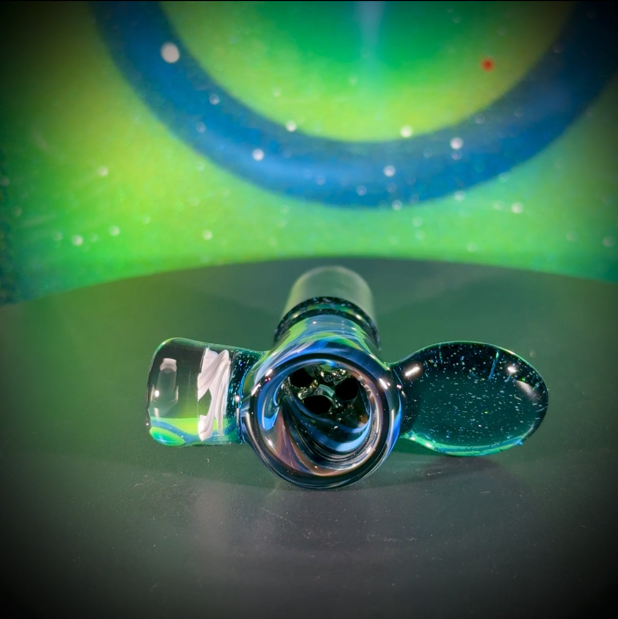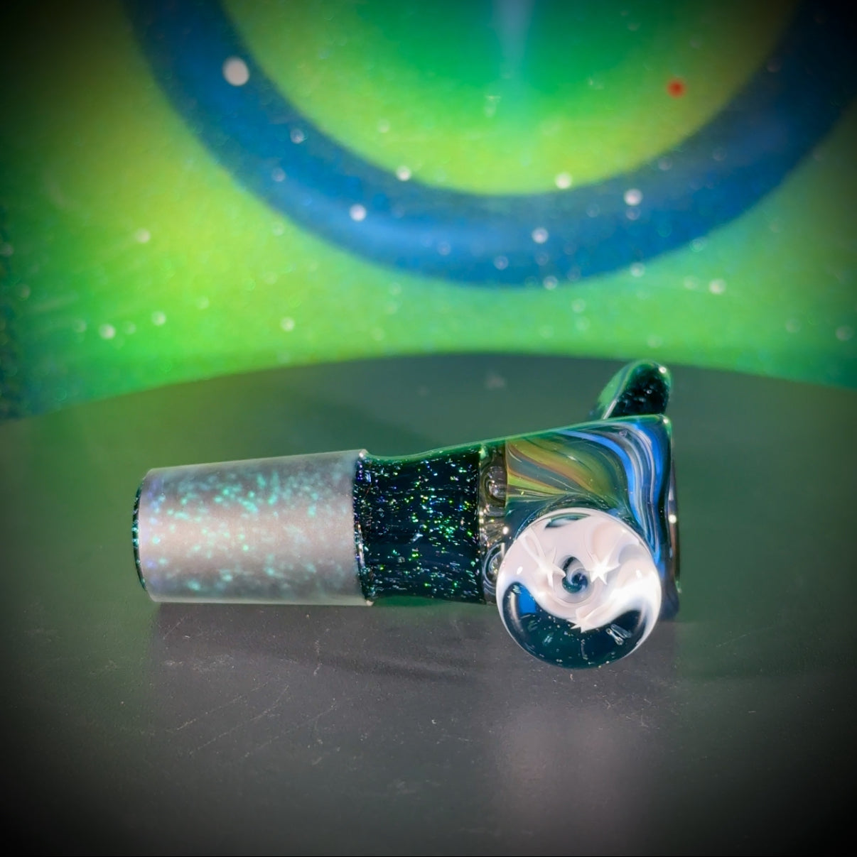 4-hole slide w/14mm dichro joint. Double-sided 'Multiverse' Classic Space reversal bowl. Atomic Stardust Sparkle (UV) Handle and 3-Spiraling Stars marble.