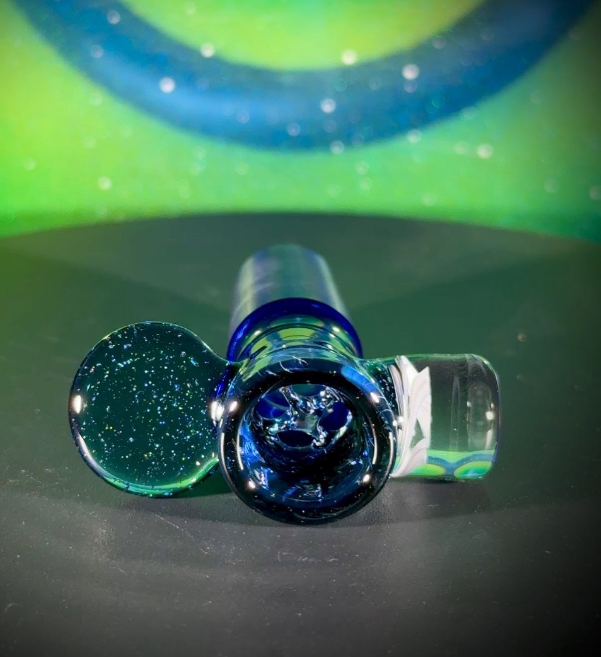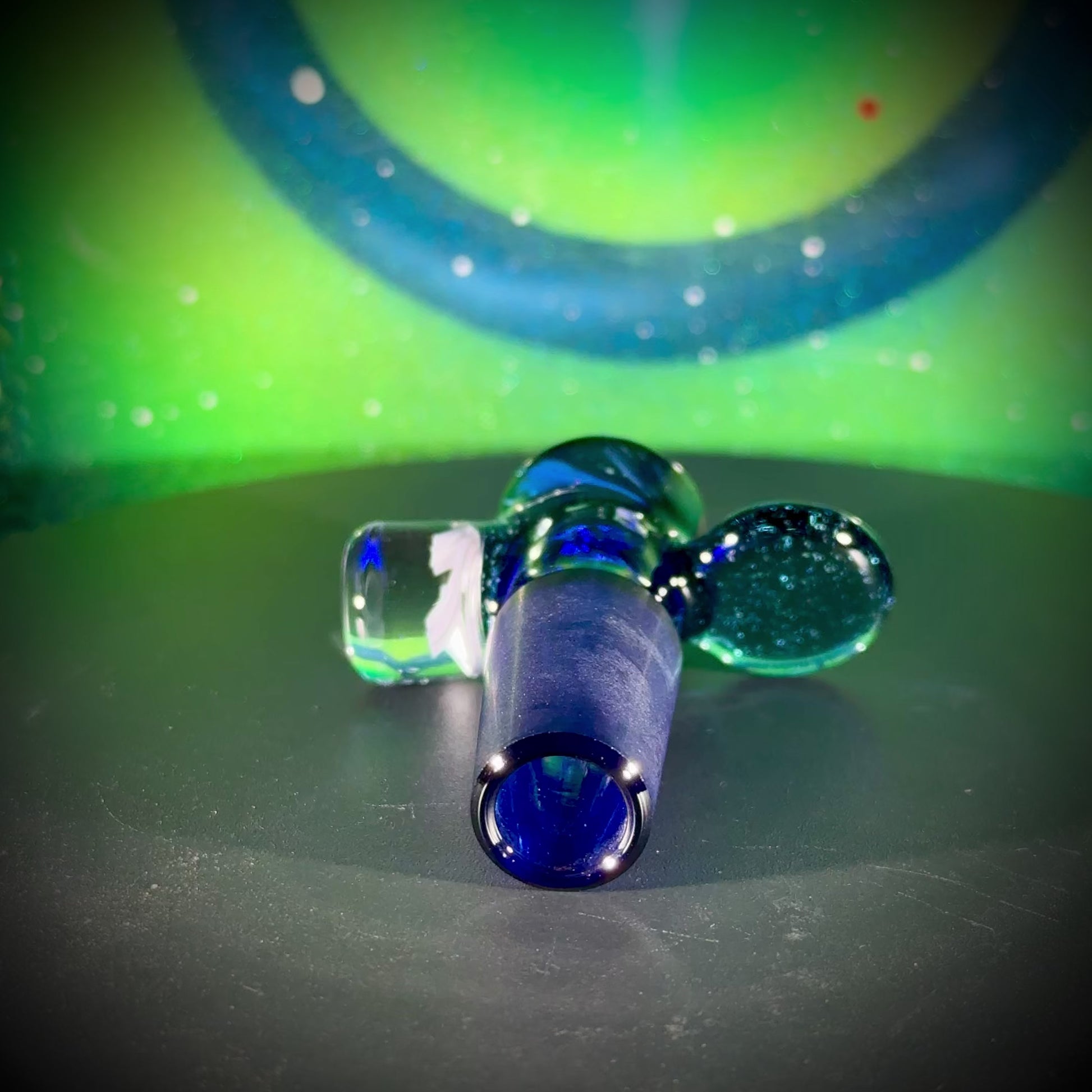 4-hole slide w/14mm cobalt joint. Double-sided 'Multiverse' Deep Space pattern. Atomic Stardust Sparkle (UV) Handle and 3-Spiraling Stars marble.