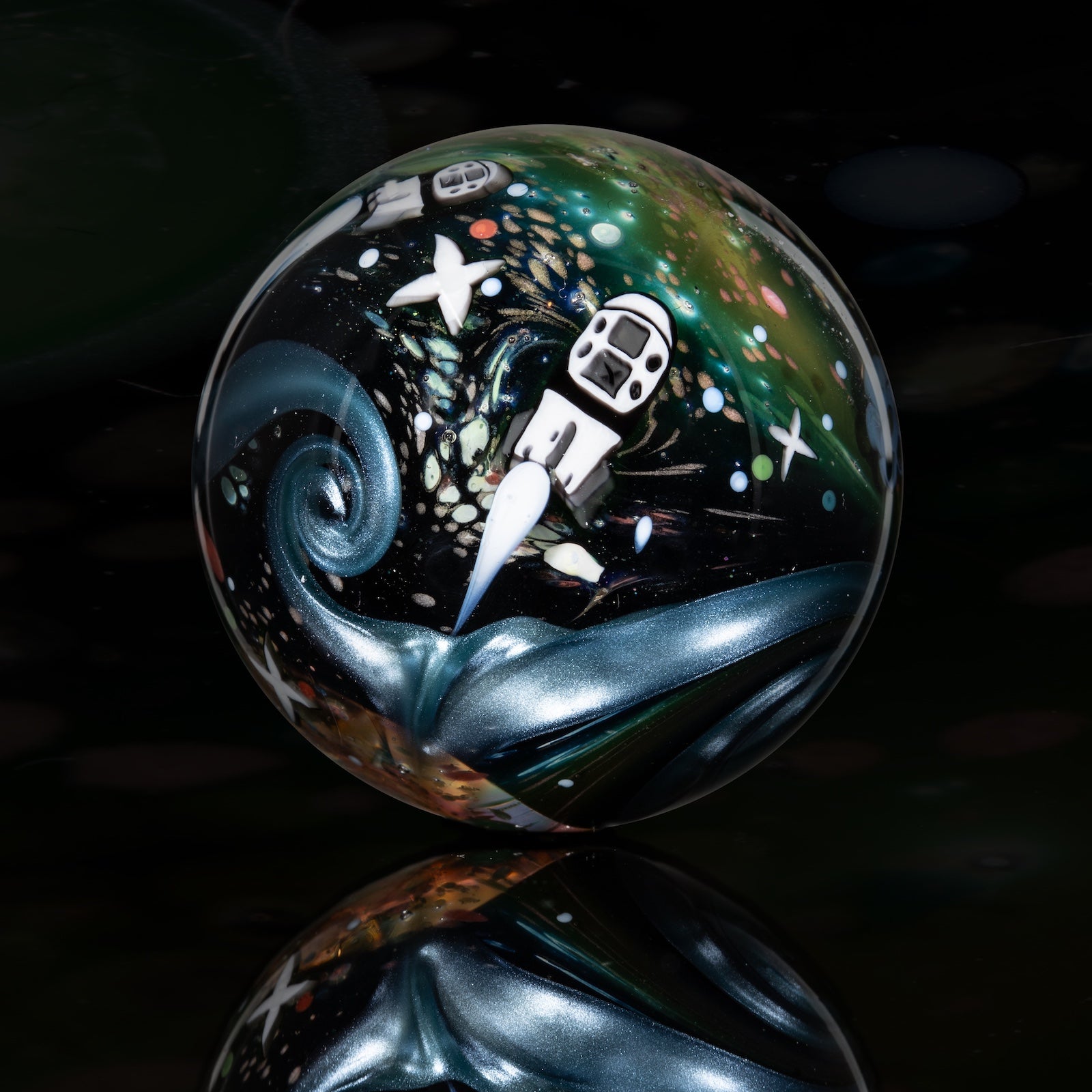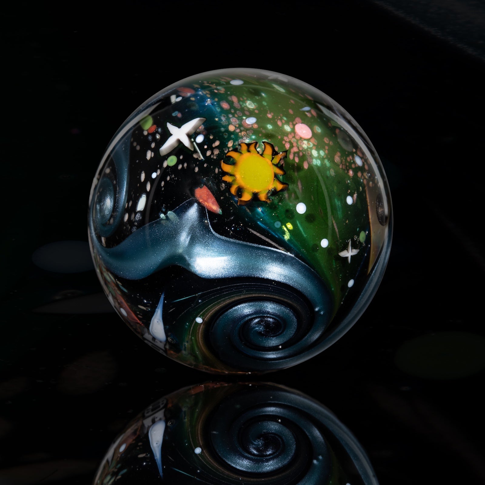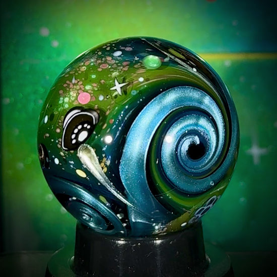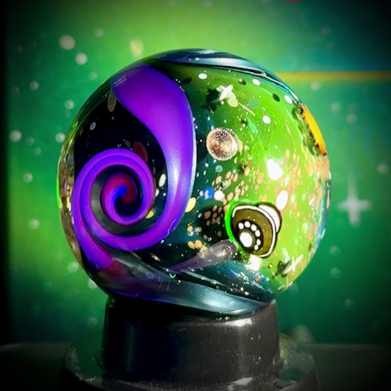 This NU marble includes an LED-lit magnifying loupe, a pocket UV flashlight, a floating display box and stand, cleaning cloth, stickers, and thank you card with the marble/series details. Priority shipping included. Ti-signed ‘N8 NU-24’