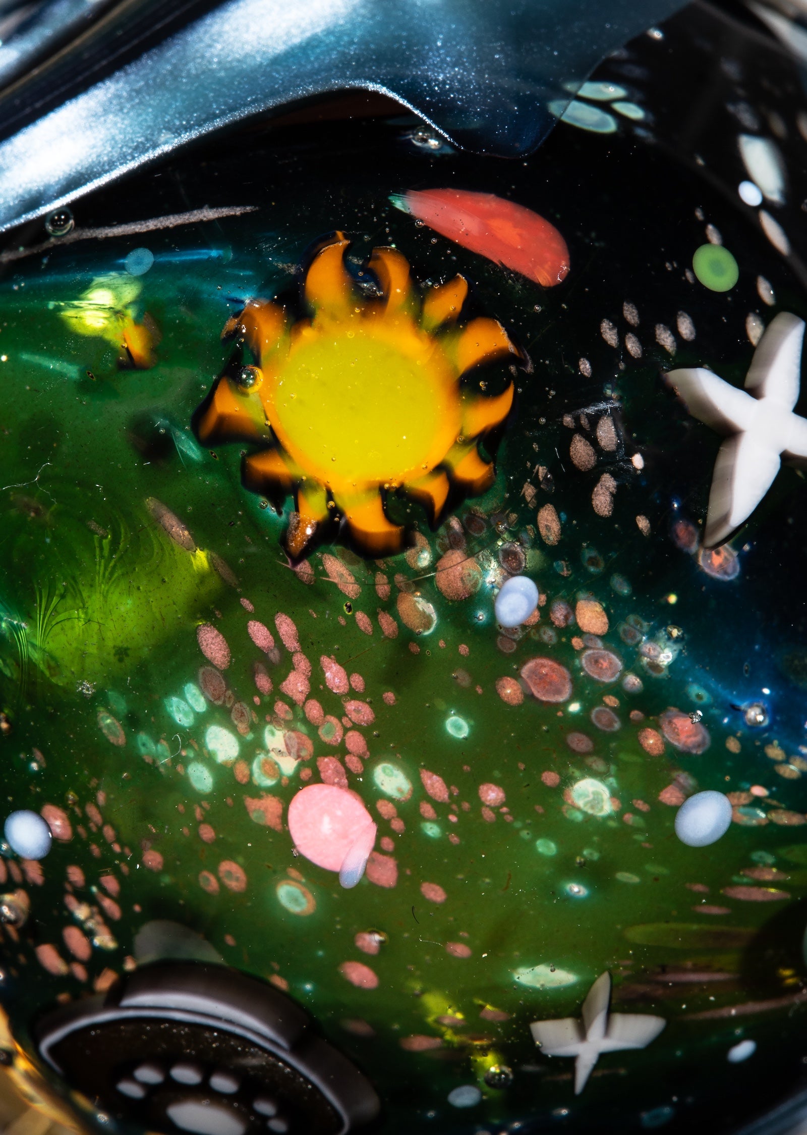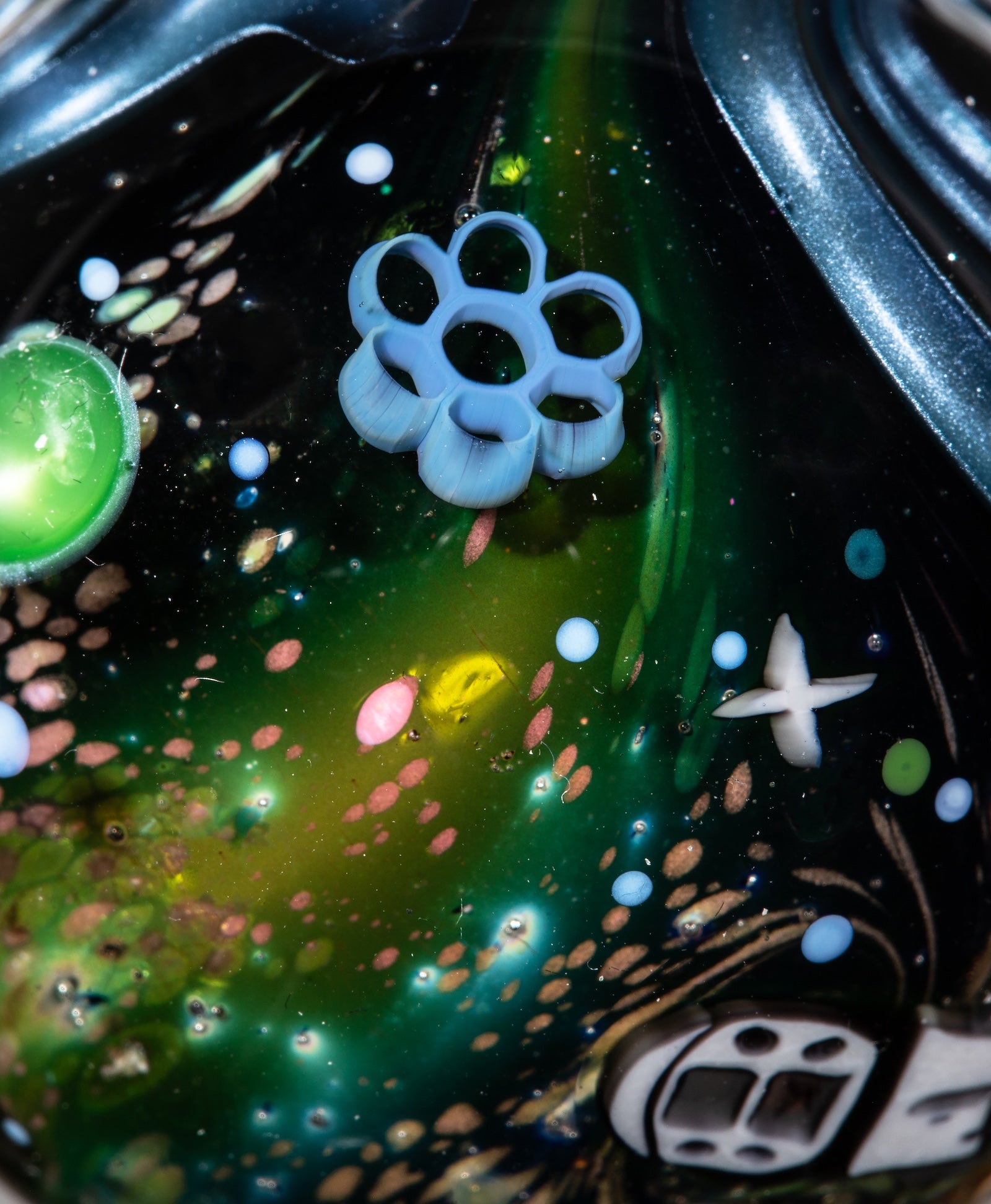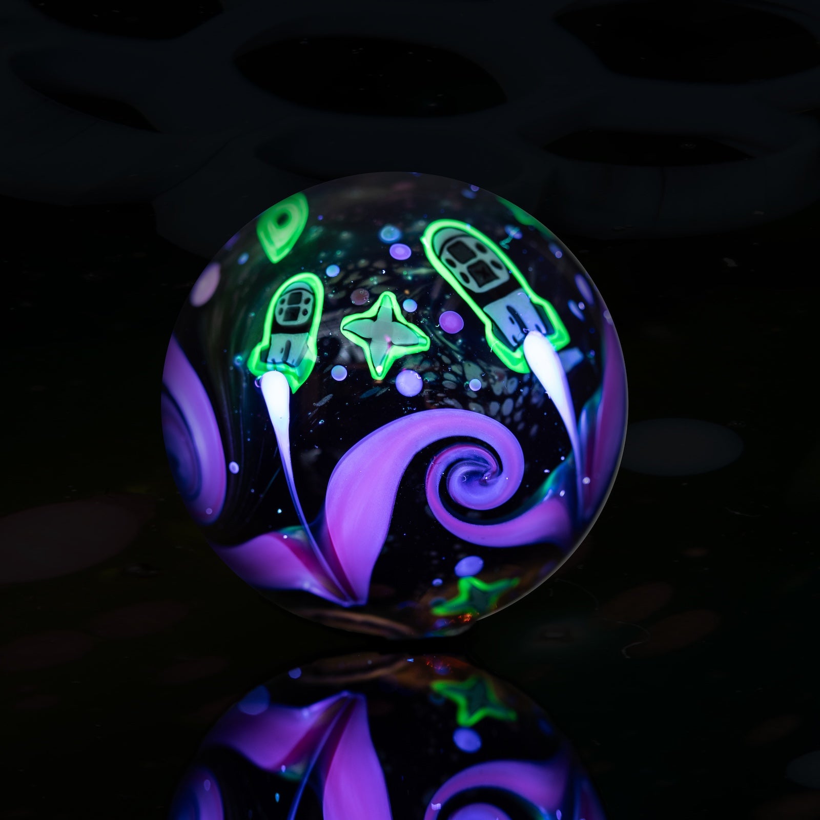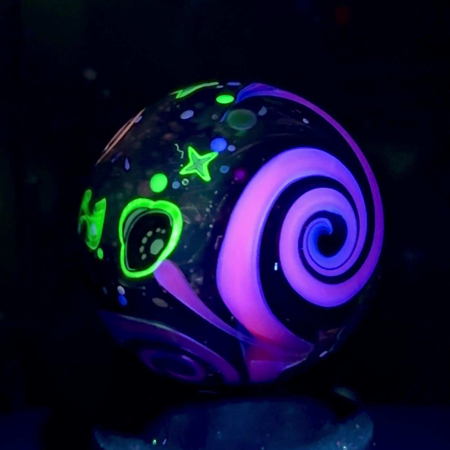 A Blue Dreamingo UV layer over Neptunium creates a vivid purple UV band that separates the two sides, and the background is a Black Galaxy Sparkle). Measures in at 37mm & some change.