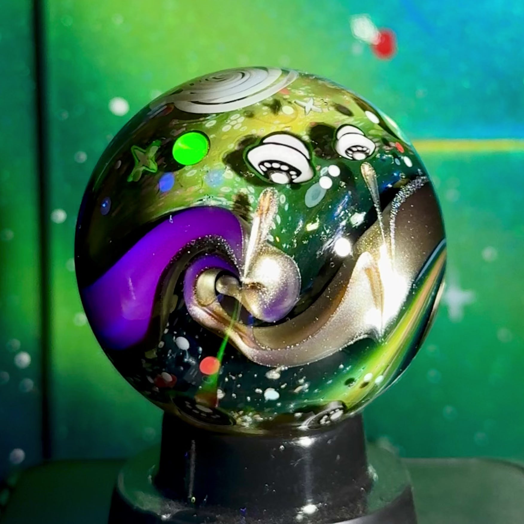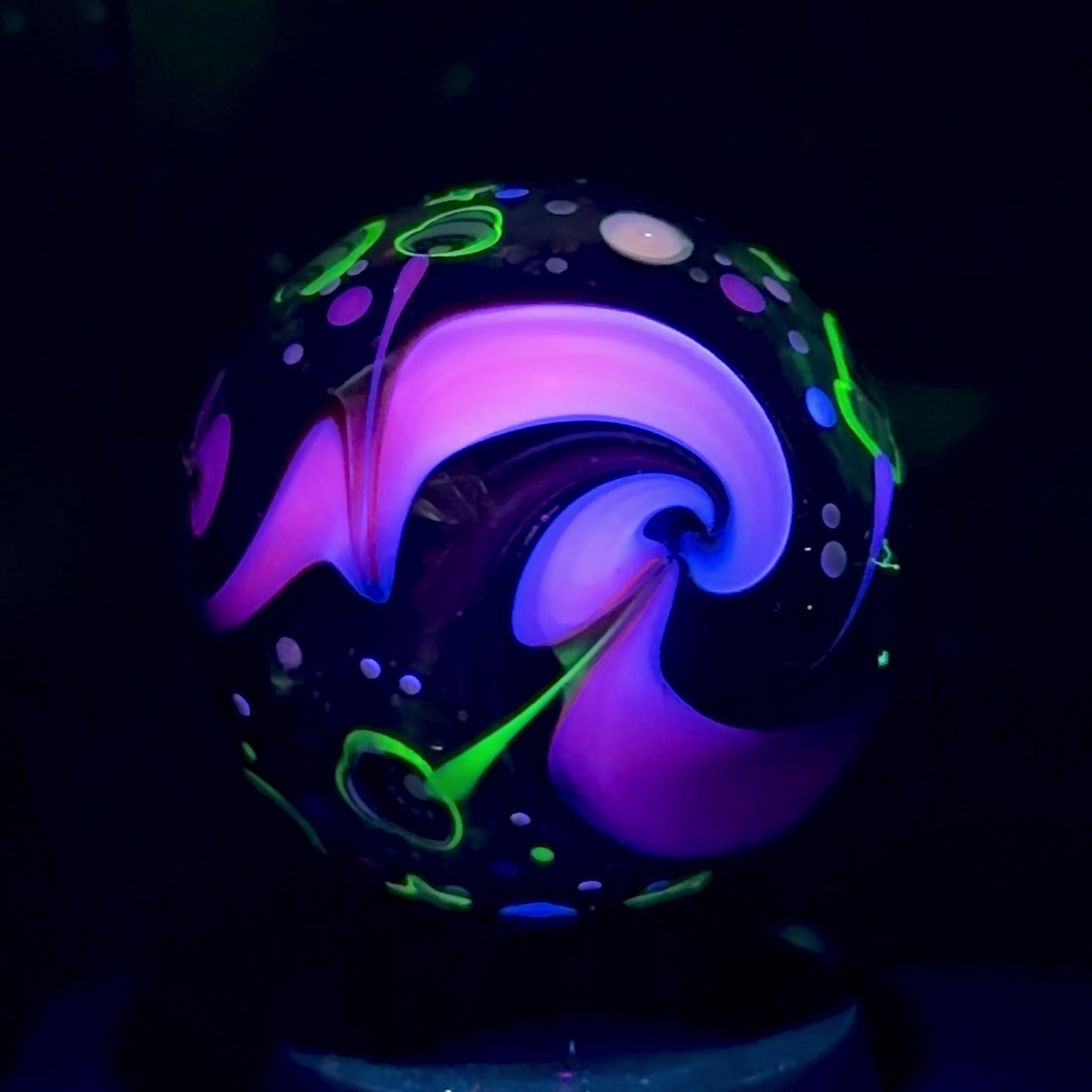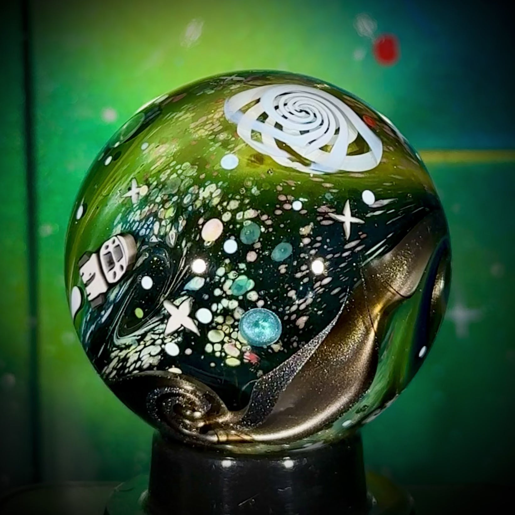 This NU marble includes an LED-lit magnifying loupe, a pocket UV flashlight, a floating display box and stand, cleaning cloth, stickers, and thank you card with the marble/series details. Priority shipping included. Ti-signed ‘N8 NU-25’