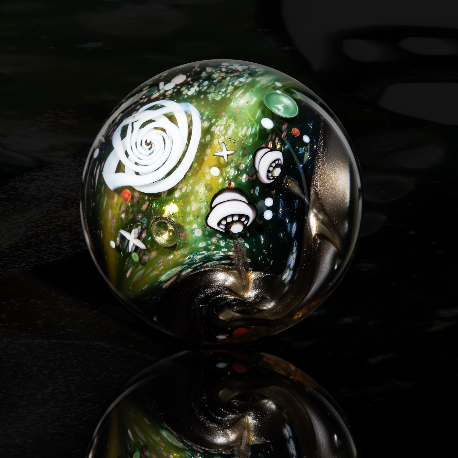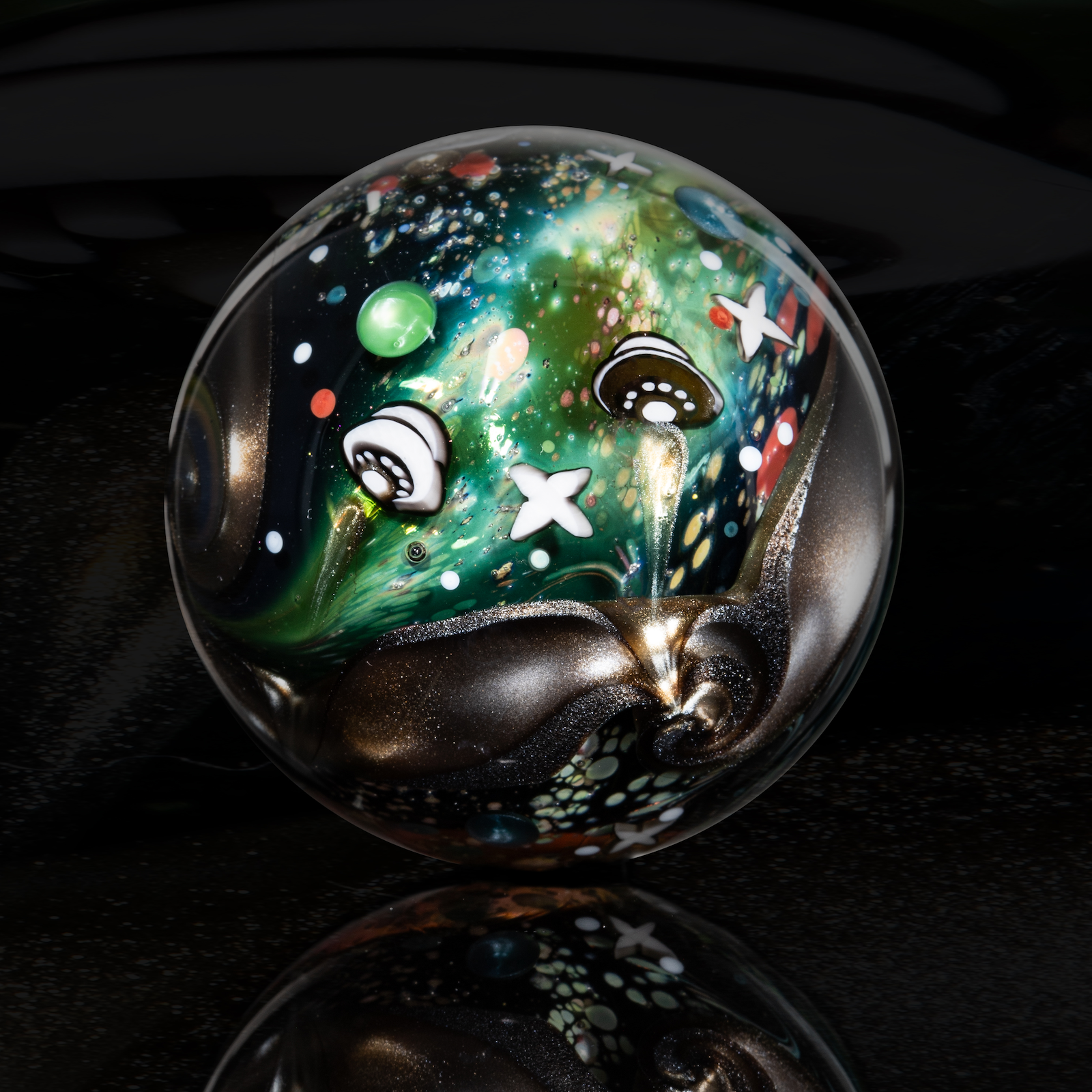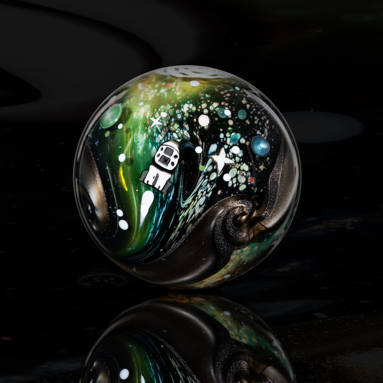 This NU marble includes an LED-lit magnifying loupe, a pocket UV flashlight, a floating display box and stand, cleaning cloth, stickers, and thank you card with the marble/series details. Priority shipping included. Ti-signed ‘N8 NU-25’
