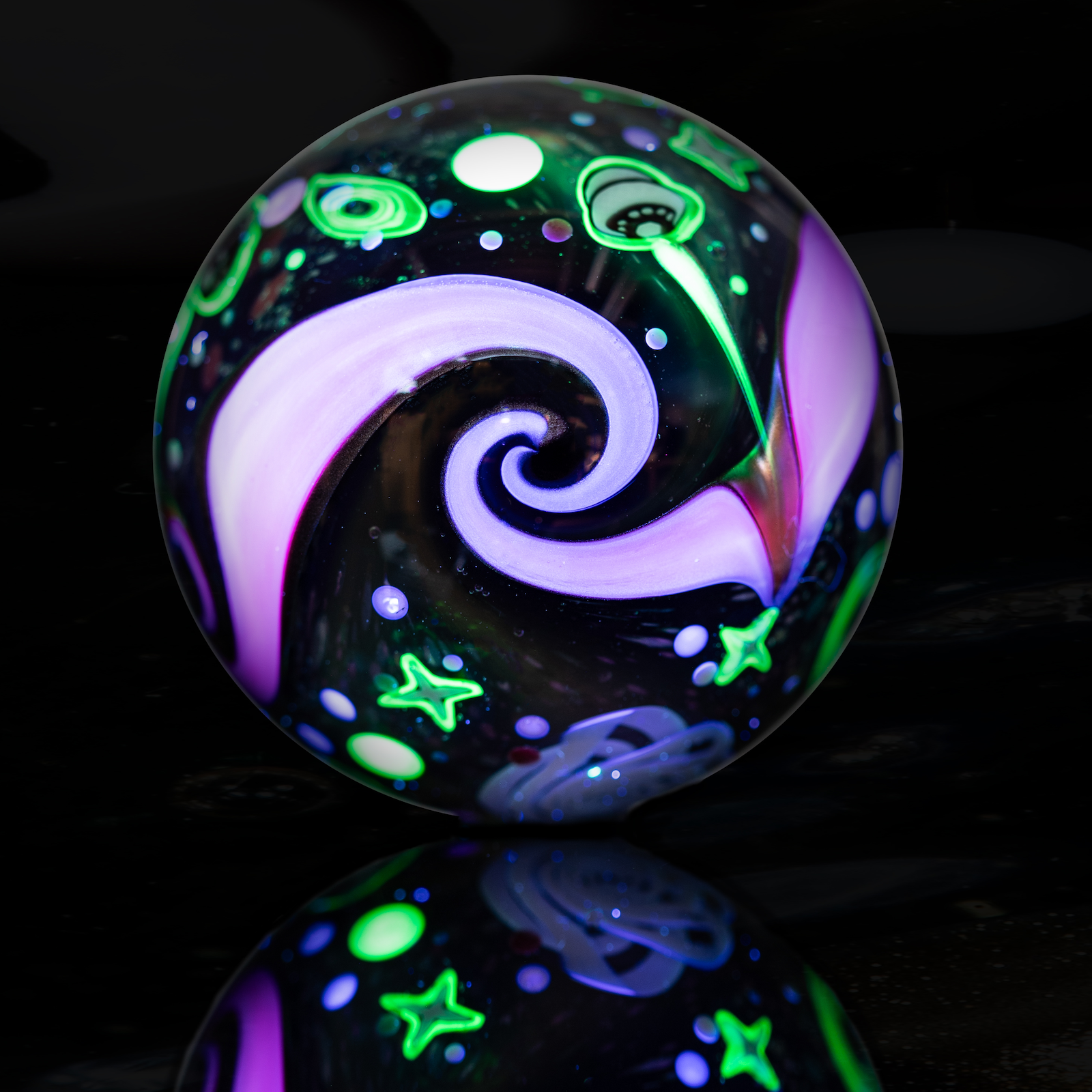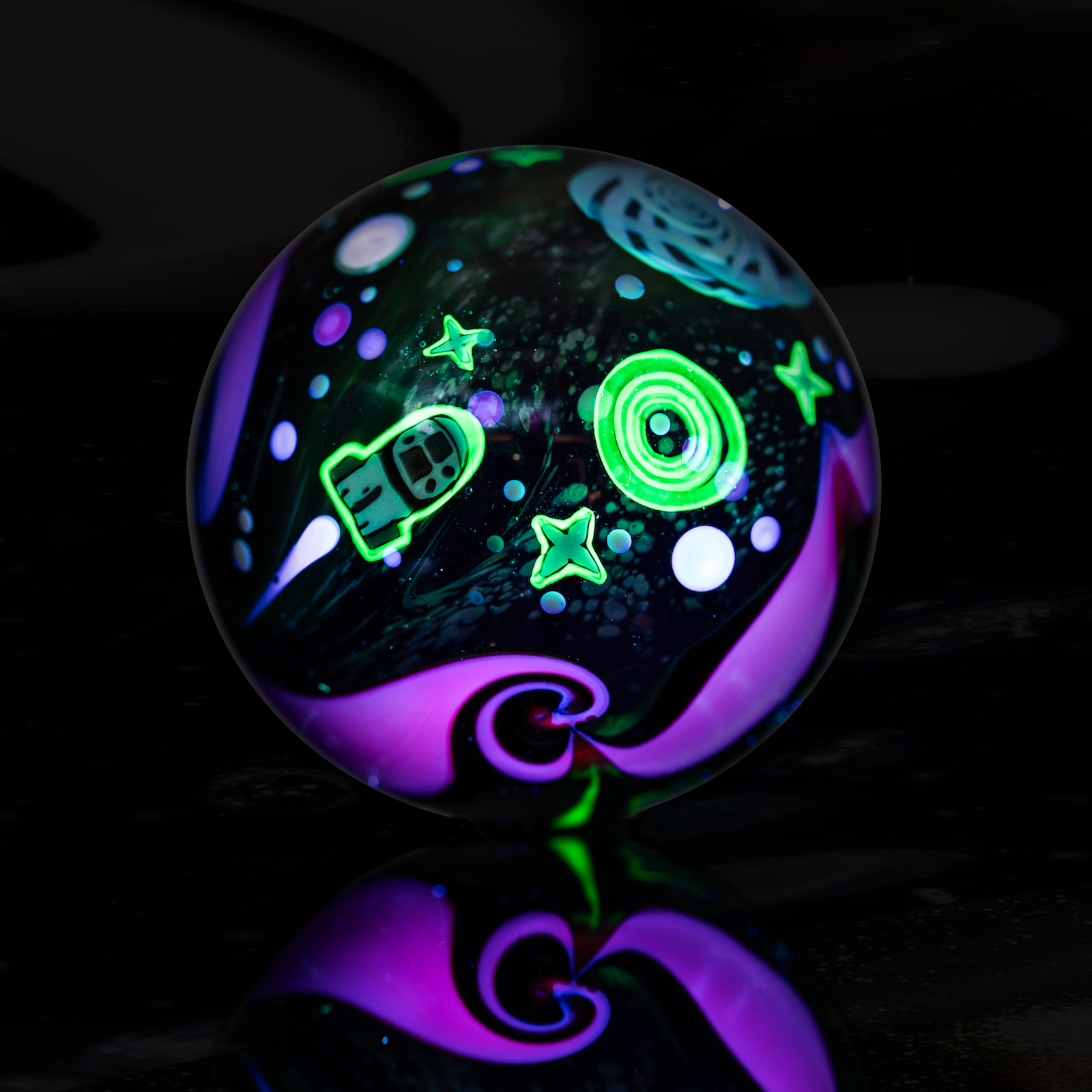 A @SpaceX Dragon Capsule and two UFO's jets past hidden UV stars and galaxies to visit friends and family on the otherside of a Retti Wormhole (the kids just call 'em 'Wormies' tho). On the dark side of the mib, four friendly UFO's meet up for a few games of intergalactic bowling.