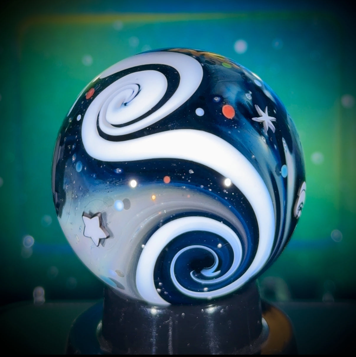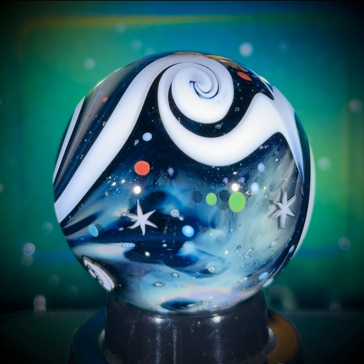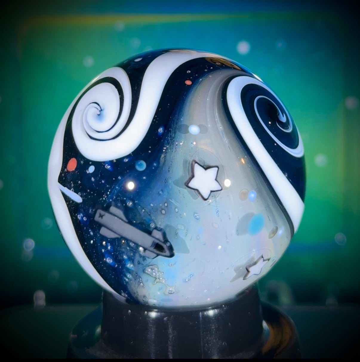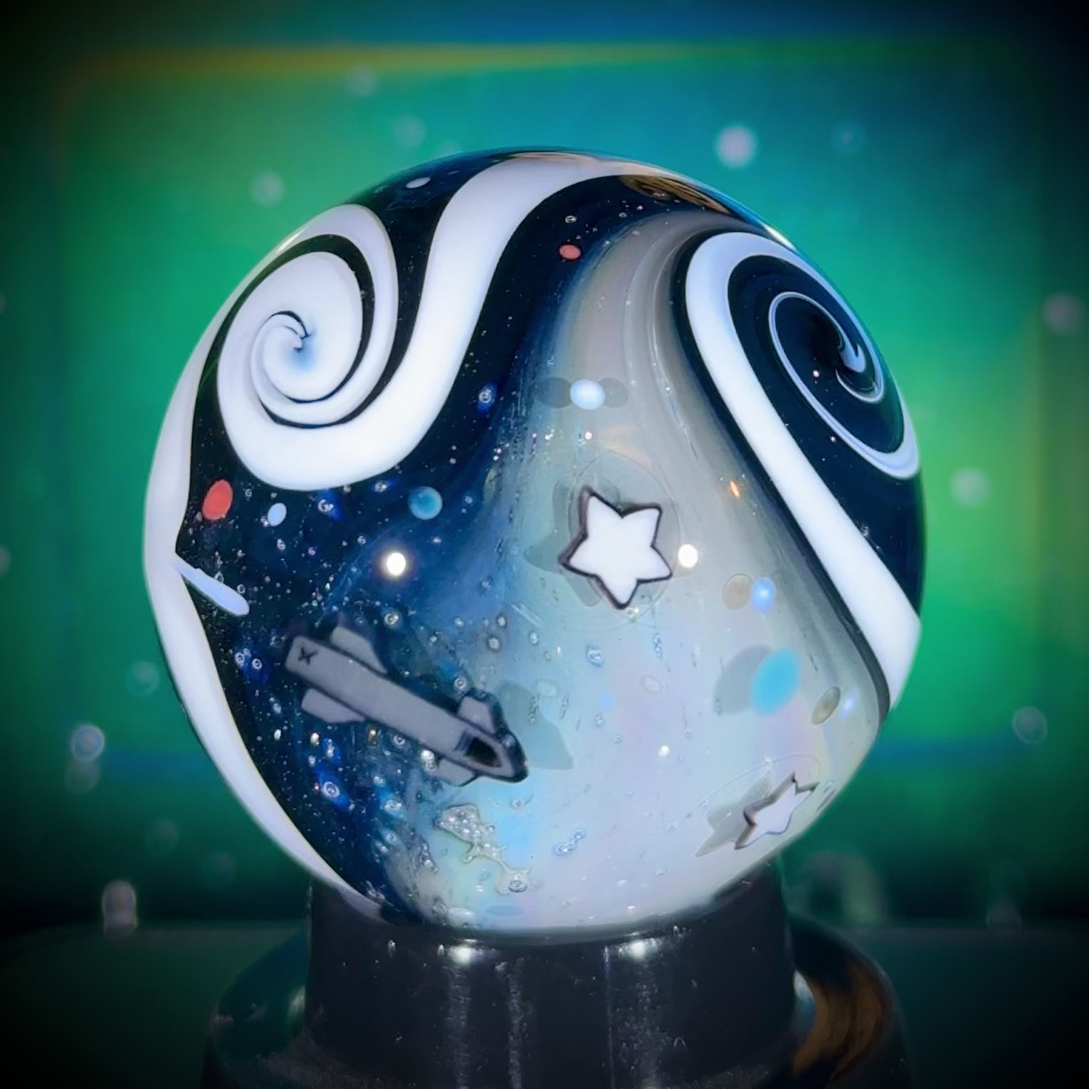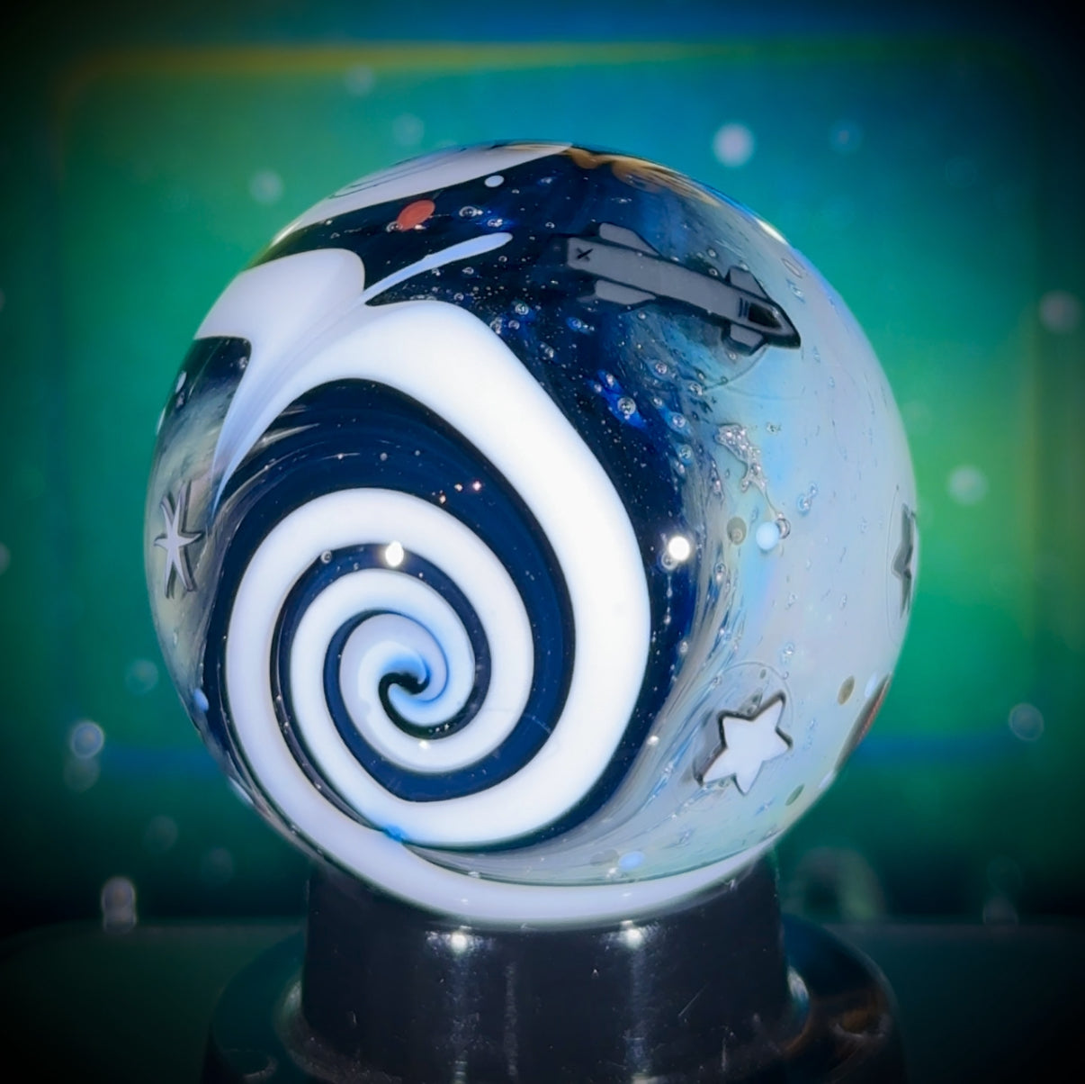 This is the first NU-Classic Series marble featuring my new all-silver Project: Deep Space background detail (full blog writeup here). This one measures in at 39mm, and one side includes a SpaceX Starship rocket blasting thru the silvery skies and the other side includes a UFO with an Electrum Sparkle exhaust trail over a sparkling galaxy black background. The two sides are separated by a band of spiraling Lotus White spirals. Signed N8-NU26 and includes a floating display box, acrylic stand, cleaning cloth, and stickers.