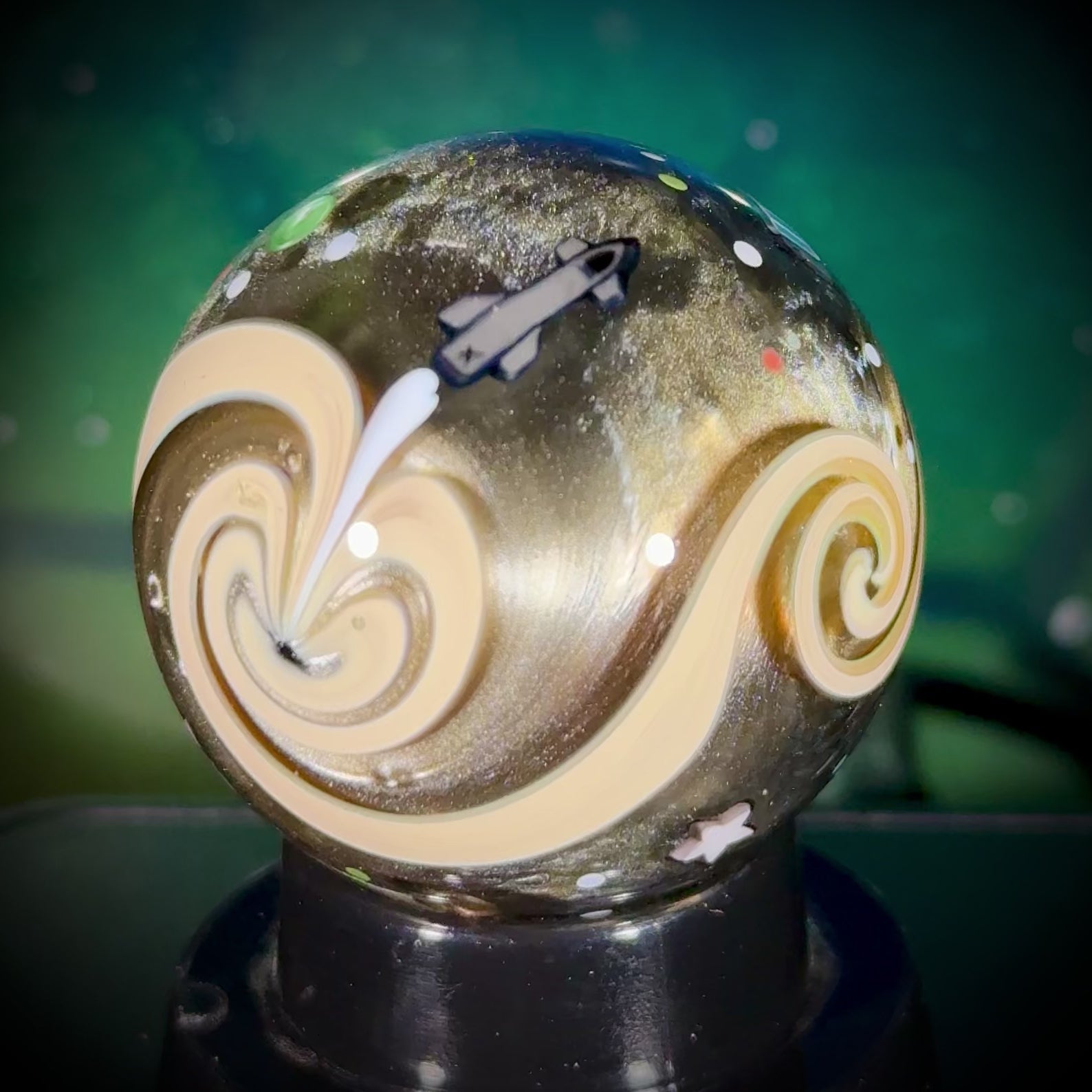 The core is Electrum Sparkle with Caramel Spiral Banding wrapping the surface—capturing that swirling gas giant atmosphere. Stars, UFOs, and Starships orbit the piece, and four surface sparkle dots represent the major moons: Io, Europa, Ganymede, and Callisto.