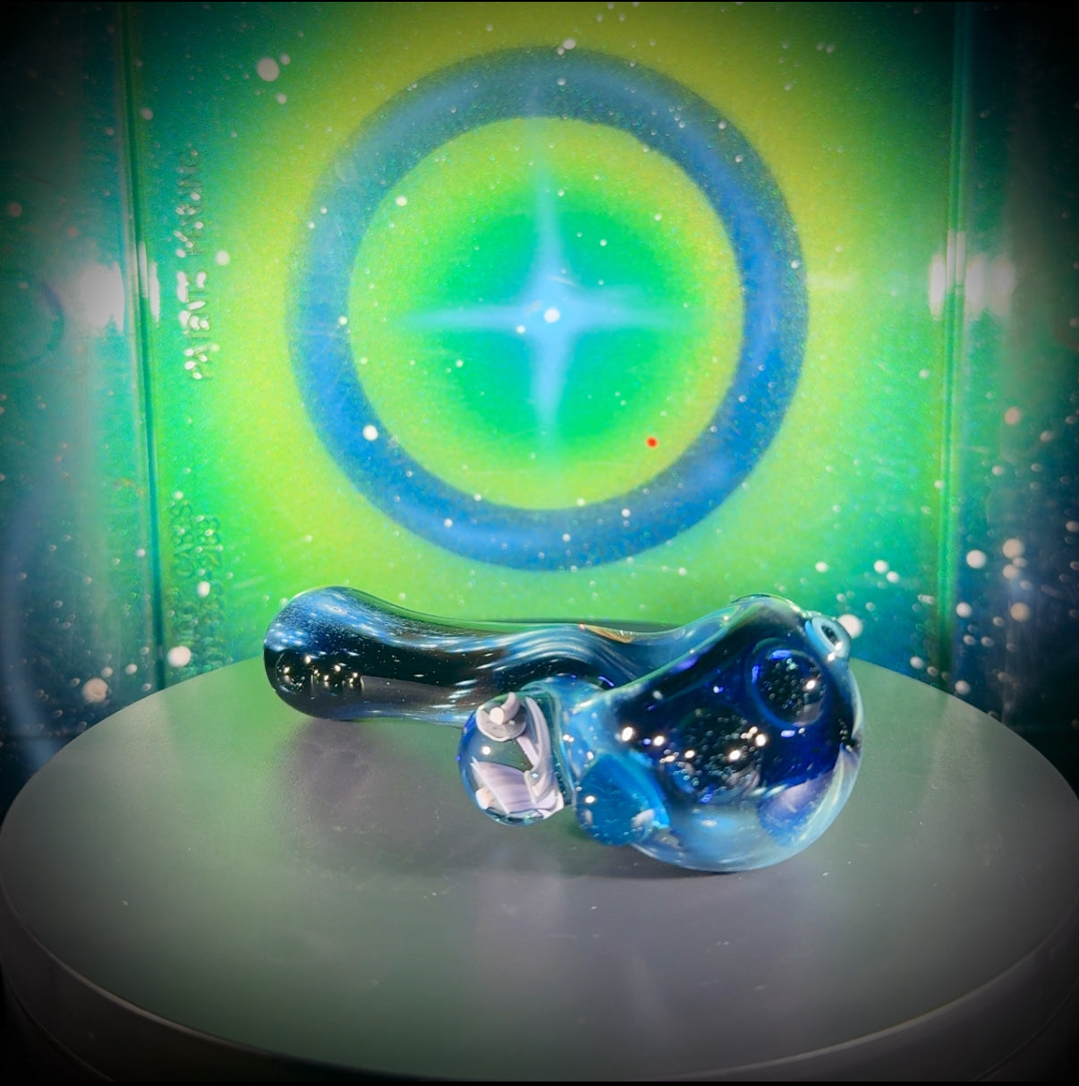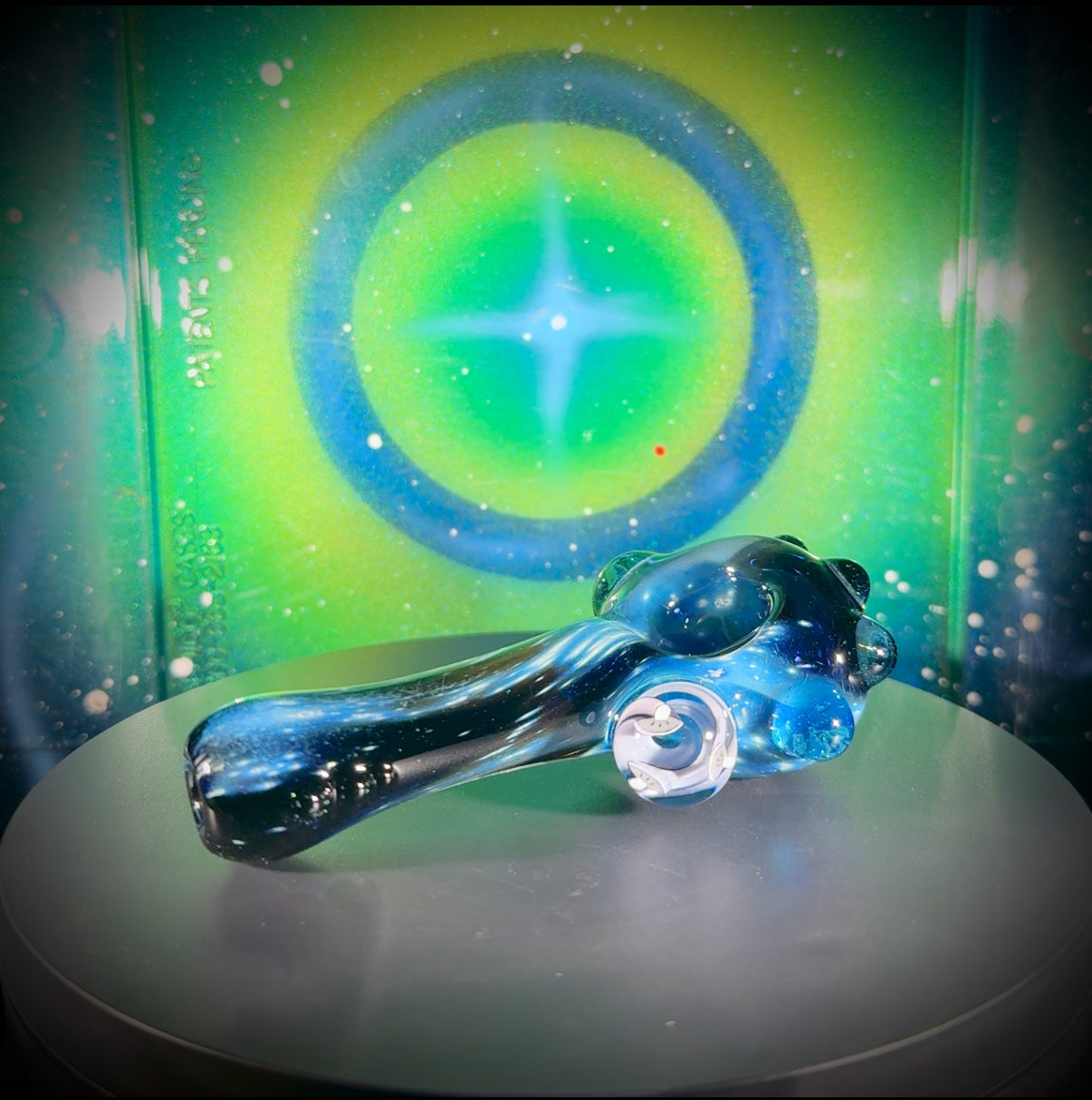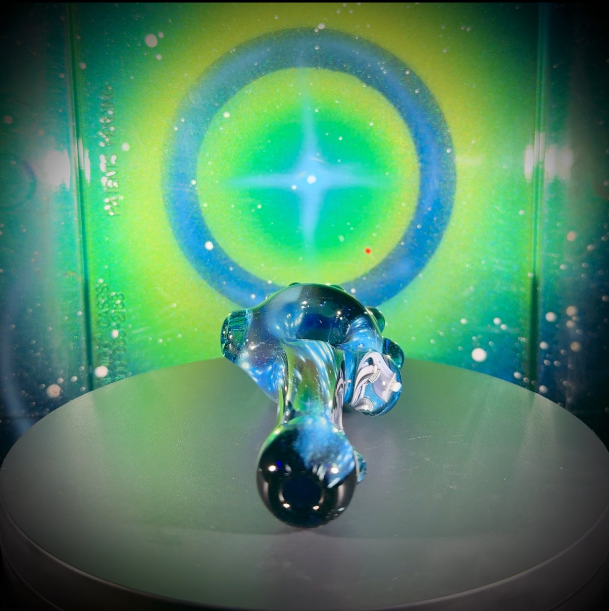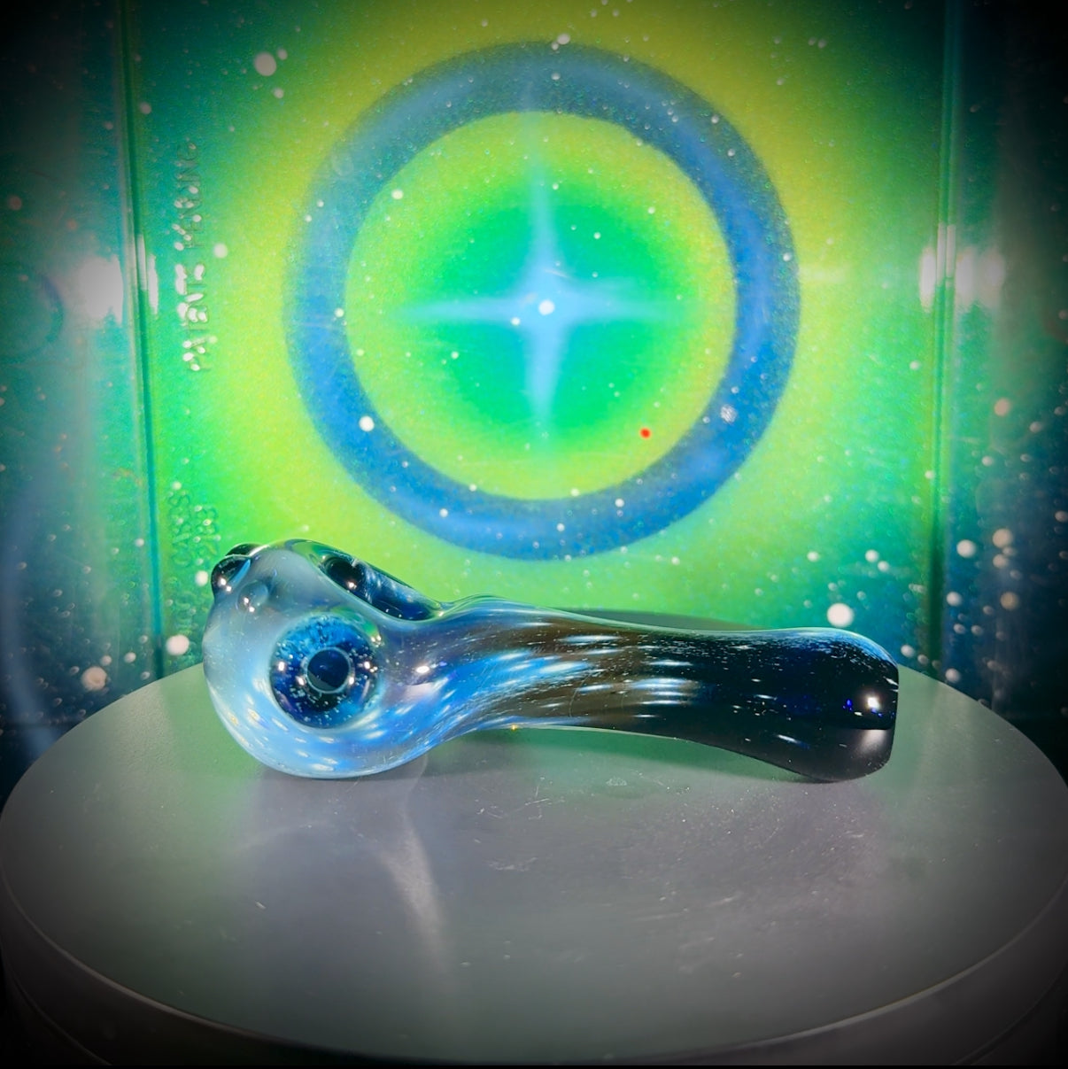 NEW Solo Deep Space Handpipe. 3-spiraling UFO's murrine marble and Atomic Stardust Sparkle (Blue UV) accents and carb.