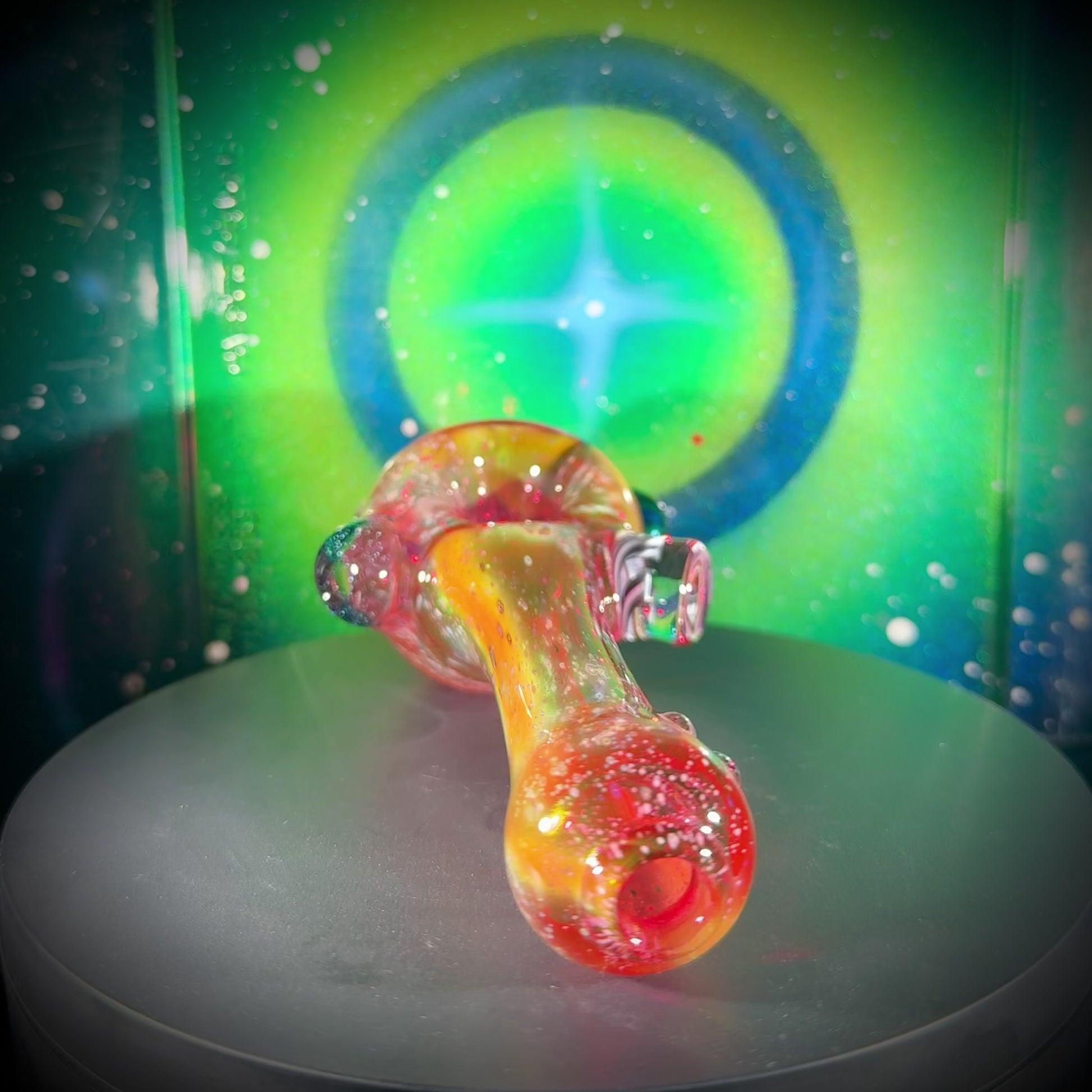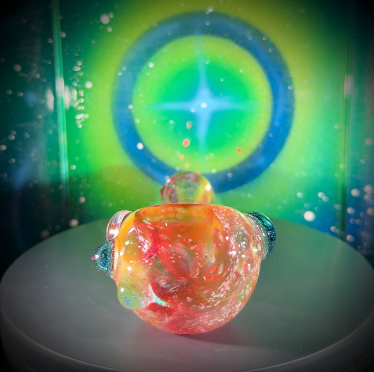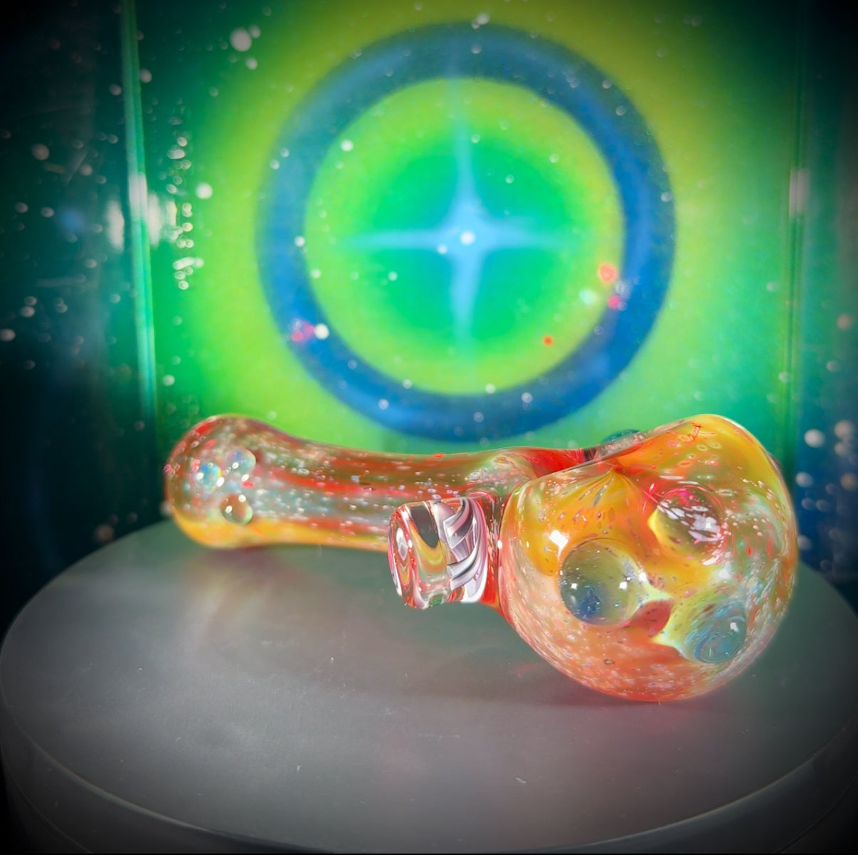 NEW Solo Race2Space Handpipe on a Gold Ruby backing. 3-spiraling UFO's murrine marble and Atomic Stardust Sparkle (Blue UV) accents and carb.