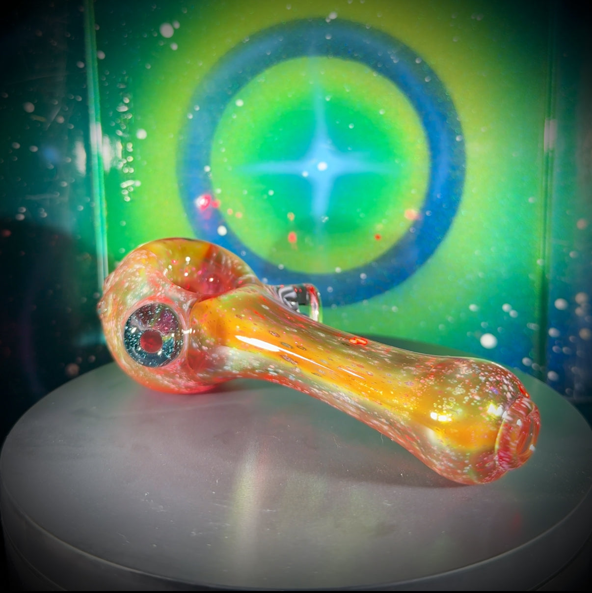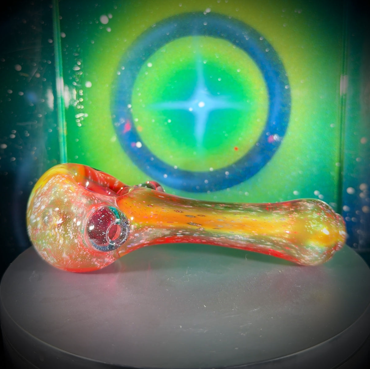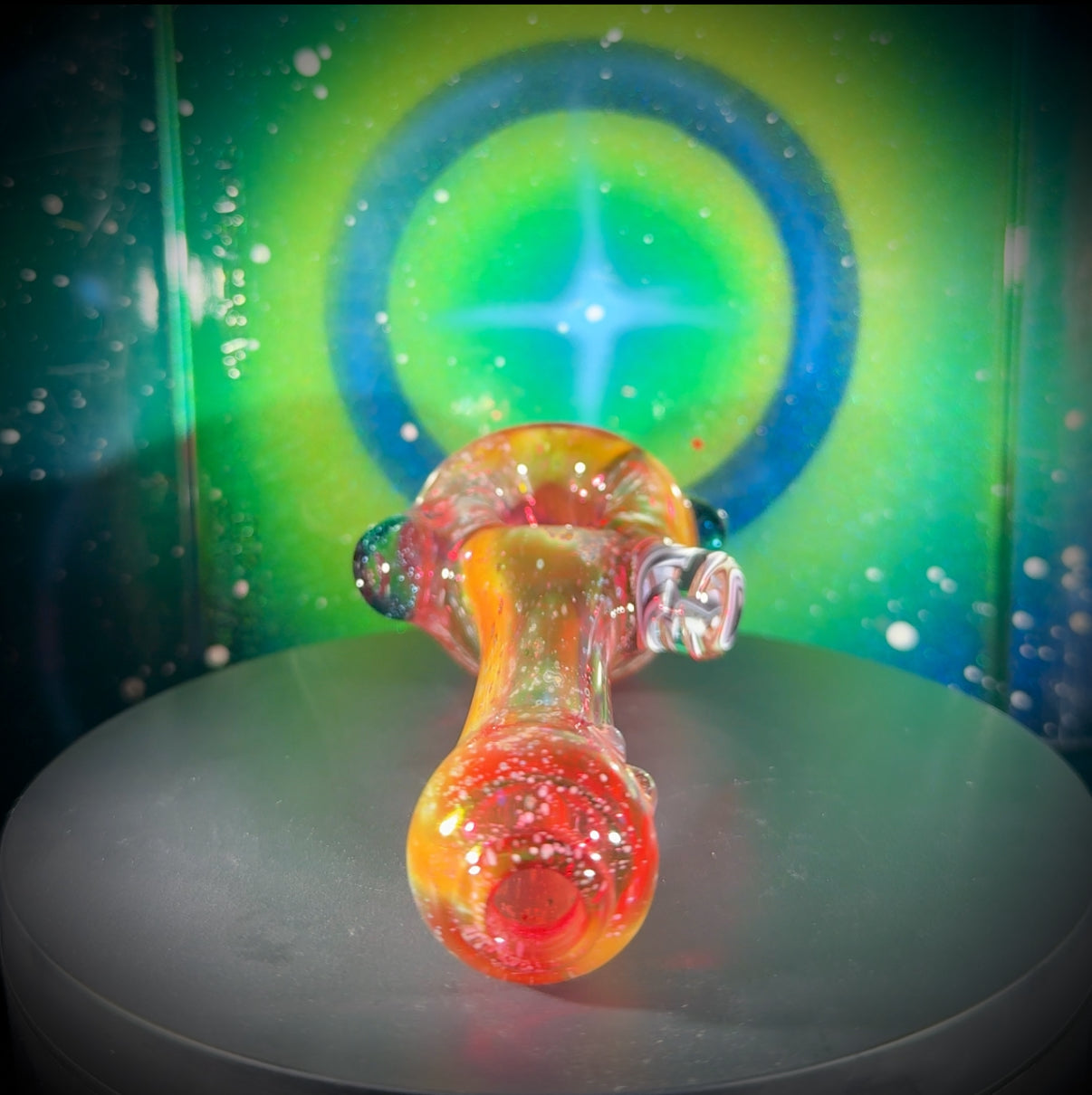 NEW Solo Race2Space Handpipe on a Gold Ruby backing. 3-spiraling UFO's murrine marble and Atomic Stardust Sparkle (Blue UV) accents and carb.