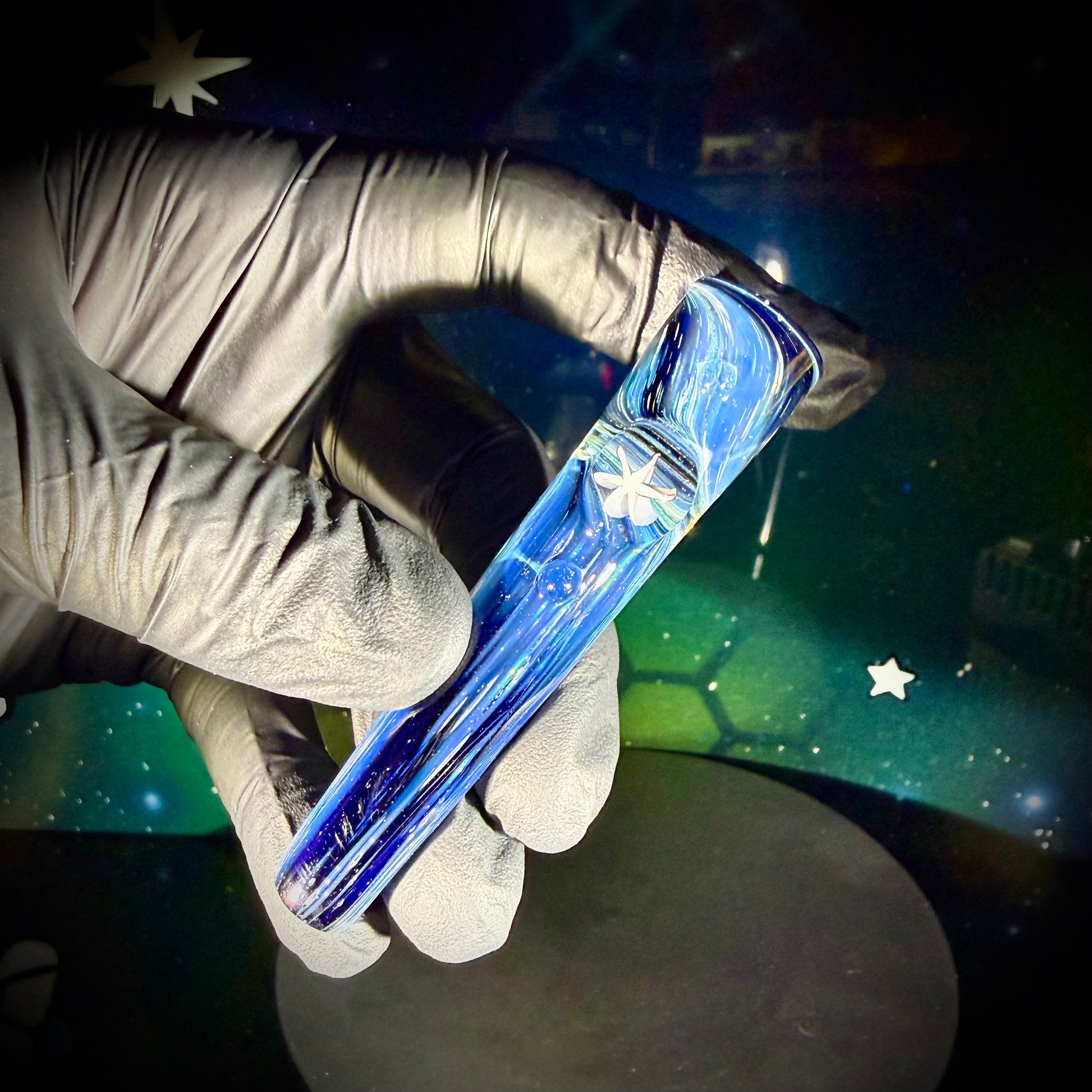 Made with N8's newer Deep Space all-silver fume, a 6-pointed star murrine marble and a few smaller Atomic Stardust (Blue UV) accent marbles.