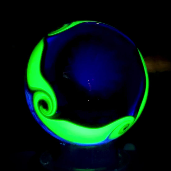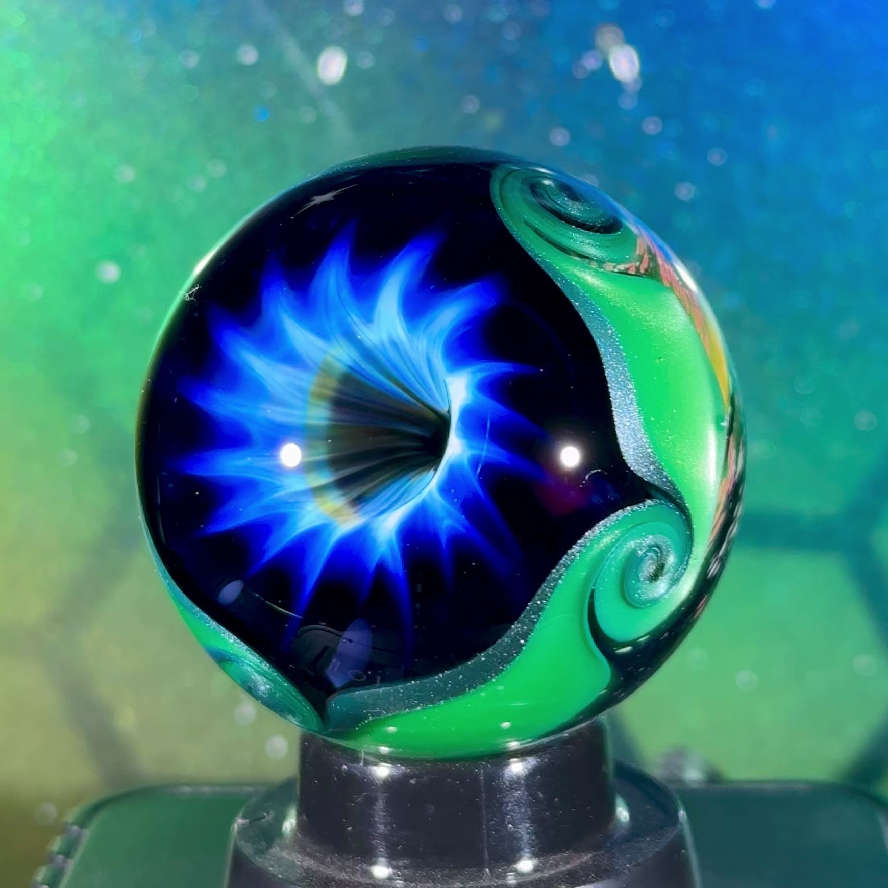 This beautiful Swank x N8 collaboration marble features Swank's intense blue fume vortex going deep into the marble, and N8's signature classic space style with silver/gold fuming, UFO, Dragon Capsule, and stars/planets and hidden UV decorate the backside over a galaxy black sparkle (with a secret layer of Blue-UV). A band of Neptunium Sparkle pinwheels with Ion bands nicely around the equator of the marble.